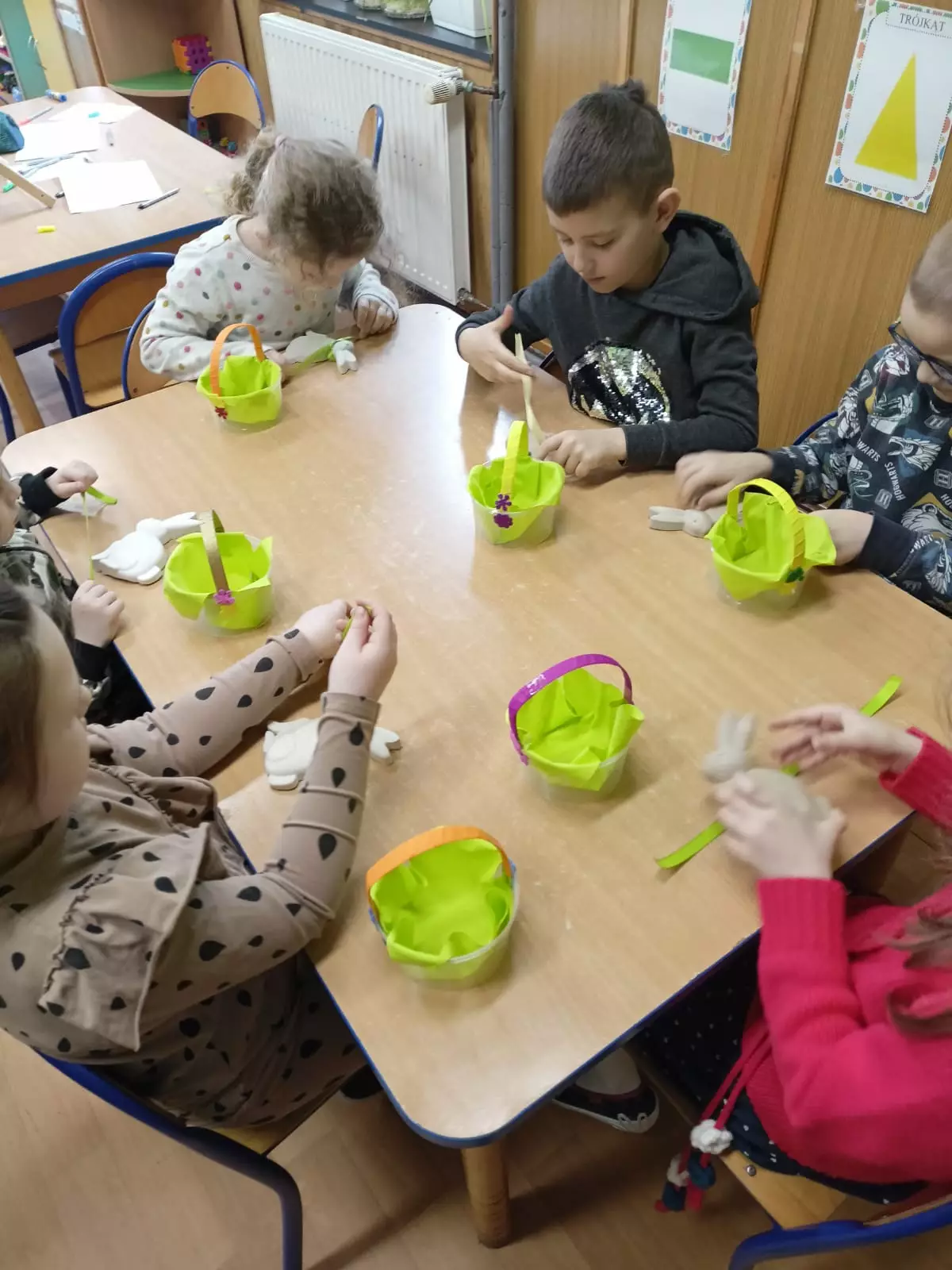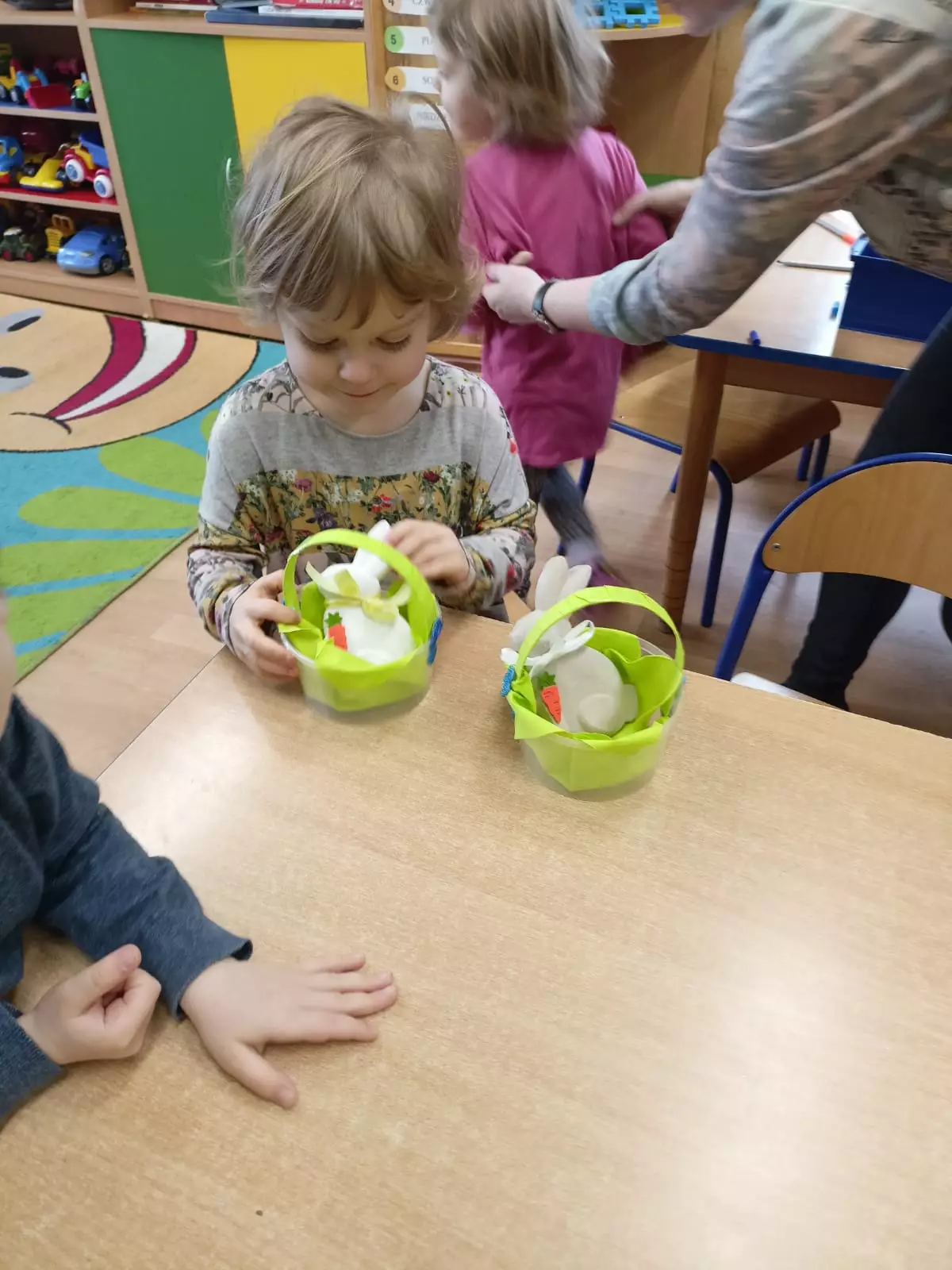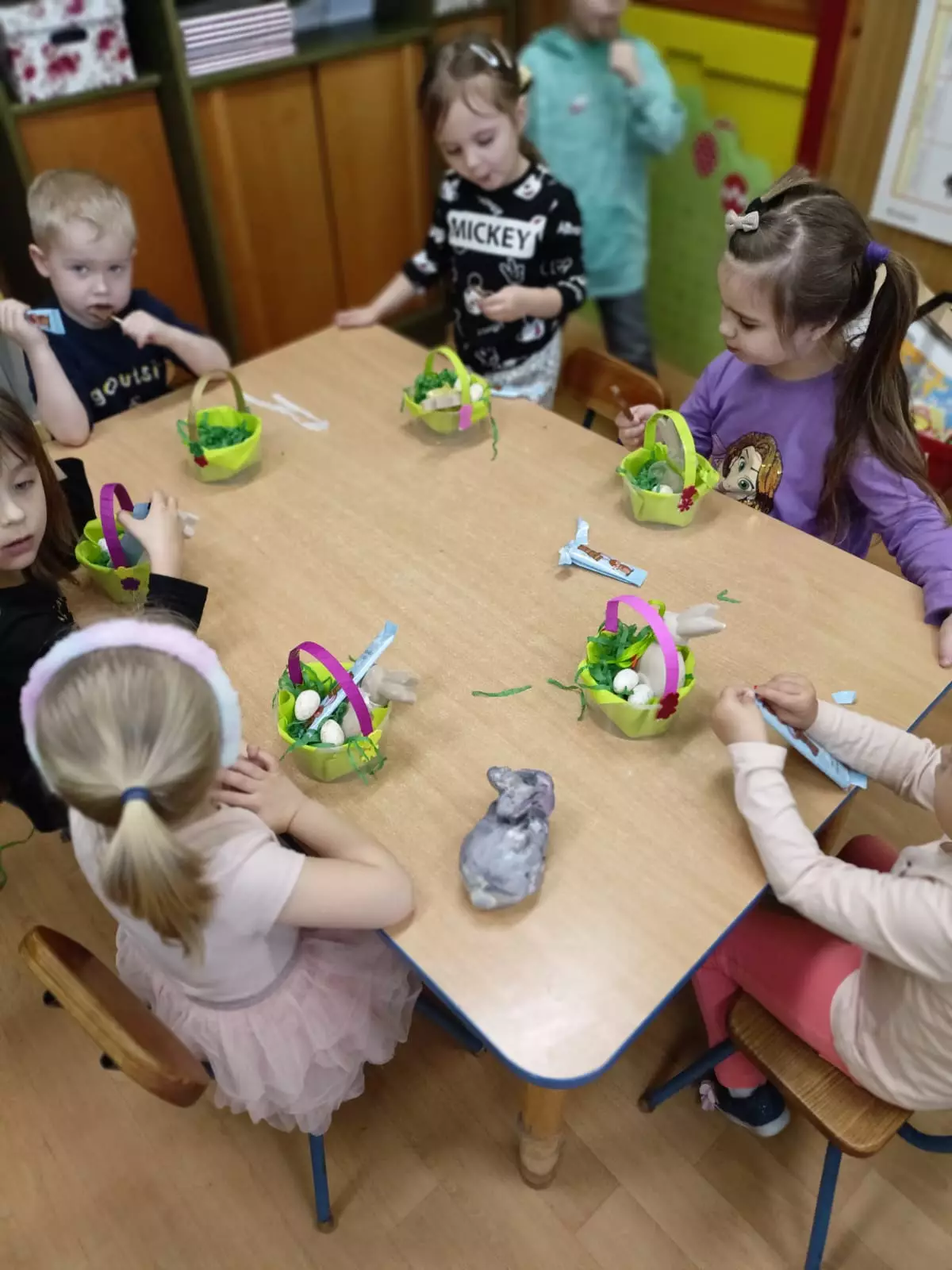 Po nagrodach przyszedł czas na zajęcia literacko-plastyczne. Opowiadanie "Idzie wiosna, Wielkanoc tuż, tuż... ", przestawione w formie teatrzyku obrazkowego Kamishibai, było tematem do wspólnych rozmów z dziećmi o tradycjach związanych z Wielką Nocą. Przedszkolaki wykonały kolorowy koszyczek, w którym zagościł wielkanocny zajączek.
