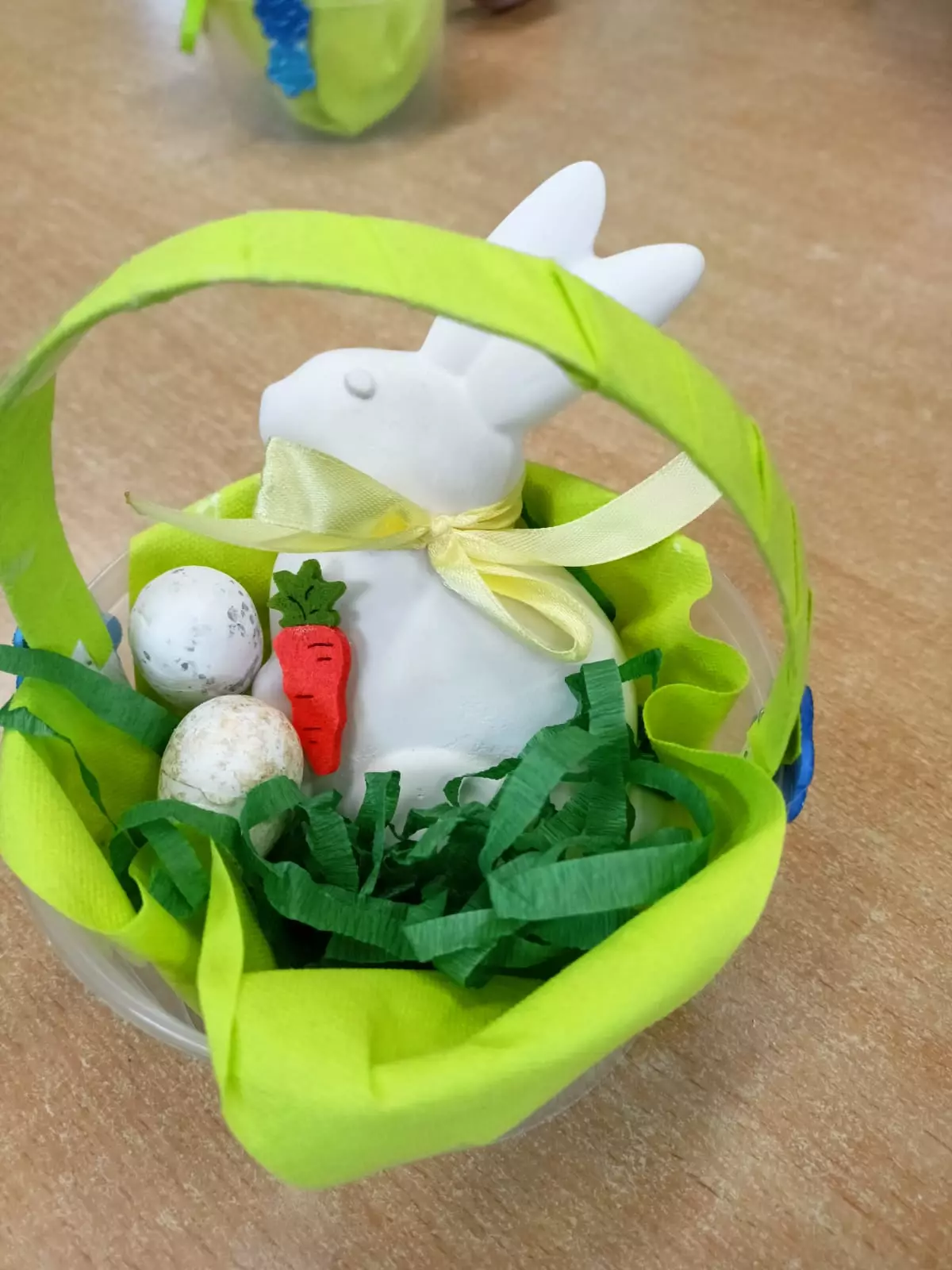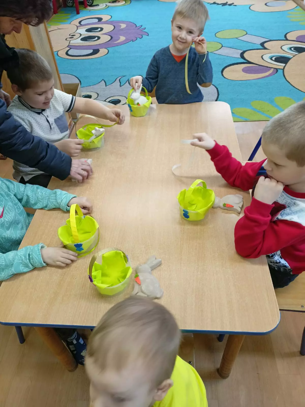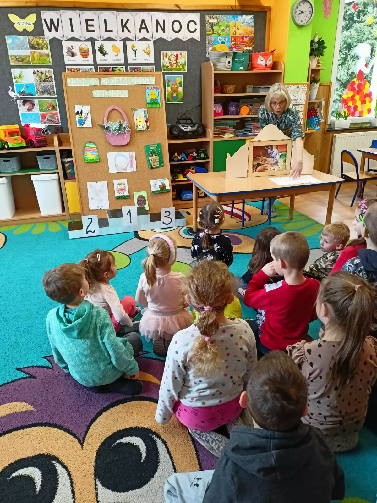 Po nagrodach przyszedł czas na zajęcia literacko-plastyczne. Opowiadanie "Idzie wiosna, Wielkanoc tuż, tuż... ", przestawione w formie teatrzyku obrazkowego Kamishibai, było tematem do wspólnych rozmów z dziećmi o tradycjach związanych z Wielką Nocą. Przedszkolaki wykonały kolorowy koszyczek, w którym zagościł wielkanocny zajączek.