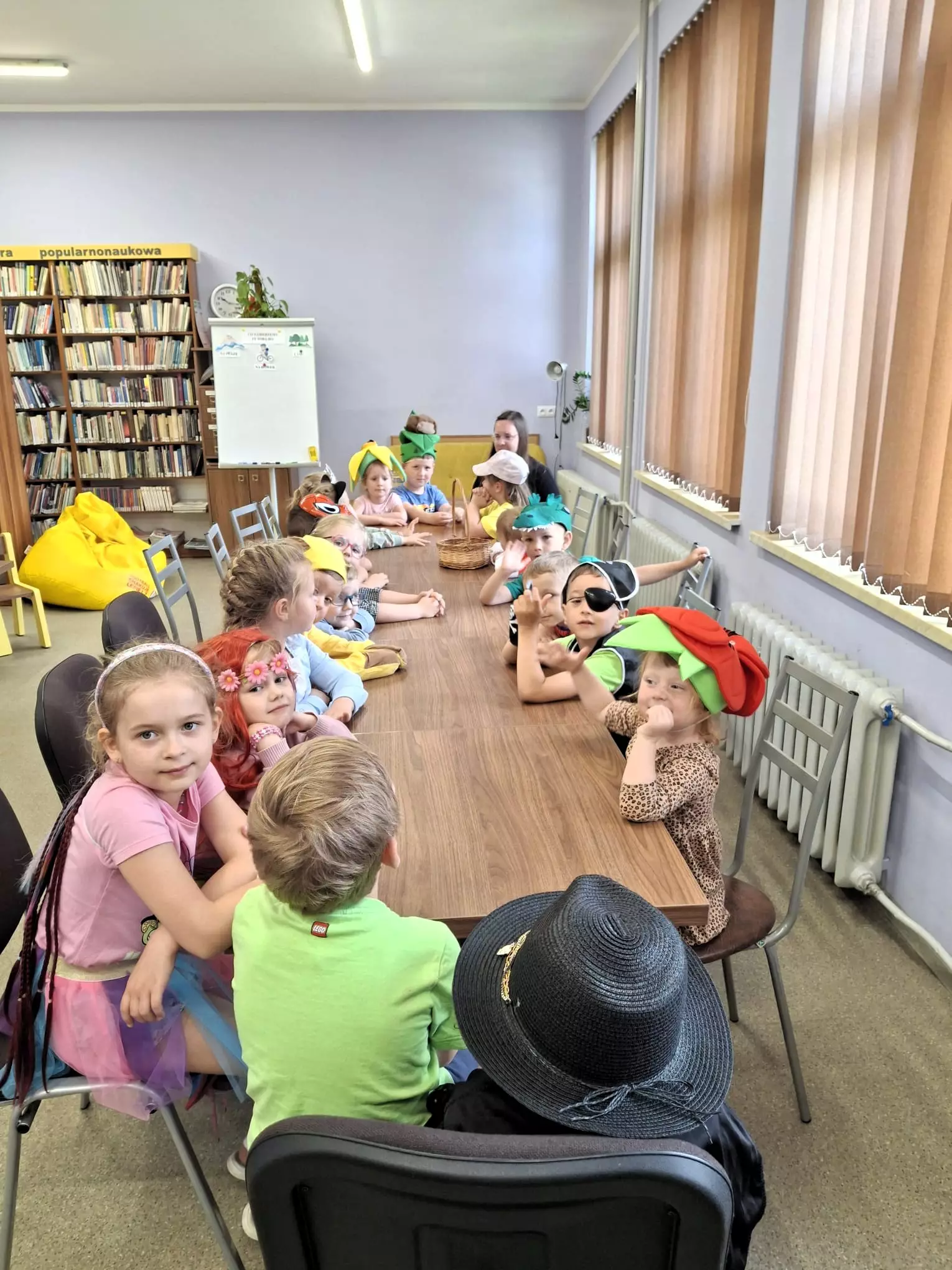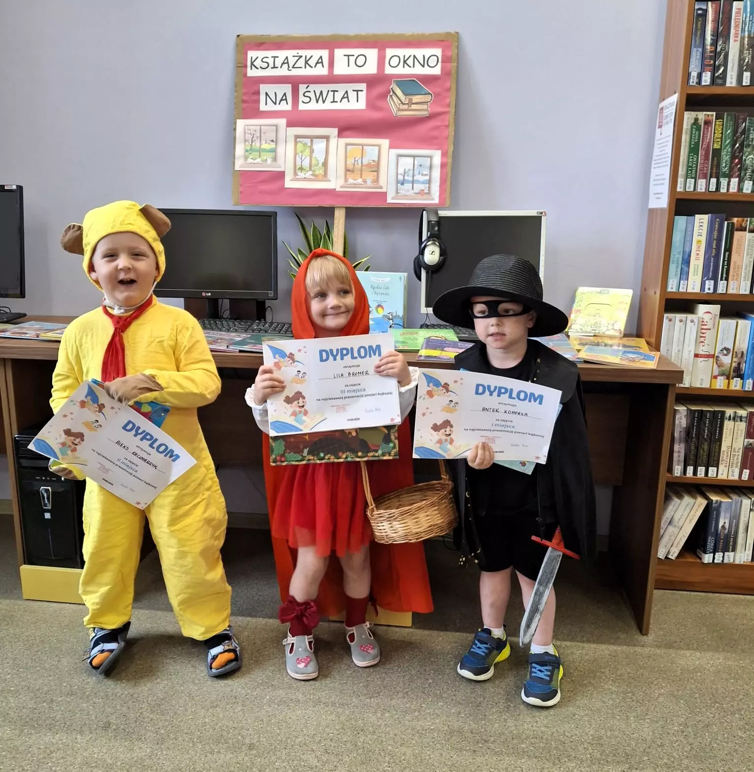 Transparent z napisem Książka to okno na świat.Dzieci siedzą przy stolikach w bibliotece. Mają na sobie kolorowe przebrania bajkowo-literackie.Dzieci siedzą przy stolikach w bibliotece. Mają na sobie kolorowe przebrania bajkowo-literackieTrzech laureatów, którzy wygrali dyplom i książeczkę za najpiękniejszy kostium.Bajkowy korowód.