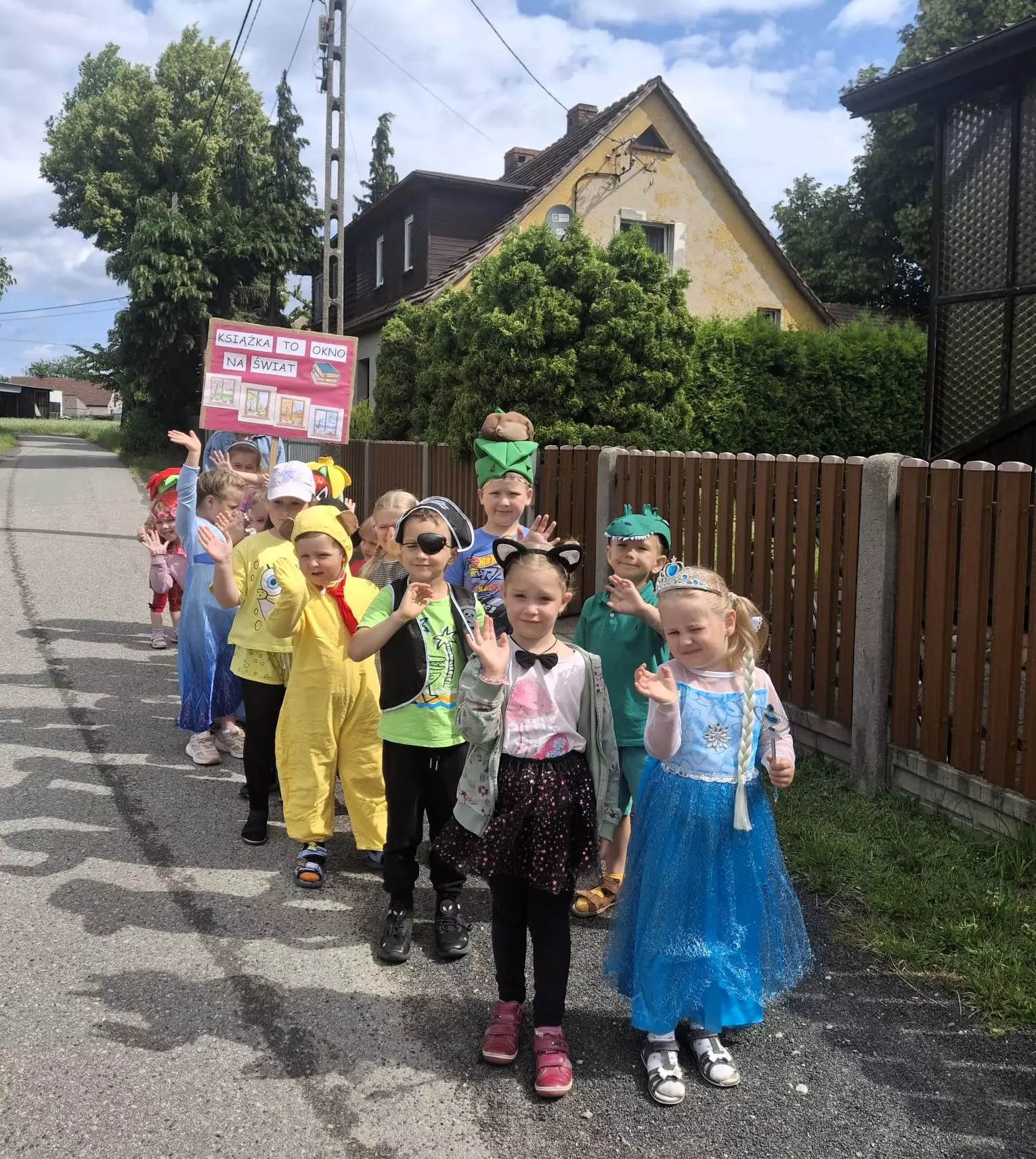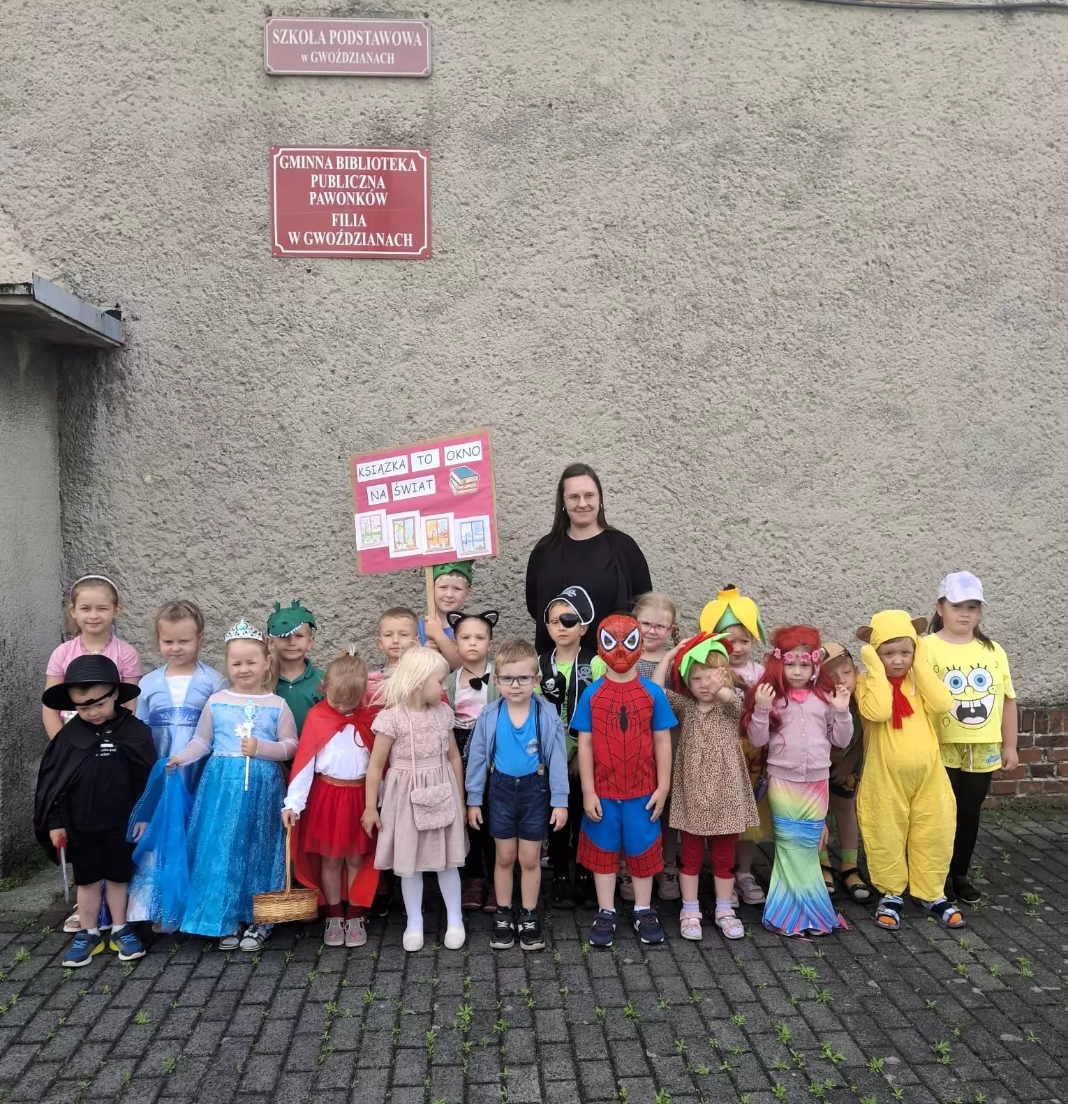 We wtorek, 24 czerwca, naszą bibliotekę w Gwoździanach odwiedziły dzieci z pobliskiego przedszkola. Przyszły do nas w uroczystym korowodzie postaci bajkowych i literackich, niosąc transparent z pięknym hasłem: „Książka to okno na świat”.