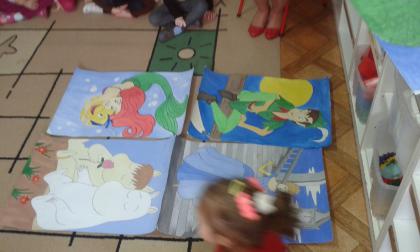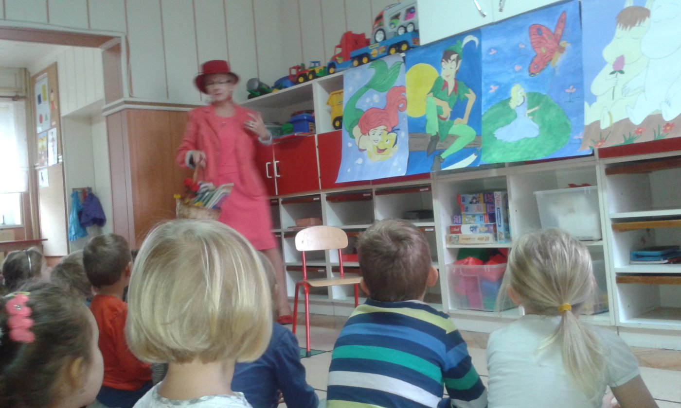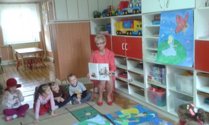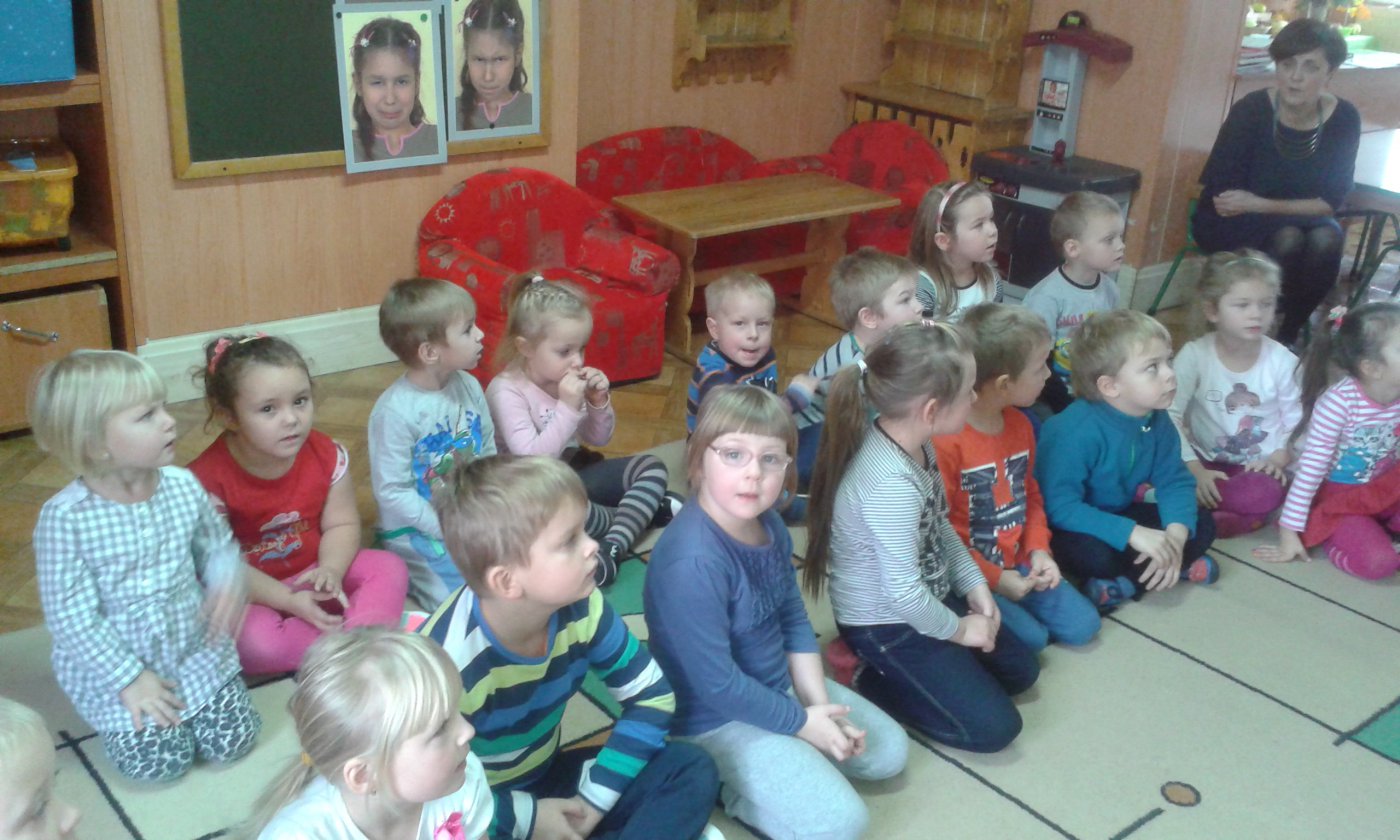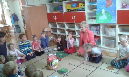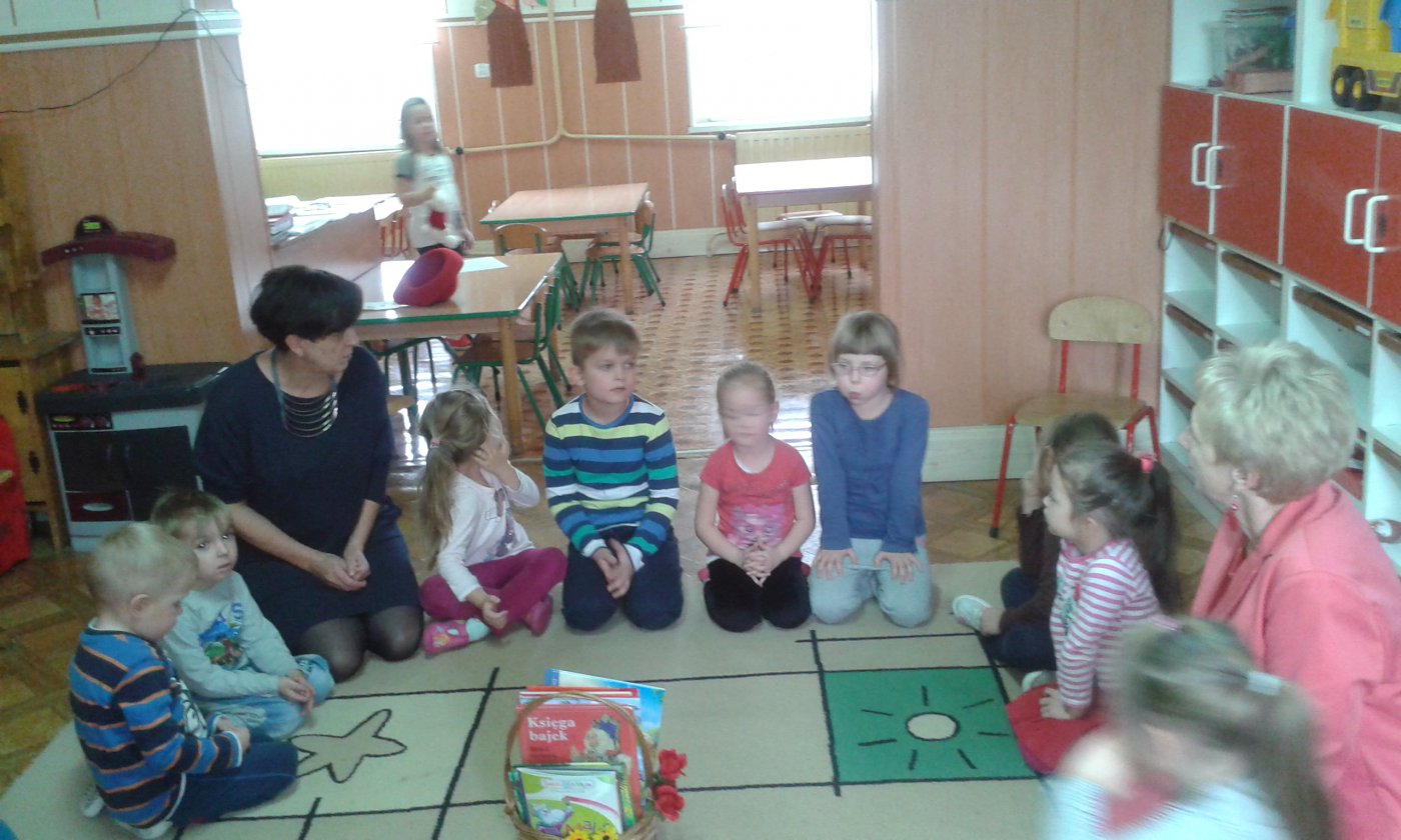 Podczas czytania przez bibliotekarkę Jadwigę Kukowka scenariusza bajki pt.: "Czerwony Kapturek" przedszkolaki wcielały się w postacie: Myśliwego, Babci, Czerwonego Kapturka oraz wilka. Wspólnej zabawie towarzyszył dobry humor i uśmiech. Na zakończenie spotkania dzieci pokolorowały obrazki, które można podziwiać w bibliotece.