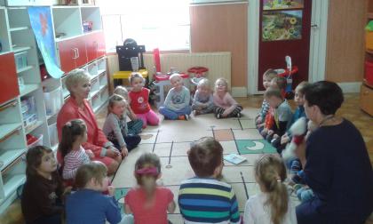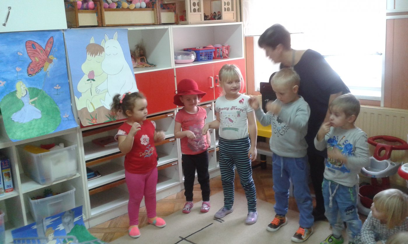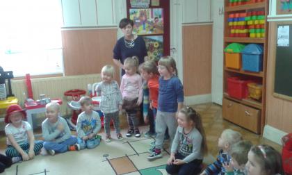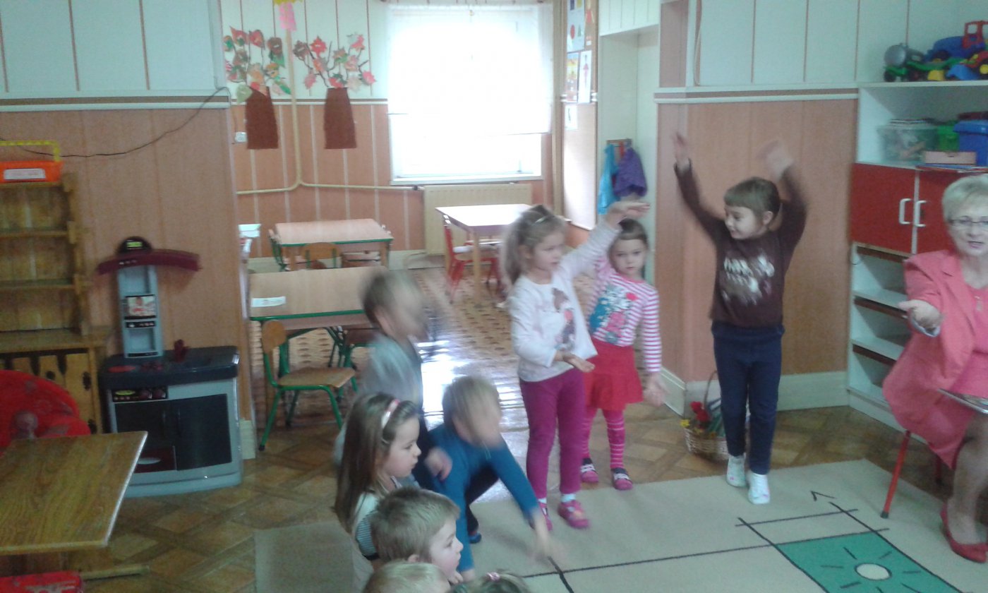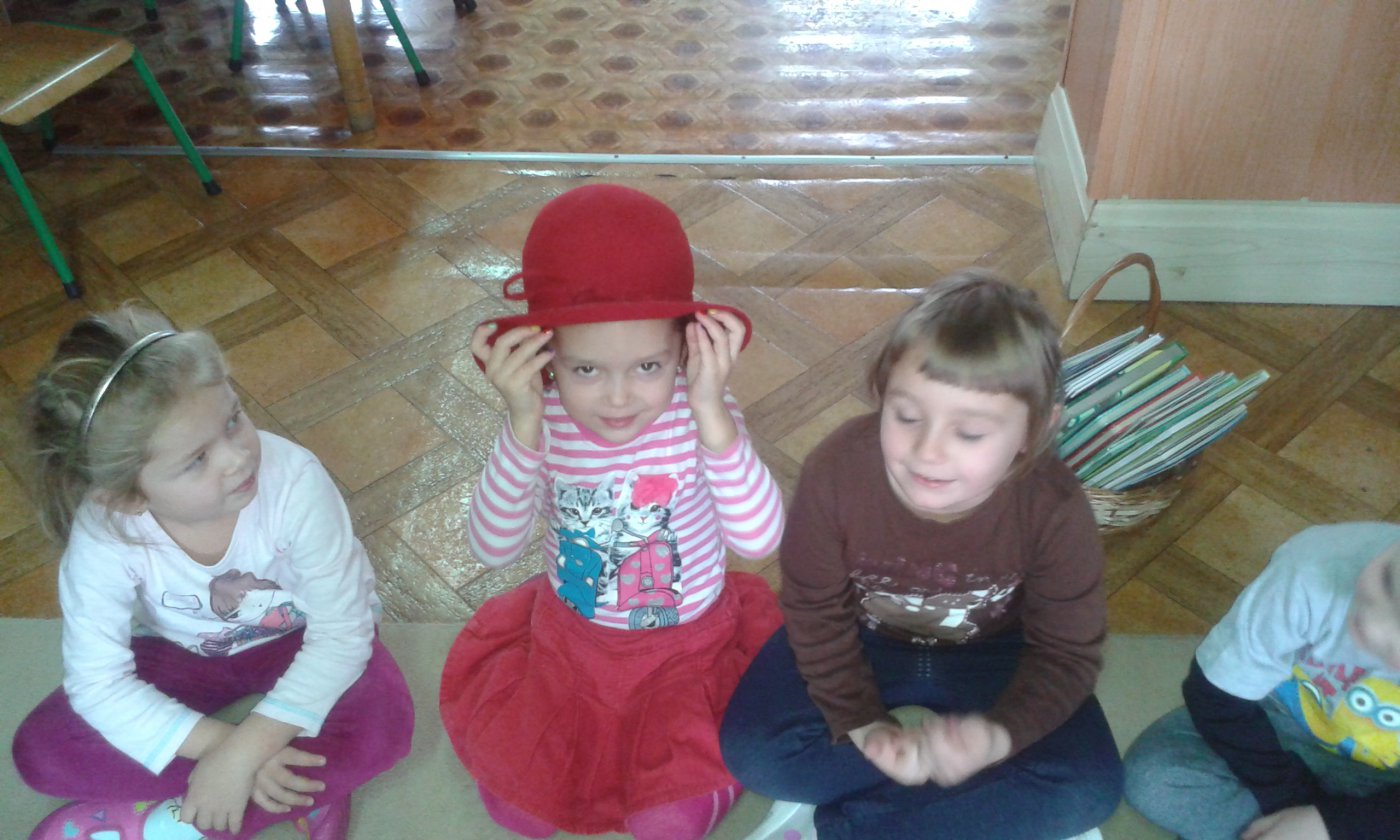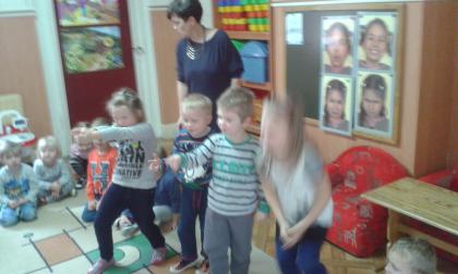 Podczas czytania przez bibliotekarkę Jadwigę Kukowka scenariusza bajki pt.: "Czerwony Kapturek" przedszkolaki wcielały się w postacie: Myśliwego, Babci, Czerwonego Kapturka oraz wilka. Wspólnej zabawie towarzyszył dobry humor i uśmiech. Na zakończenie spotkania dzieci pokolorowały obrazki, które można podziwiać w bibliotece.