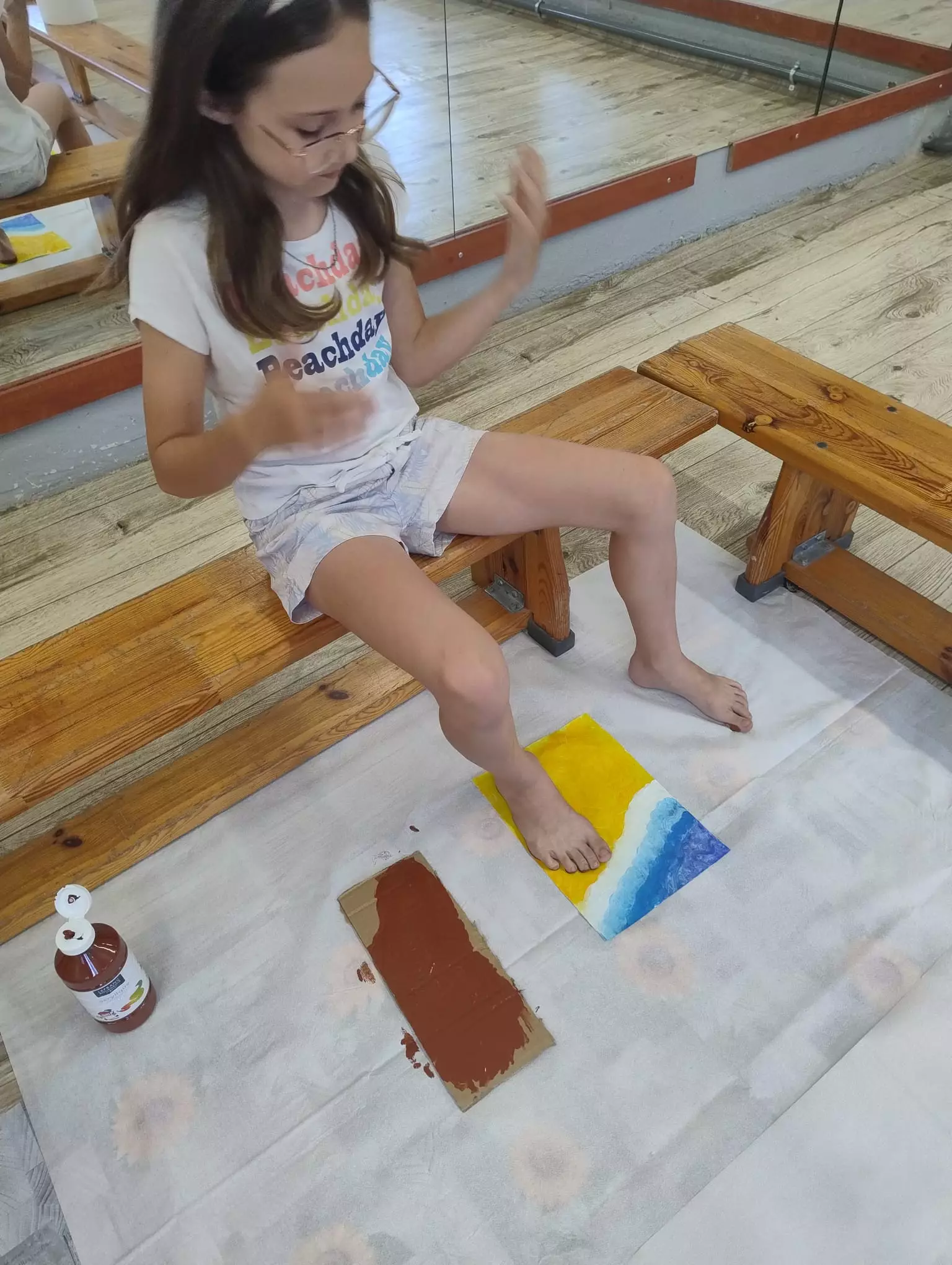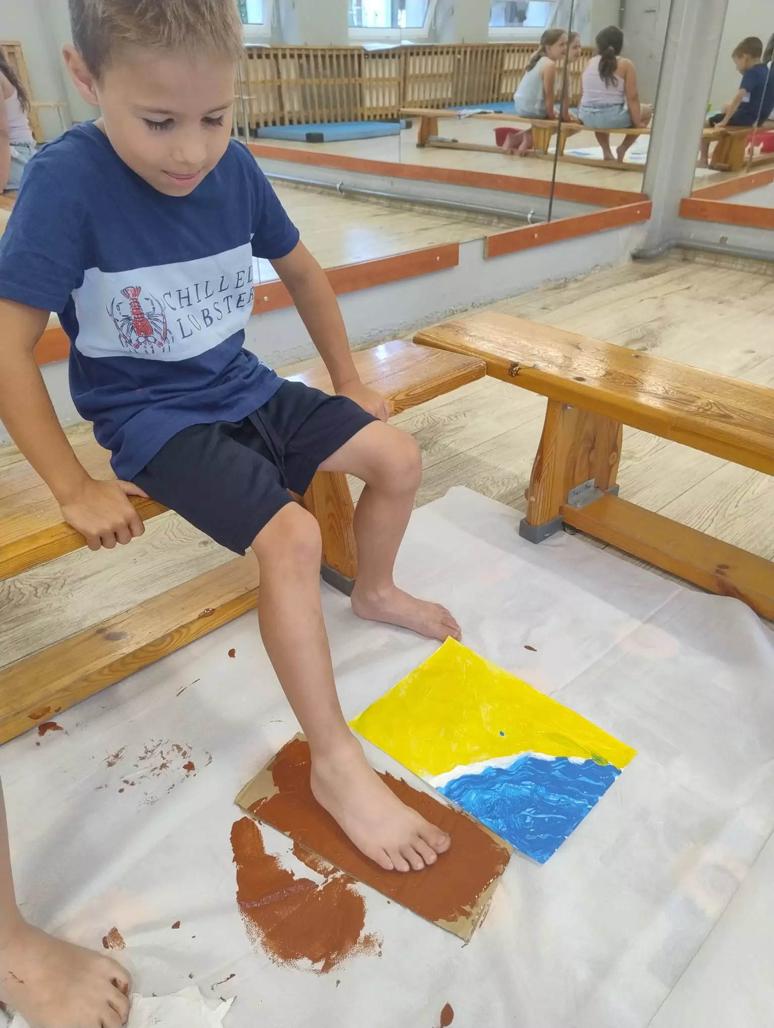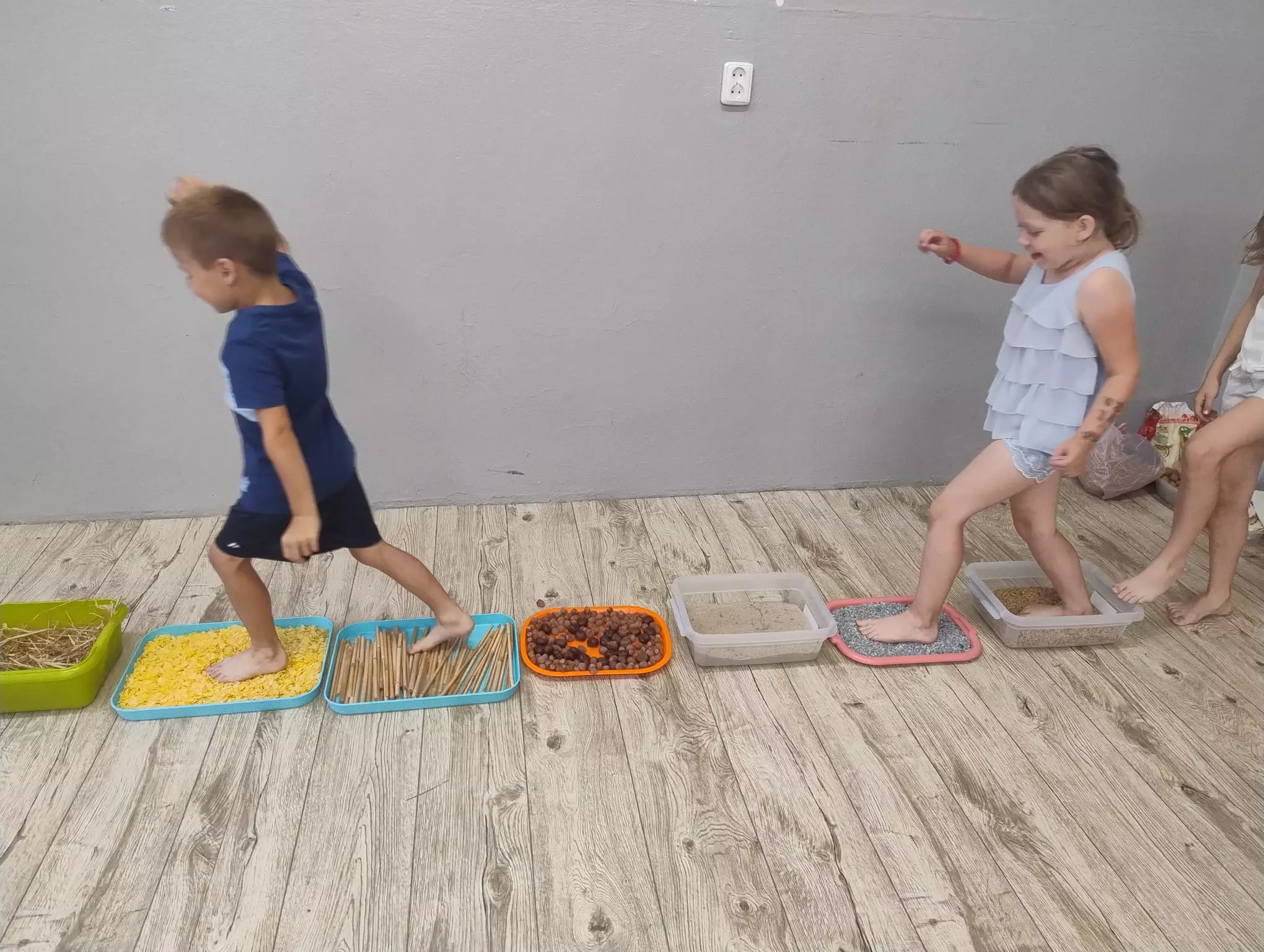 Dziewczynka maluje farbami obrazek wakacyjny.Dziewczynka i chłopczyk malują farbami wakacyjne obrazki.Dzieci malują farbami wakacyjne obrazki.Dziewczynka i chłopczyk malują farbami wakacyjne obrazki.Dzieci chodzą po różnych materiałach gołymi stopami.Dzieci chodzą po różnych materiałach gołymi stopami.Chłopczyk odbija stopę pomalowaną farbą na kartce papieru.Dzieci uczą się pisać gołymi stopami.Dzieci wkładają orzechy gołymi stopami do pojemnika.Obrazki namalowane przez dzieci.Dziewczynka odbija pomalowaną stopę na kartkę.