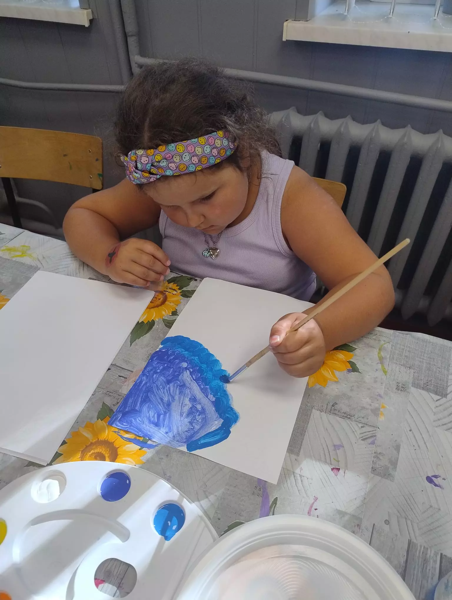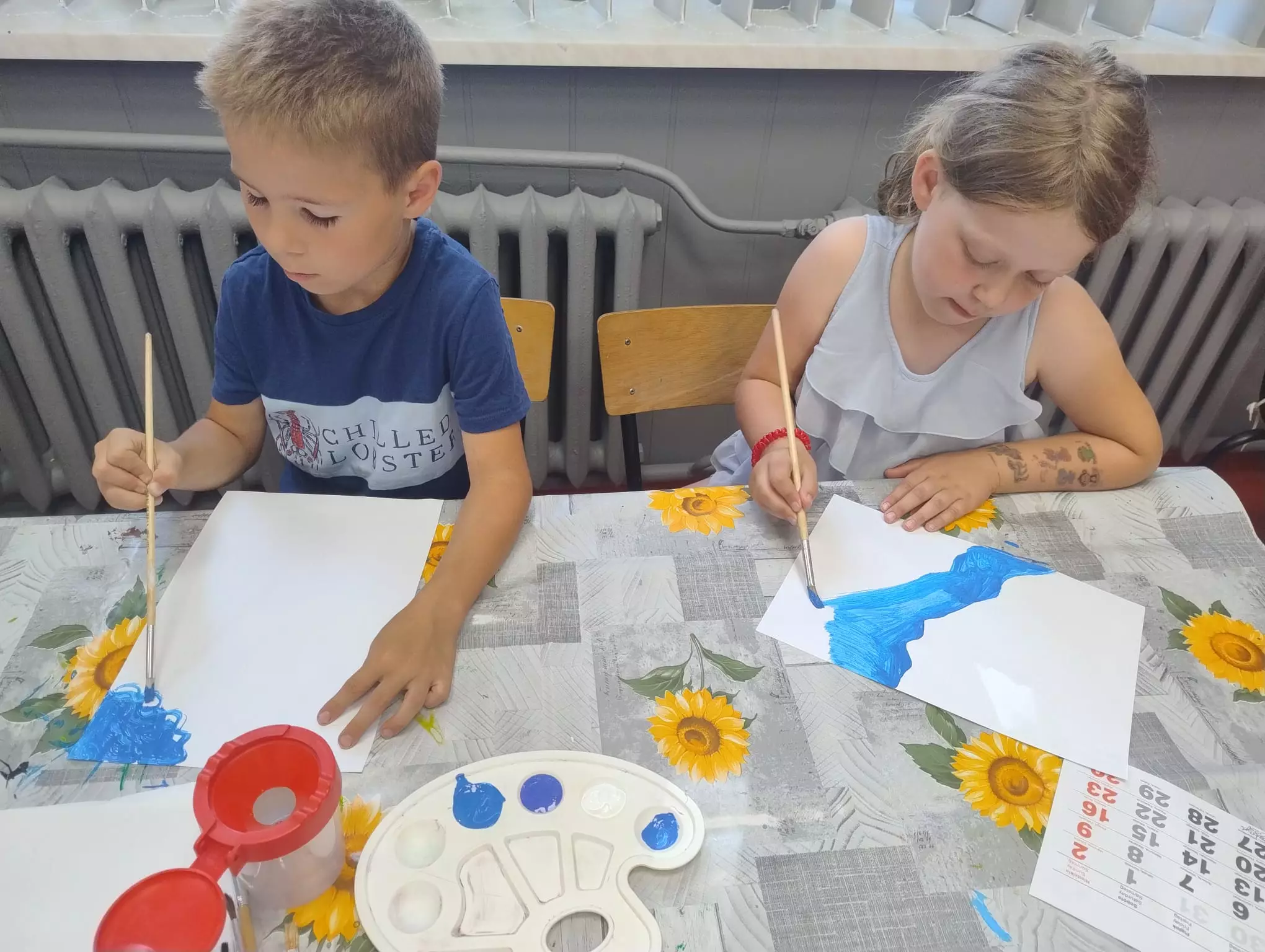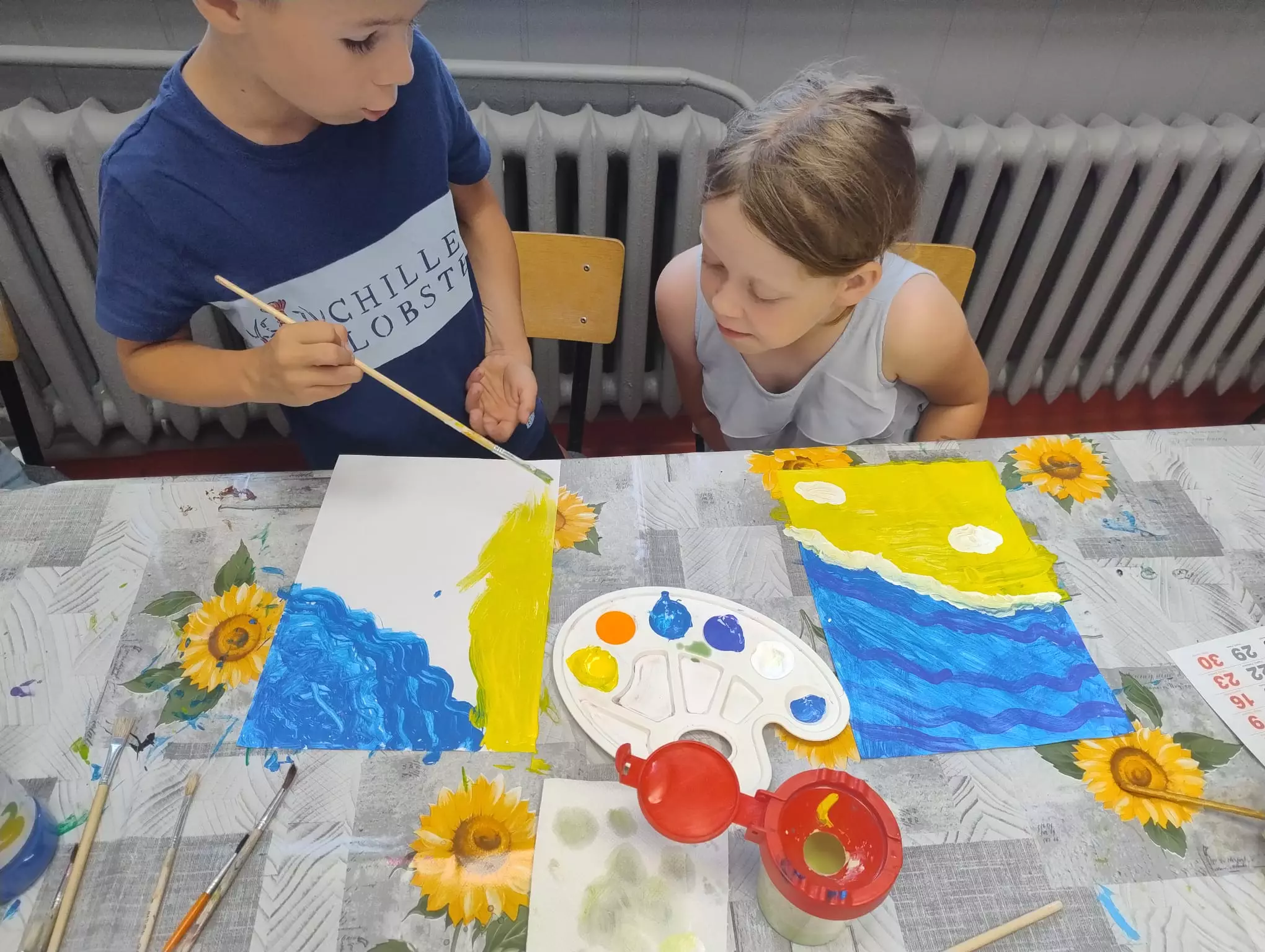 Dziewczynka maluje farbami obrazek wakacyjny.Dziewczynka i chłopczyk malują farbami wakacyjne obrazki.Dzieci malują farbami wakacyjne obrazki.Dziewczynka i chłopczyk malują farbami wakacyjne obrazki.Dzieci chodzą po różnych materiałach gołymi stopami.Dzieci chodzą po różnych materiałach gołymi stopami.Chłopczyk odbija stopę pomalowaną farbą na kartce papieru.Dzieci uczą się pisać gołymi stopami.Dzieci wkładają orzechy gołymi stopami do pojemnika.Obrazki namalowane przez dzieci.Dziewczynka odbija pomalowaną stopę na kartkę.