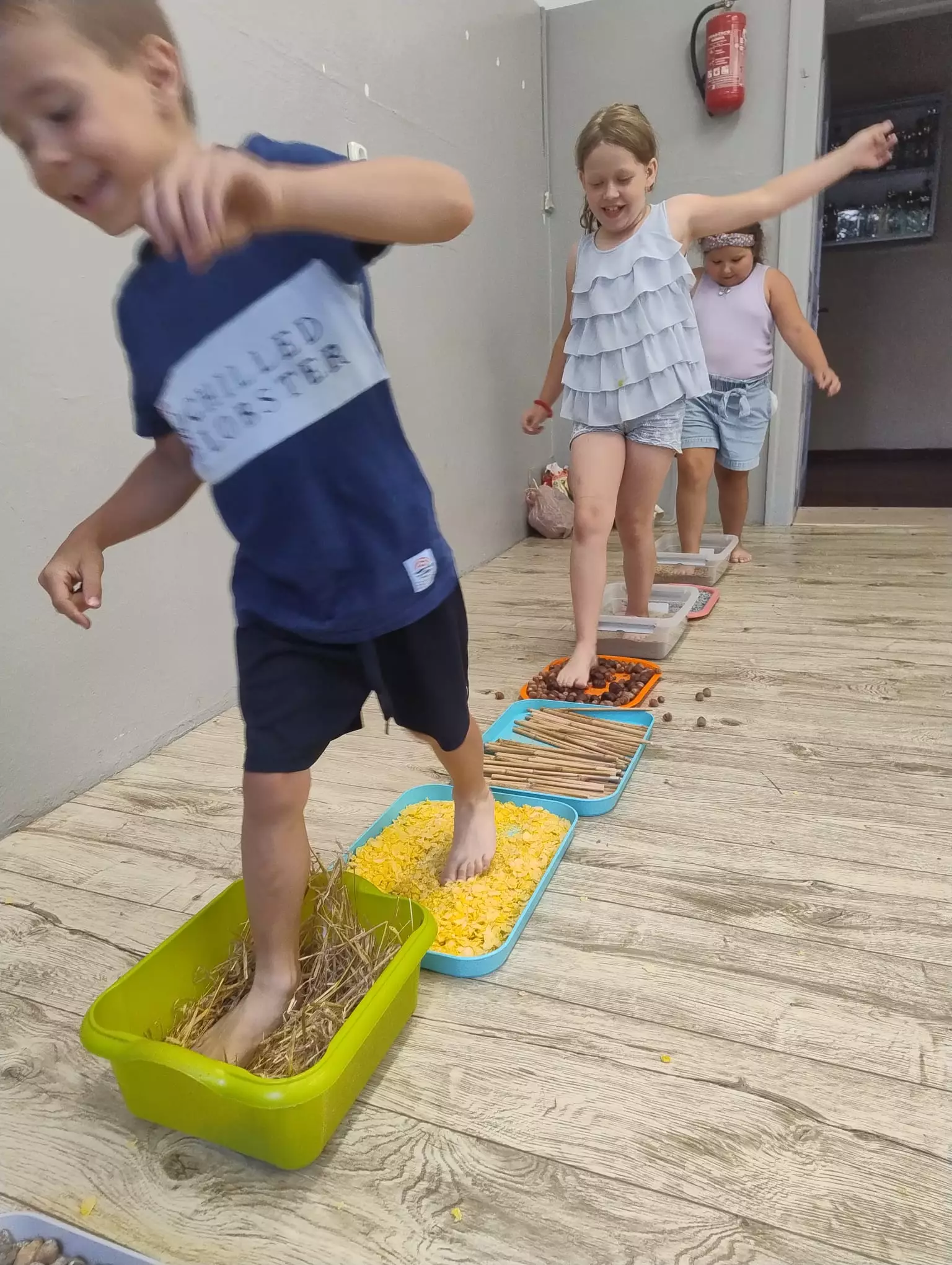Dzieci uczą się pisać gołymi stopami.
