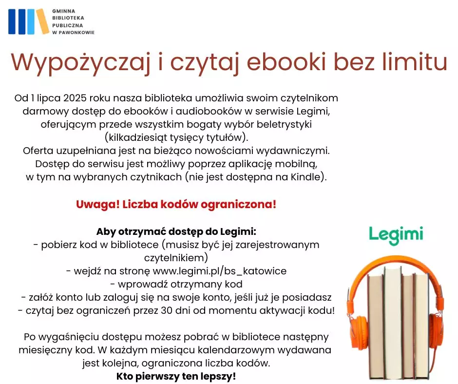 Od 1 lipca 2025 roku nasza biblioteka umożliwia swoim czytelnikom darmowy dostęp do ebooków i audiobooków w serwisie Legimi, oferującym przede wszystkim bogaty wybór beletrystyki (kilkadziesiąt tysięcy tytułów). Oferta uzupełniana jest na bieżąco nowościami wydawniczymi. Dostęp do serwisu jest możliwy poprzez aplikację mobilną, w tym na wybranych czytnikach (nie jest dostępna na Kindle).