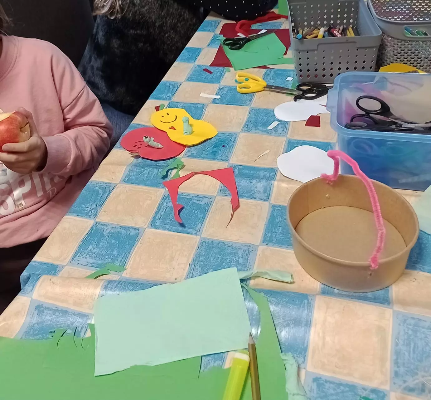 Malowaliśmy i wycinaliśmy jabłka oraz gruszki, w których ukrywał się sympatyczny robaczek. Dzieci miały okazję ozdobić koszyczki i pokazać swoje umiejętności artystyczne.