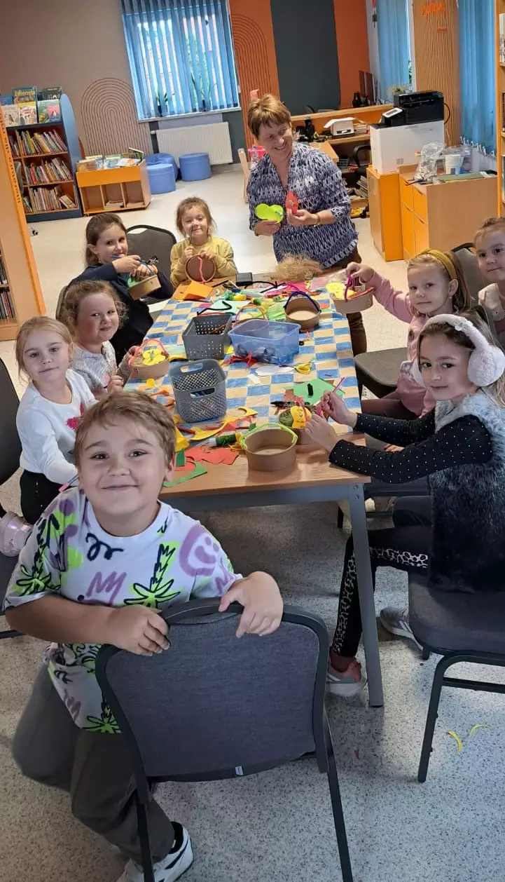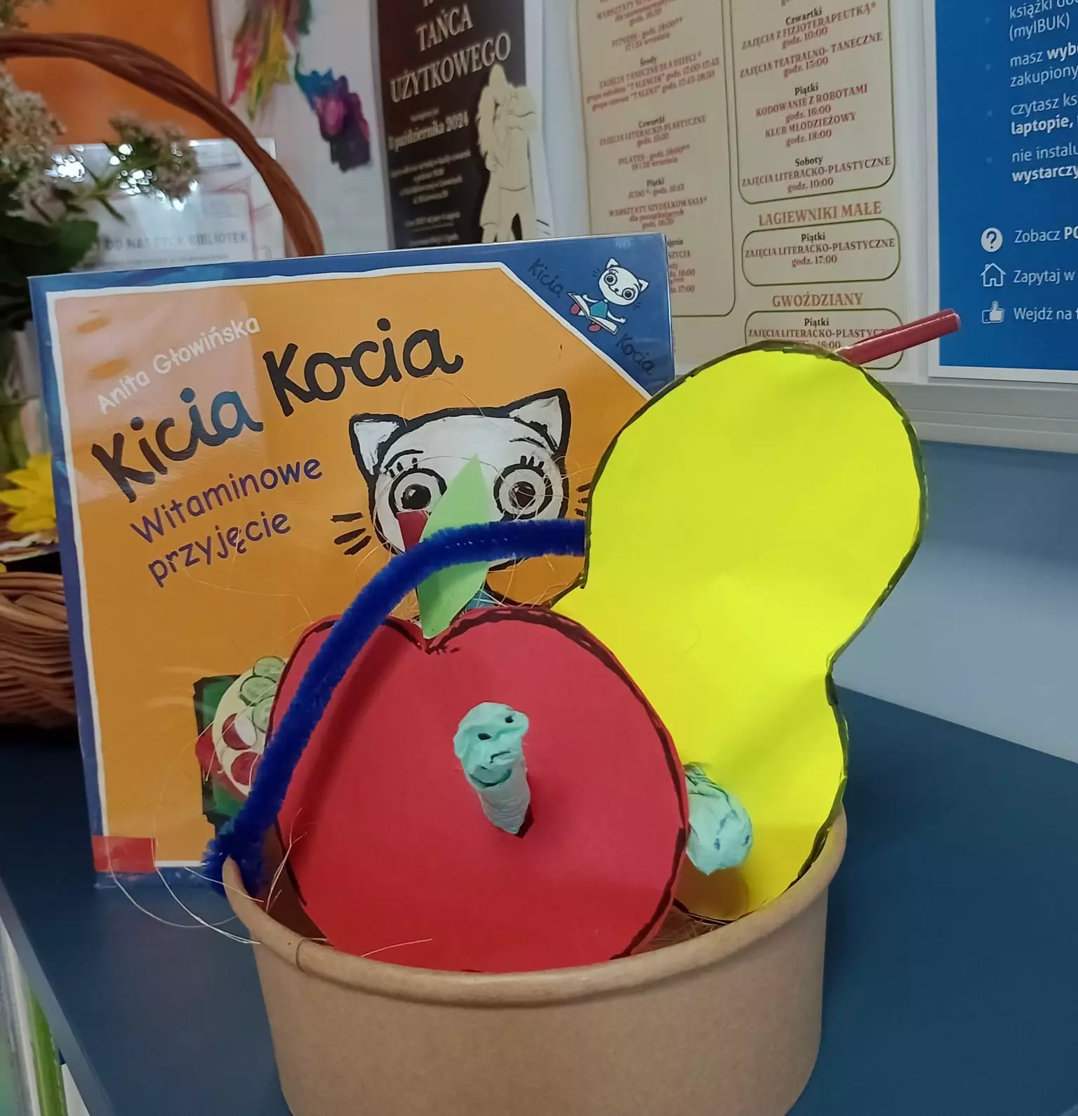 Dzieci siedzą przy stole w bibliotece i robią swoje witaminowe owocki.Krótka przerwa na jabłko.Witaminowy koszyczek jednej z uczestniczek.Dziewczynka prezentuje swoj witaminowy koszyczek, który zrobiła podczas zajęć.