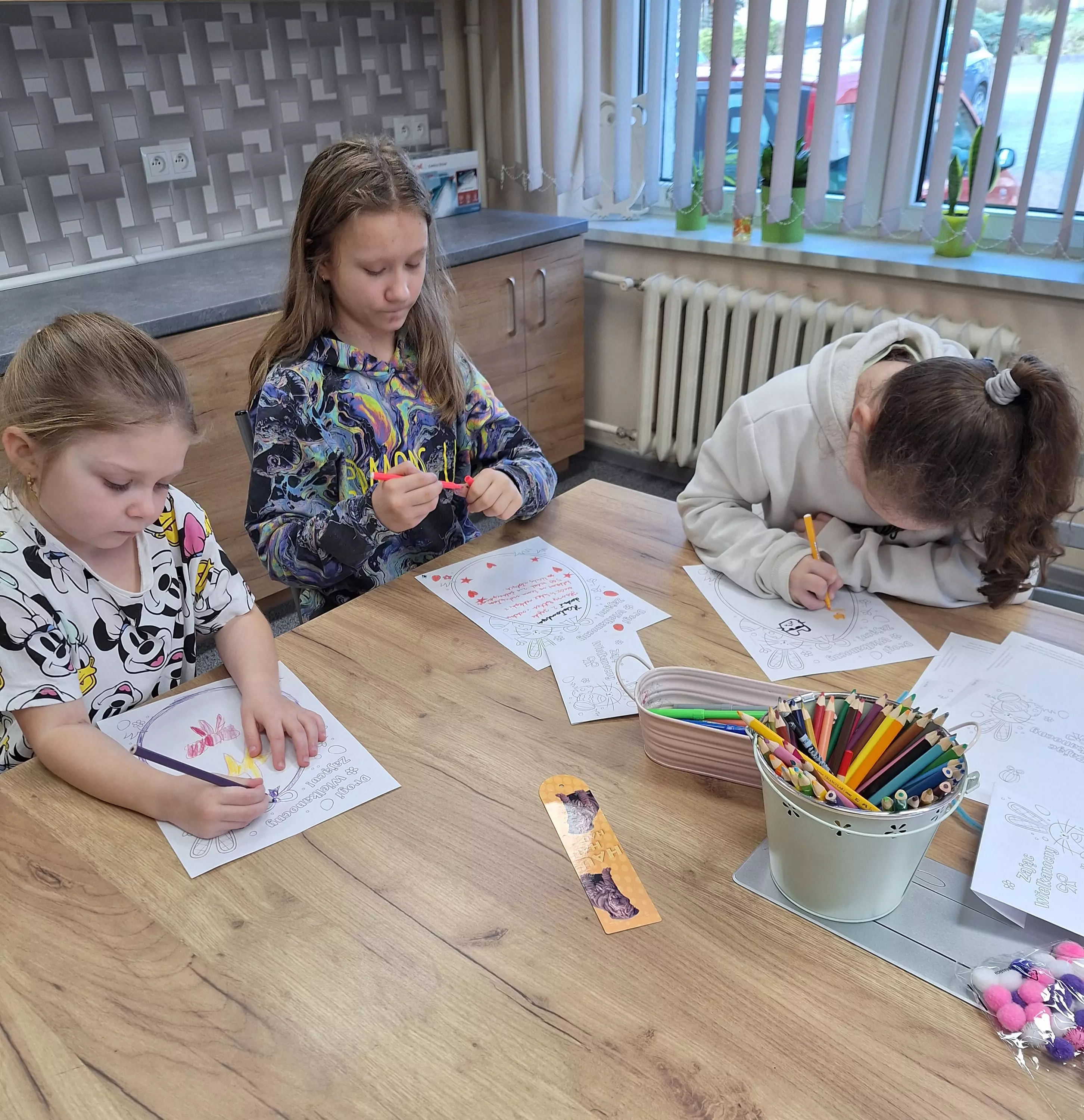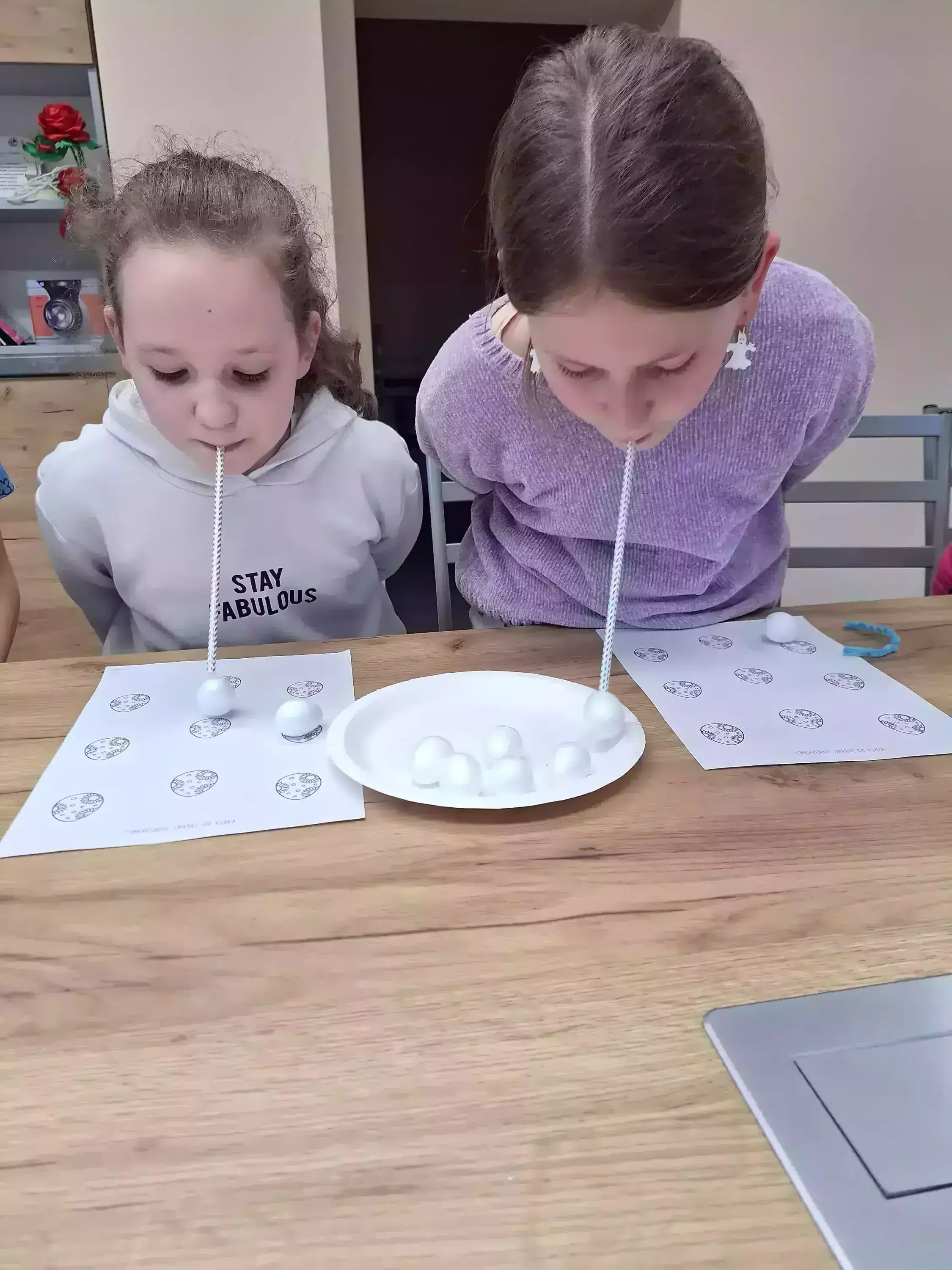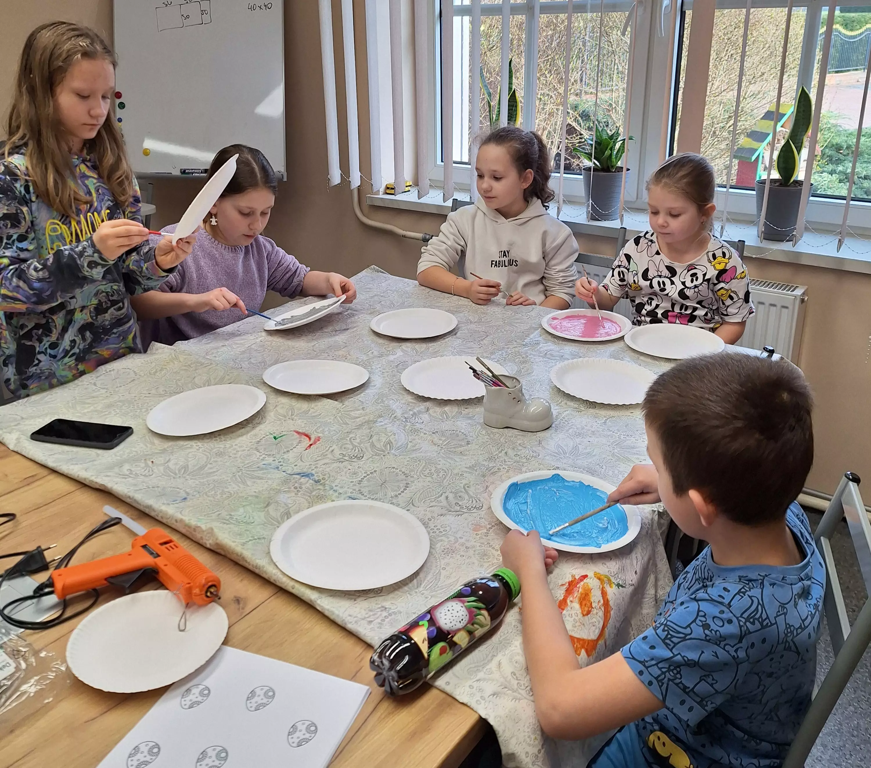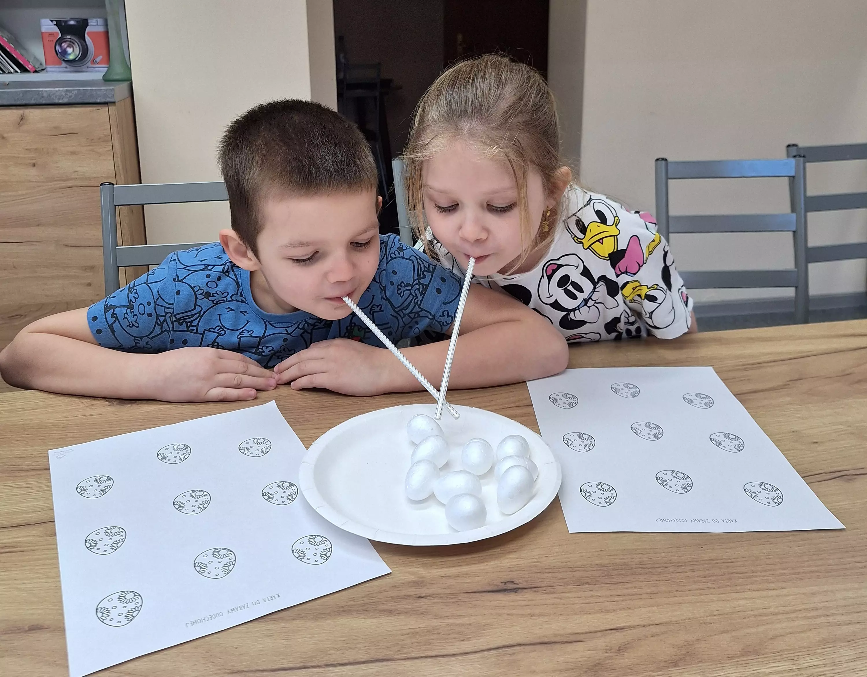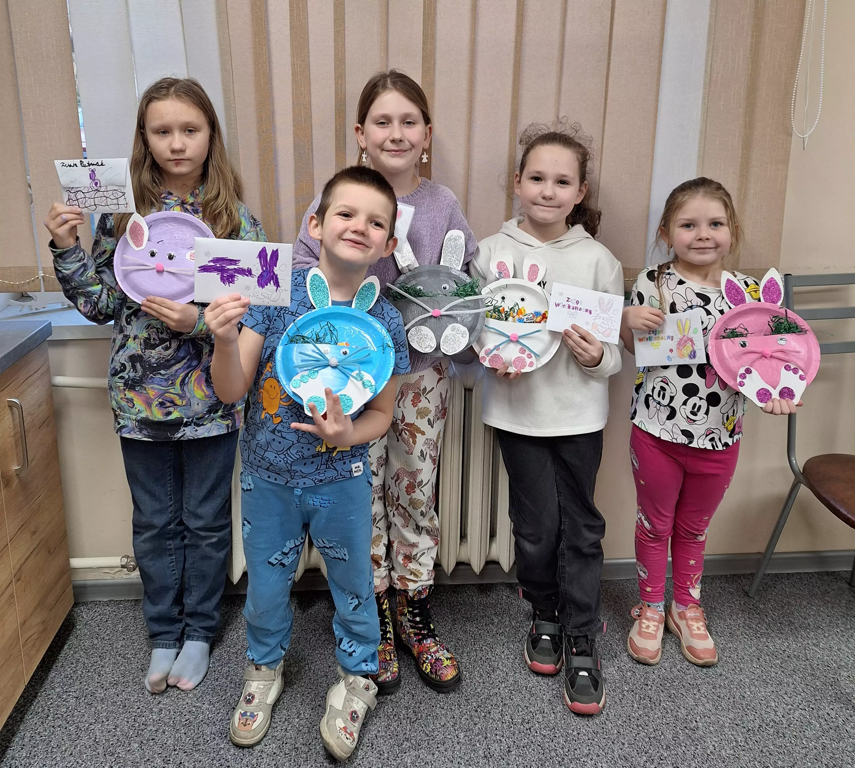 Dzieci malują talerzyki papierowe farbkami.Dziewczyny piszą list do zajączka.Chłopczyk pisze list do zajączka.Dziewczyny bawią się w zabawę zbierania jajeczek wielkanocnych.Dzieci bawią się w zbieranie jajeczek wielkanocnych.Dziewczyny zbierają słomką jajeczka wielkanocne.Wspólne zdjęcie dzieci po zajęciach plastycznych z wykonanymi pracami.Uczestnicy zajęć wrzucają listy do papierowej skrzynki pocztowej.Uczestnicy zajęć wrzucają listy do papierowej skrzynki pocztowej.