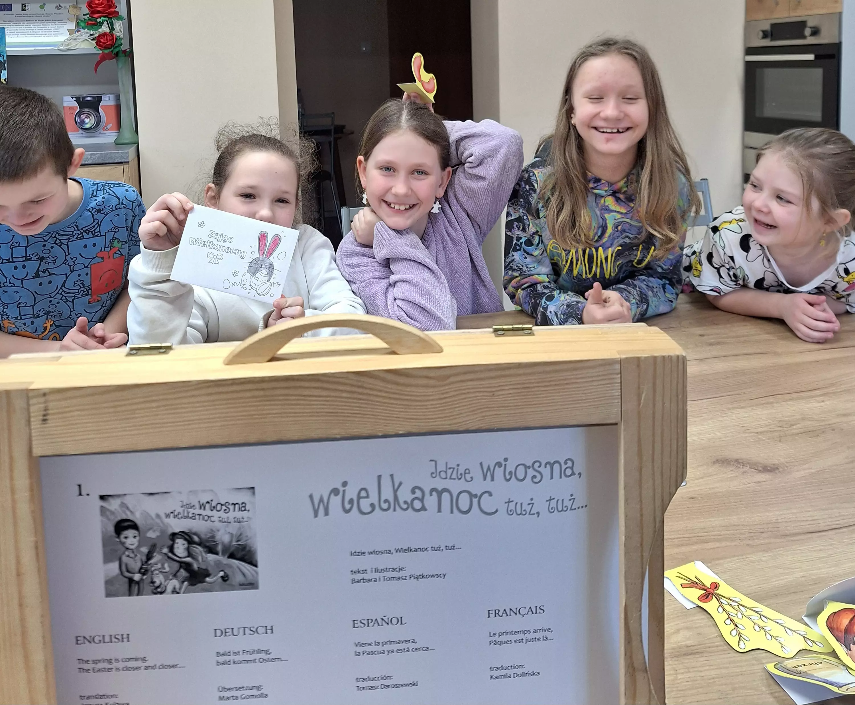 Na wczorajszych zajęciach literacko-plastycznych dzieci napisały list wyrażając w nim swoje życzenia i marzenia. Za pomocą teatrzyku Kamishibai wysłuchały opowieści związanej z Wielkanocą, bawiły się w wesołą zabawę polując na największą ilość zebranych jajek oraz wykonały urocze zajączki z talerzyków papierowych.