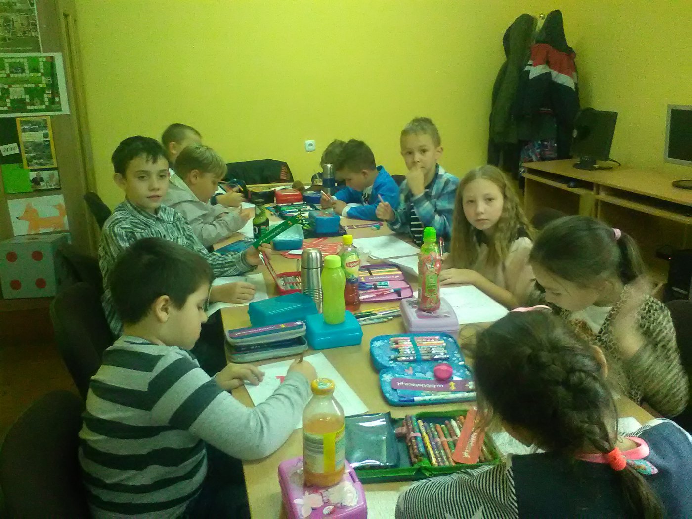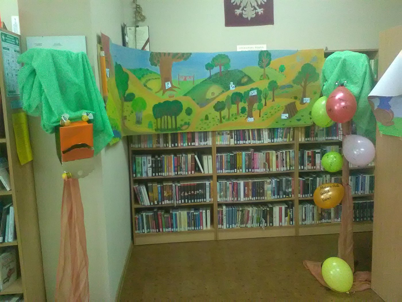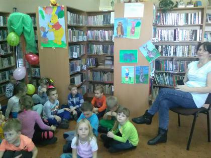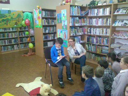 Kl. II z okazji 90 rocznicy urodzin Kubusia Puchatka odwiedziła bibliotekę dwukrotnie. Po przeczytaniu opowiadania pt. Kubuś Puchatek i miodowe drzewo, dzieci miały czas na wspólną zabawę. Doskonale znały bohaterów opowiadania, ich imiona wypisywały na urodzinowych balonach a cechy charakteru na karteczkach. Na planszy Stumilowego Lasu przyporządkowywali bohaterów do namalowanych domków. W czasie odwiedzin biblioteki przeprowadzony został też konkurs pięknego czytania przygód Kubusia. Wyłoniono trójkę zwycięzców, którzy otrzymali nagrody. Pozostali zostali poczęstowani przysmakiem Kubusia. Pani Asia wychowawczyni klasy zabrała również parę książek o przygodach Kubusia do czytania w klasie.