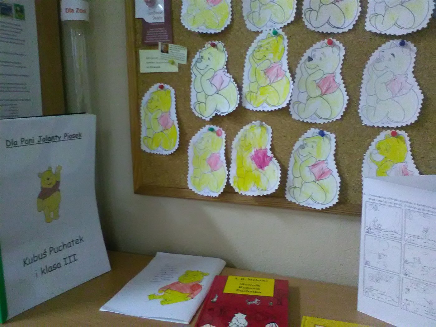 Na świętowanie urodzin Misia przybyła również Kl. III z Panią Anetą. Tym razem uczniowie poznali przygody Kubusiu Puchatka poprzez wysłuchanie audiobooka. Mieli okazję też poukładać puzzle z bohaterami opowiadania. Uczniowie Kl. III zostawili też kolorowanki z postacią Kubusia.