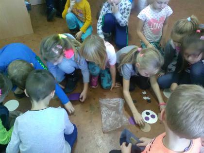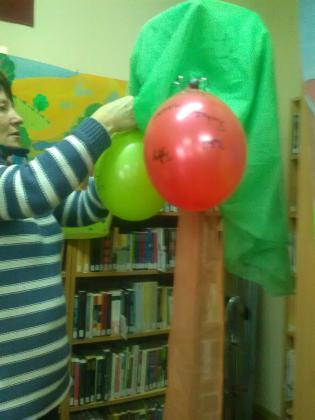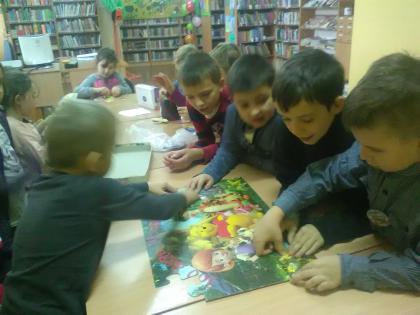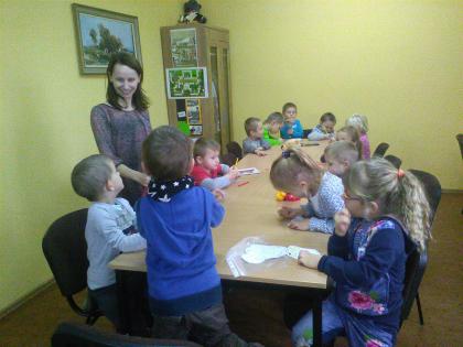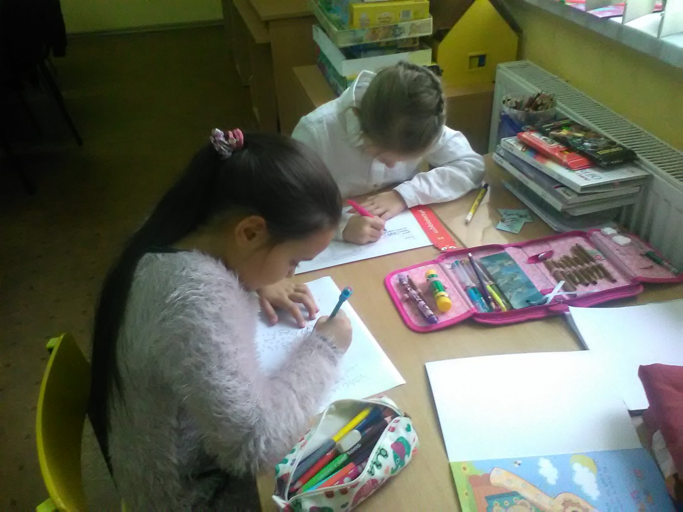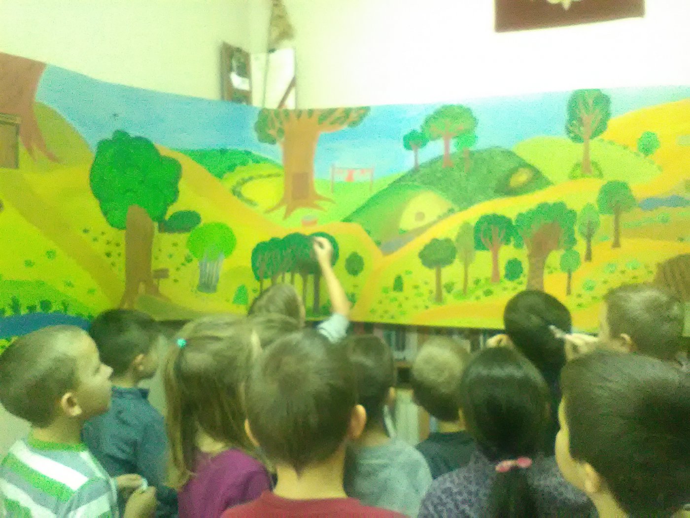 Nasze przedszkolaki młodsze i starsze również przyszły by zobaczyć udekorowaną bibliotekę i posłuchać bajki O Kubusiu i miodowym drzewie. Ich pokolorowane obrazki Kubusia zostały zawieszone na tablicę i są ładną dekoracją. Przedszkolaki ozdabiały też czapeczki urodzinowe dla misia. Był to bardzo twórczy i radosny czas.