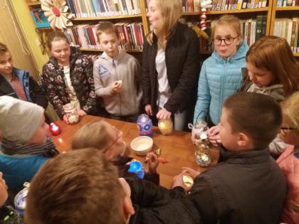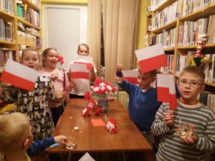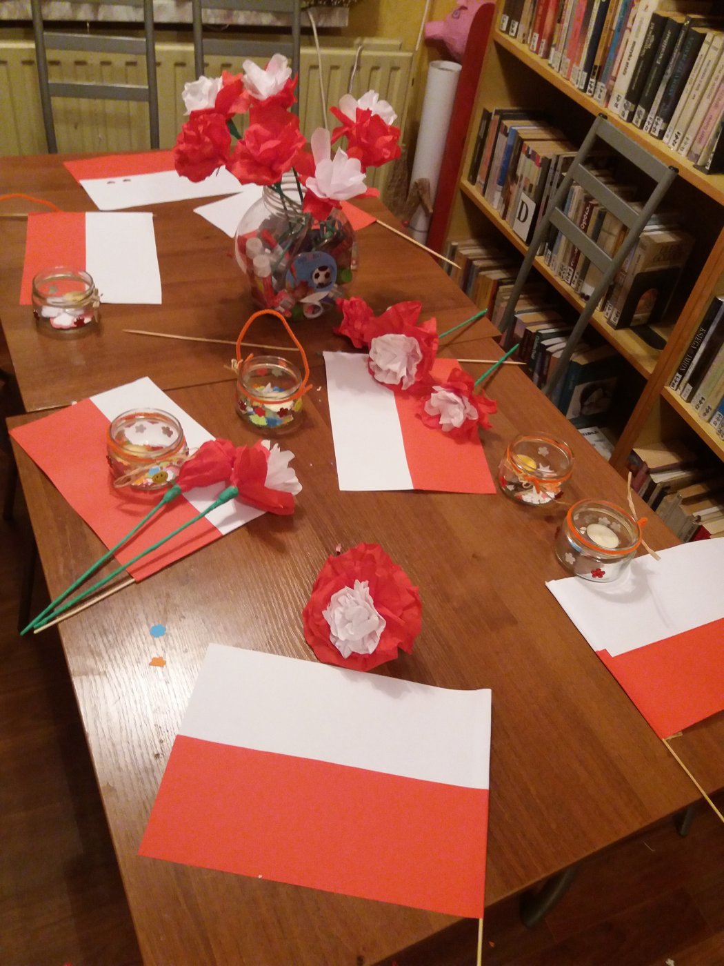 Również w listopadzie w bibliotece odbyły się warsztaty plastyczne, podczas których wykonano chorągiewki biało-czerwone, kwiatki z bibuły oraz lampiony marcinkowe. Zajęcia upłynęły w miłej atmosferze przy słuchaniu pieśni narodowych i piosenek żołnierskich.