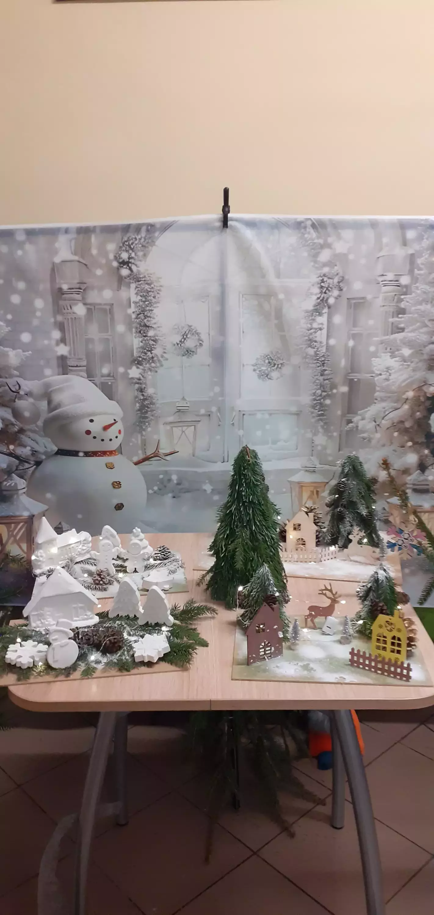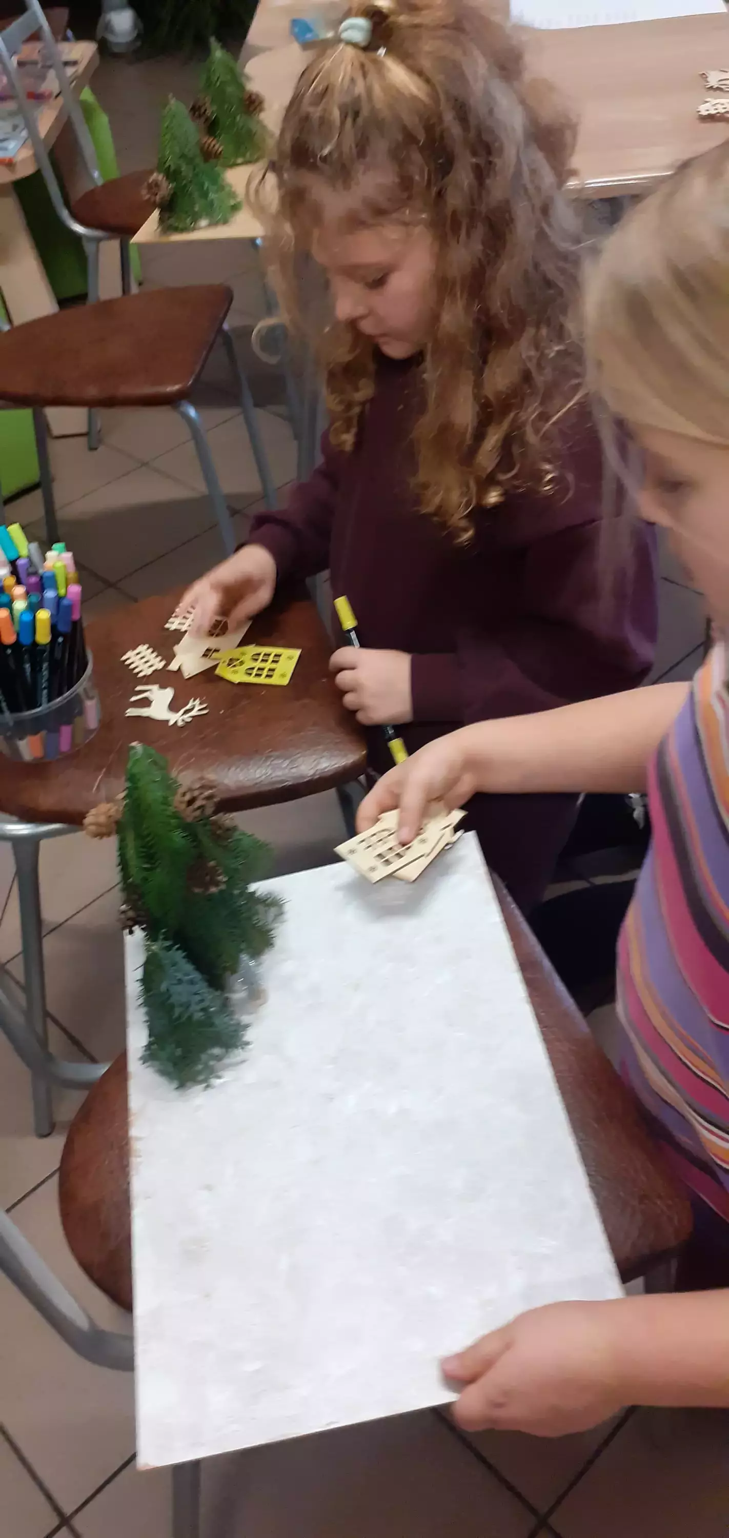 Dzieci z gałązek kleją choinki.Dziewczynka trzyma w ręce makietę świąteczną.Dzieci przyklejają do makiety świąteczną choinkę z gałązek.Wspólne zdjęcie dzieci z makietami świątecznymi.Wspólne zdjęcie dzieci z makietami świątecznymi.Wspólne zdjęcie dzieci z makietami świątecznymi.Makieta świąteczna.