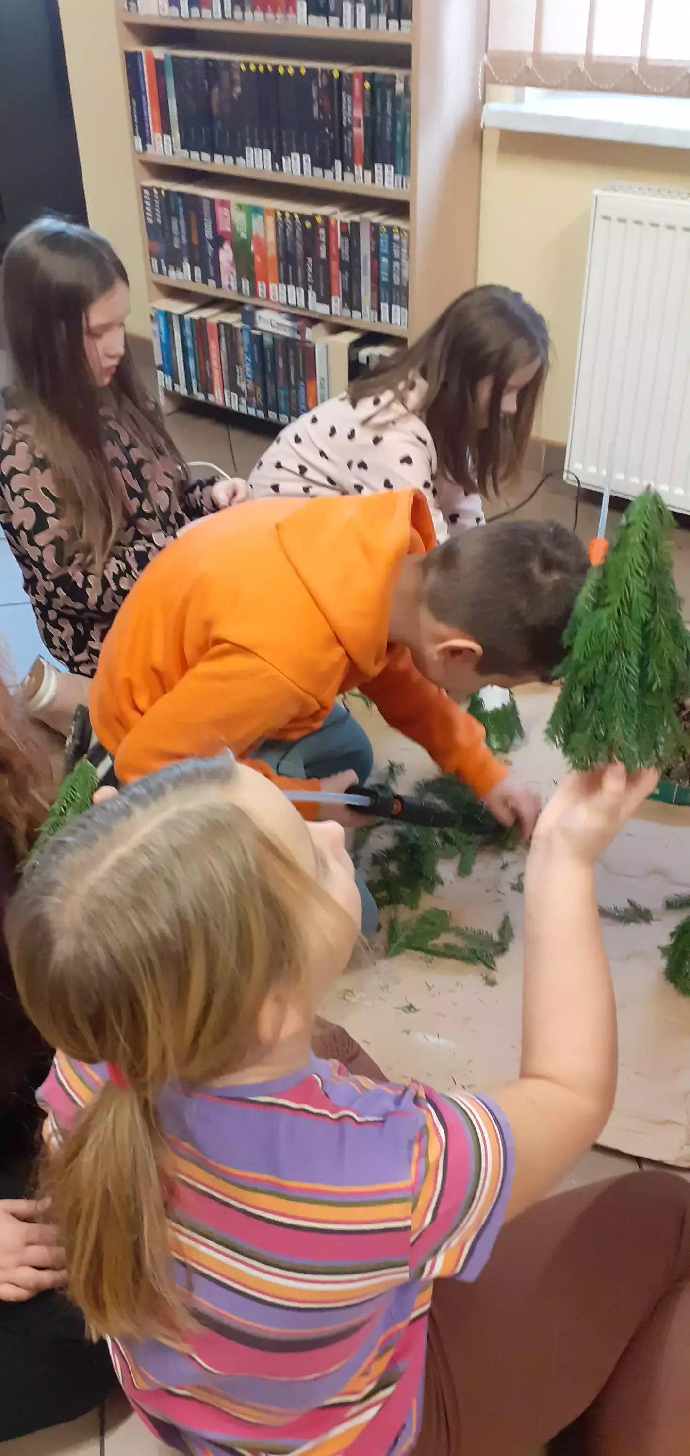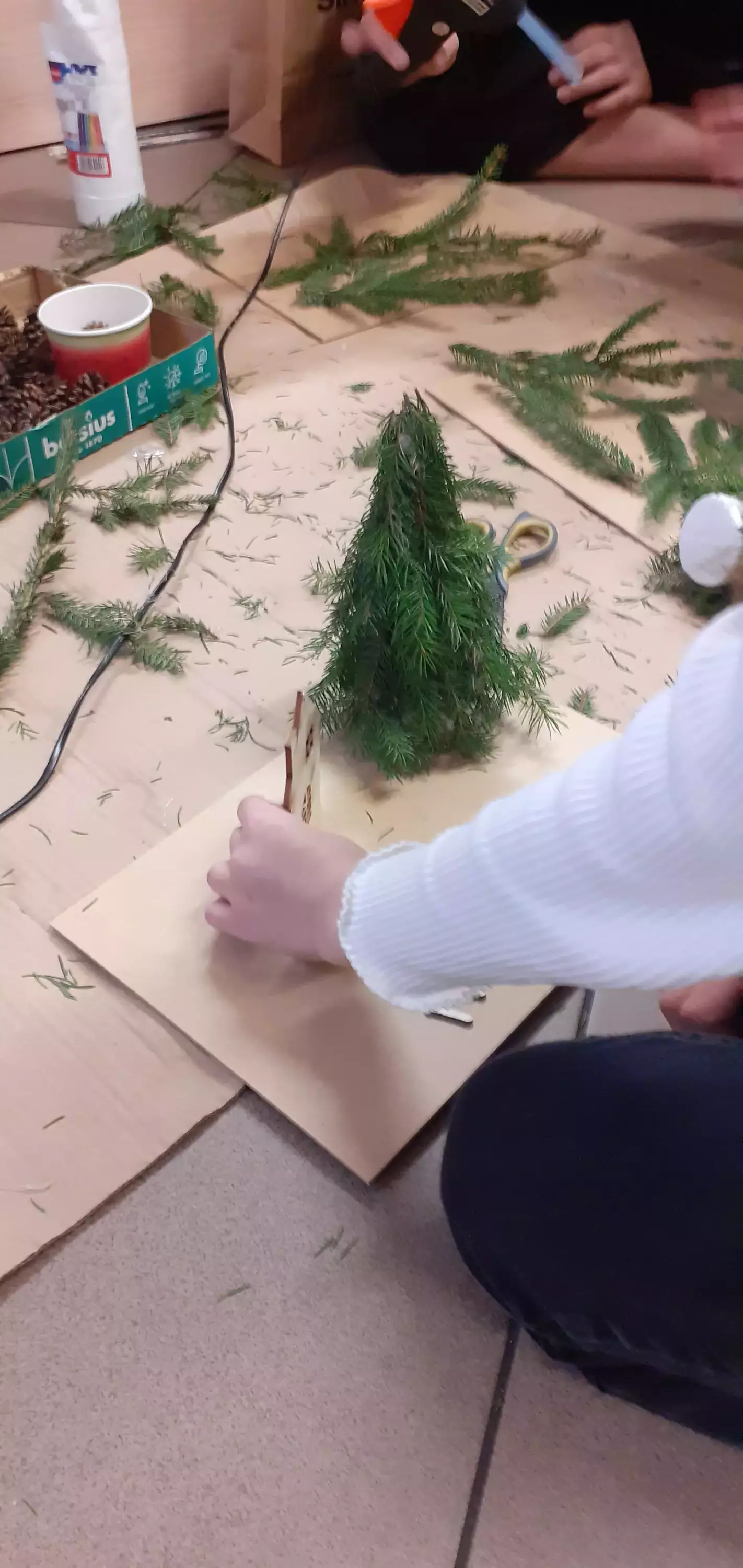 Dzieci z gałązek kleją choinki.