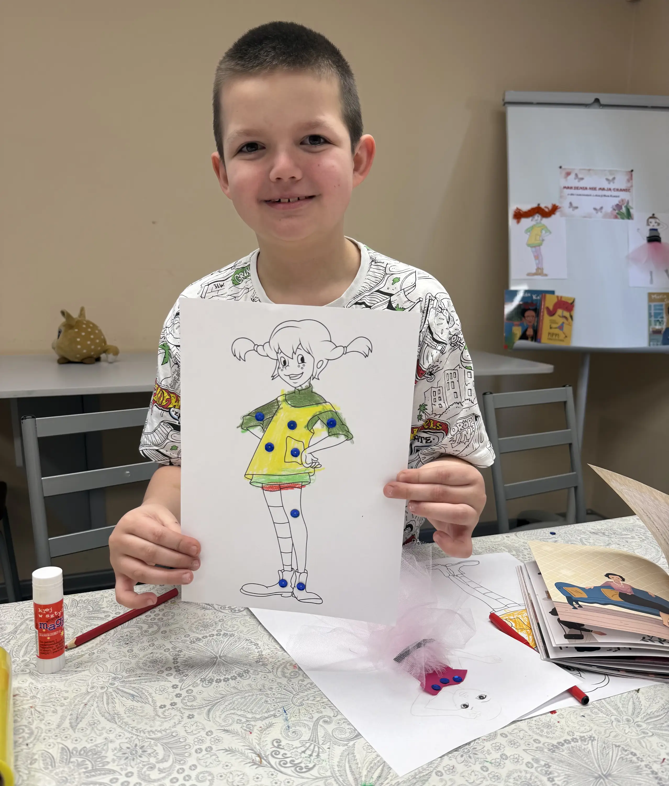 W części plastycznej dzieci przygotowały kolorowe portrety Pippi Pończoszanki, tworząc jej charakterystyczne warkoczyki z włóczki i rysując piegi. Następnie wcieliły się w rolę projektantów mody – powstały ciekawe stylizacje dla modelek wykonane z różnych materiałów, wstążek i tkanin.