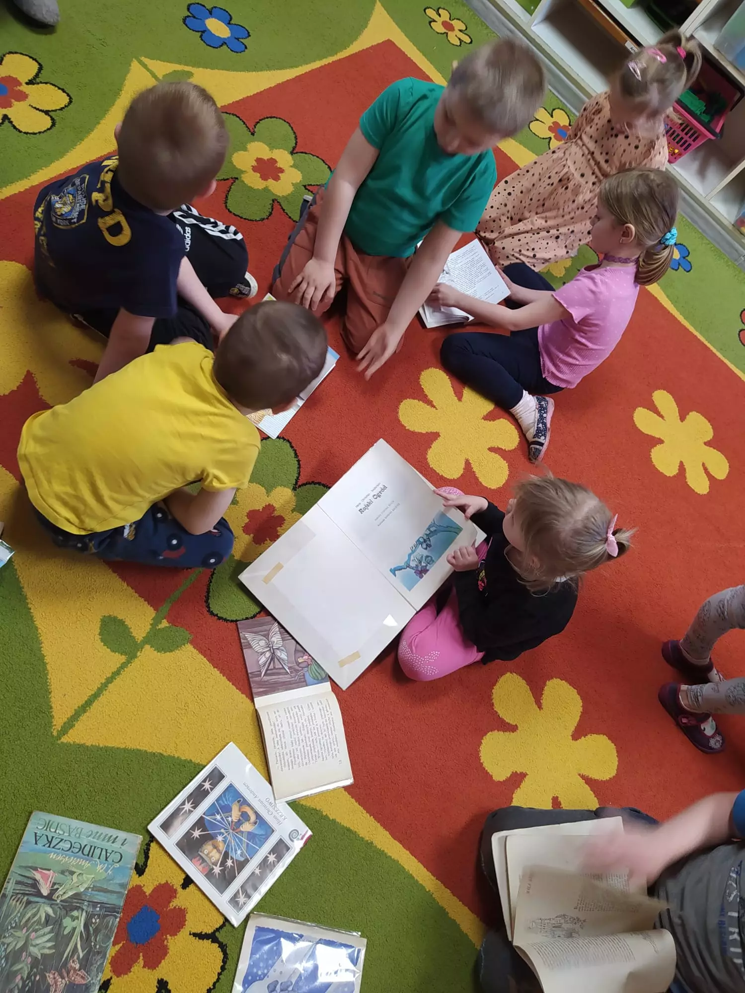 Dzieci siedzą na dywanie i słuchają czytanej bajki.