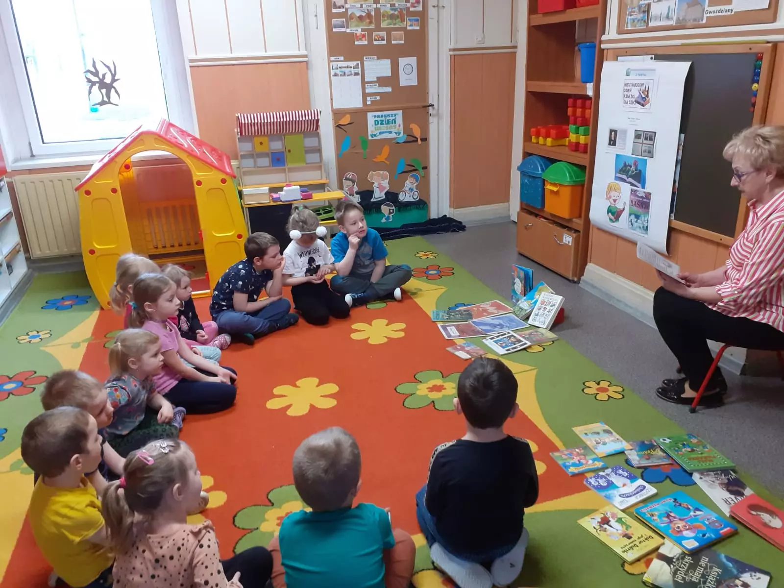 Z tej okazji p. bibliotekarka Jadwiga odwiedziła dzieci z przedszkola ZSP filii w Gwoździanach. Celem spotkania było rozbudzenie i rozwijanie zainteresowań czytelniczych wśród najmłodszych. Dzieci poznały różnice w budowie i wyglądzie książek i obejrzały jedną z najpiękniejszych baśni Andersena "Calineczkę".
