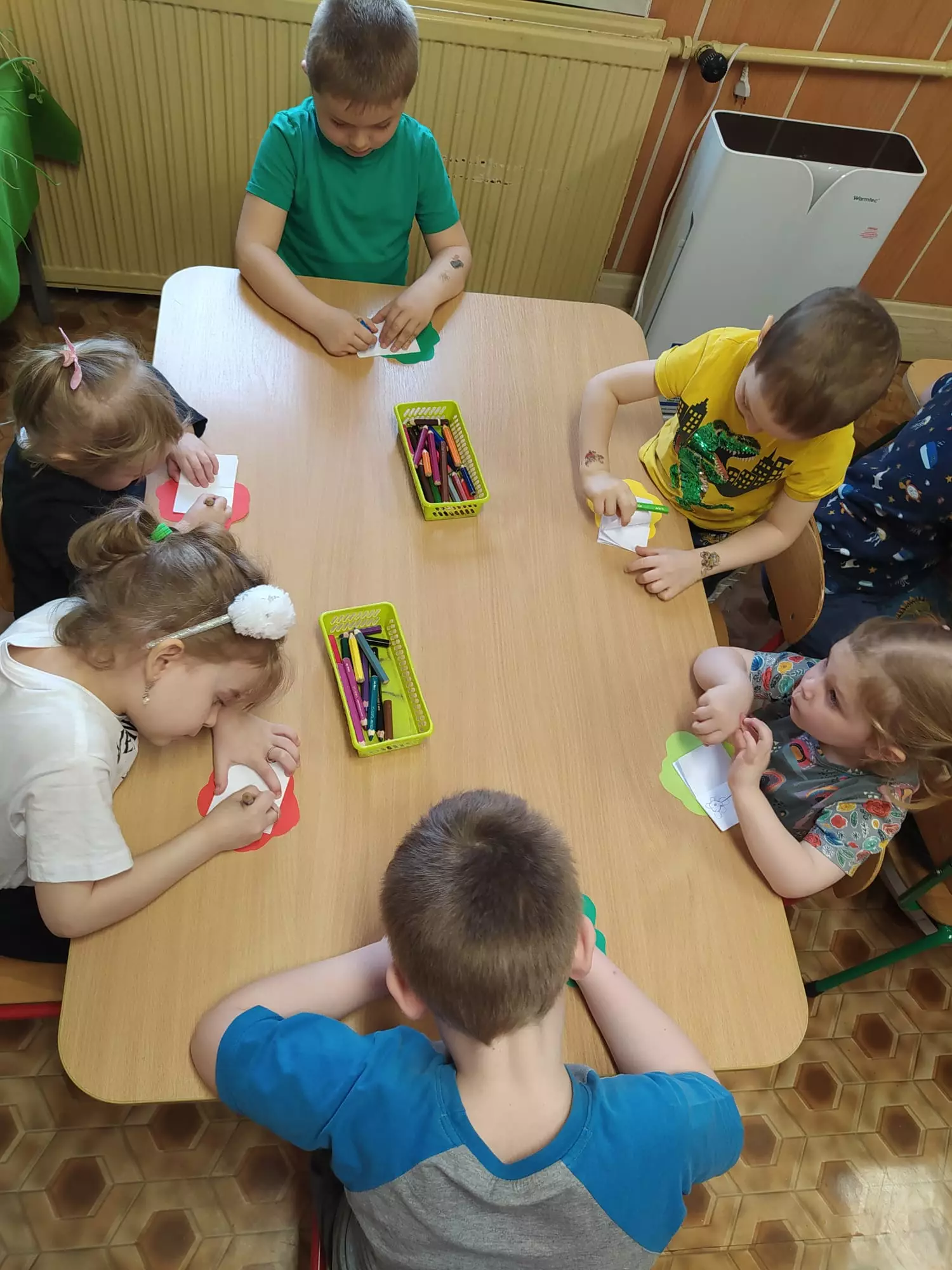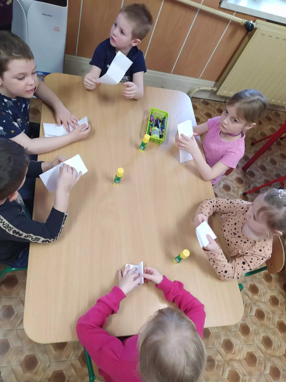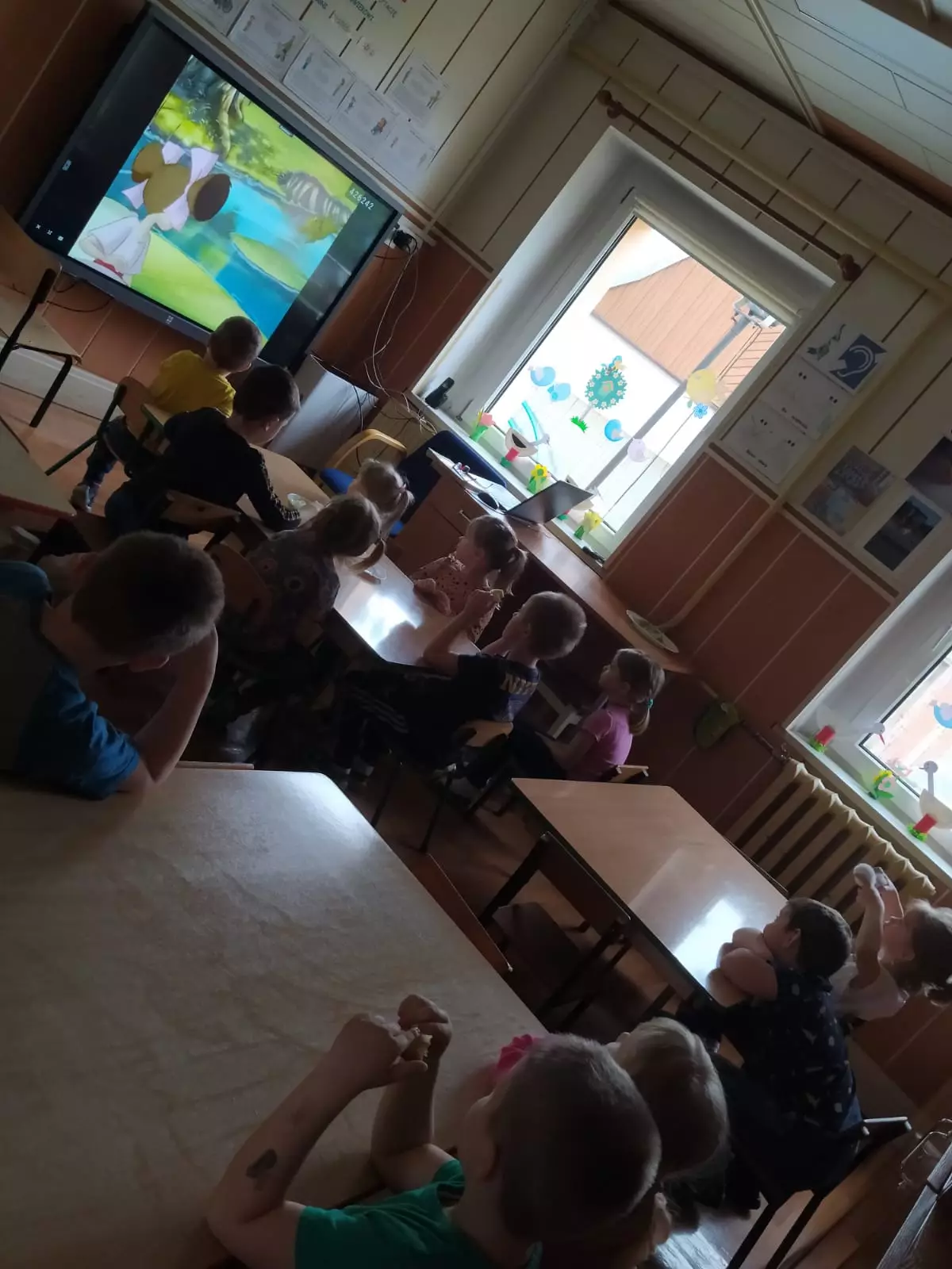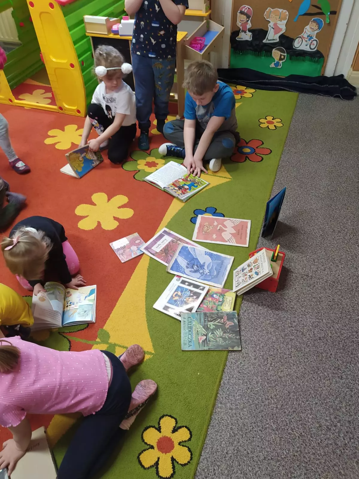 PlakatPrzedszkolaki na dywanie oglądają książeczkiKsiążkaWystawaPrzedszkolaki na dywanie oglądają książki.Chłopiec czyta książkę.Przedszkolaki na dywanie oglądają książeczki.Przedszkolaki siedzą na dywanie i oglądają książeczki.Dzieci siedzą na dywanie i oglądają książeczki.Dzieci siedzą przy stoliku i wykonują pracę plastyczną.Dzieci siedzą przy stoliku i wykonują pracę plastyczną.Dziewczynka w przedszkolu maluje obrazek.Przedszkolaki wykonują pracę plastyczną.Przedszkolaki siedzą przy stoliku i malują obrazki.Przedszkolaki pozują do wspólnego zdjęcia.Przedszkolaki uśmiechają się do wspólnego zdjęcia.KsiążeczkiDzieci oglądają bajkę na ekranie telewizora.