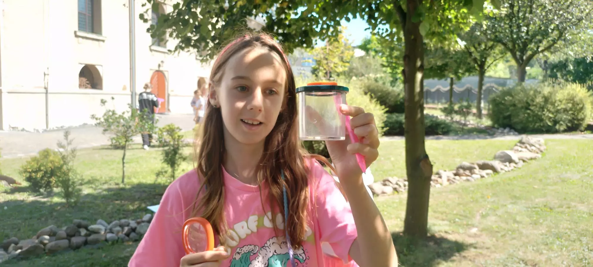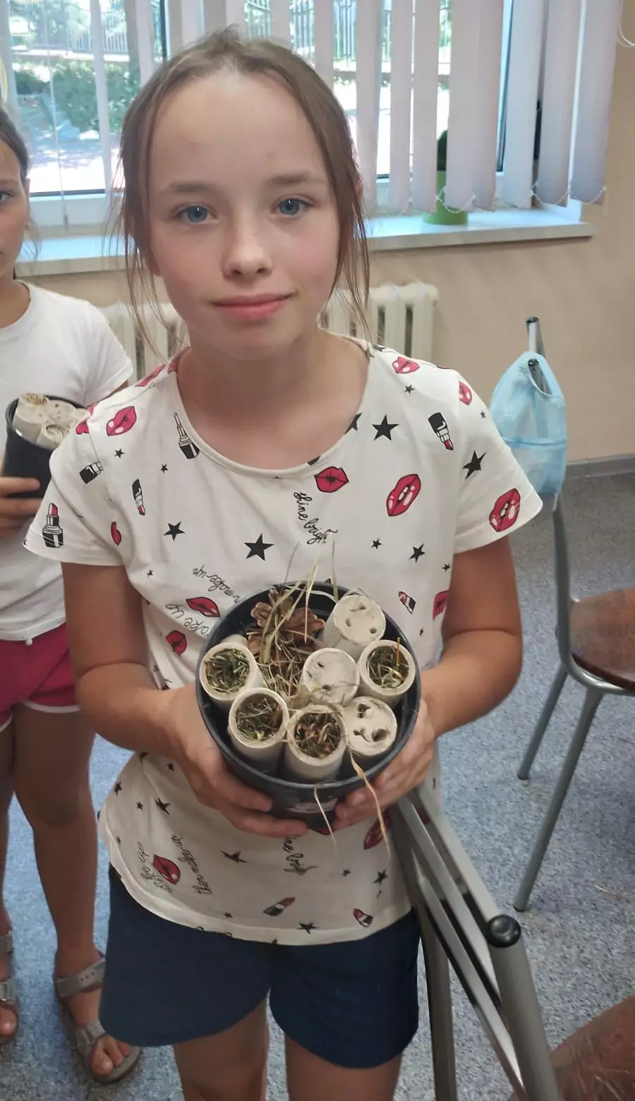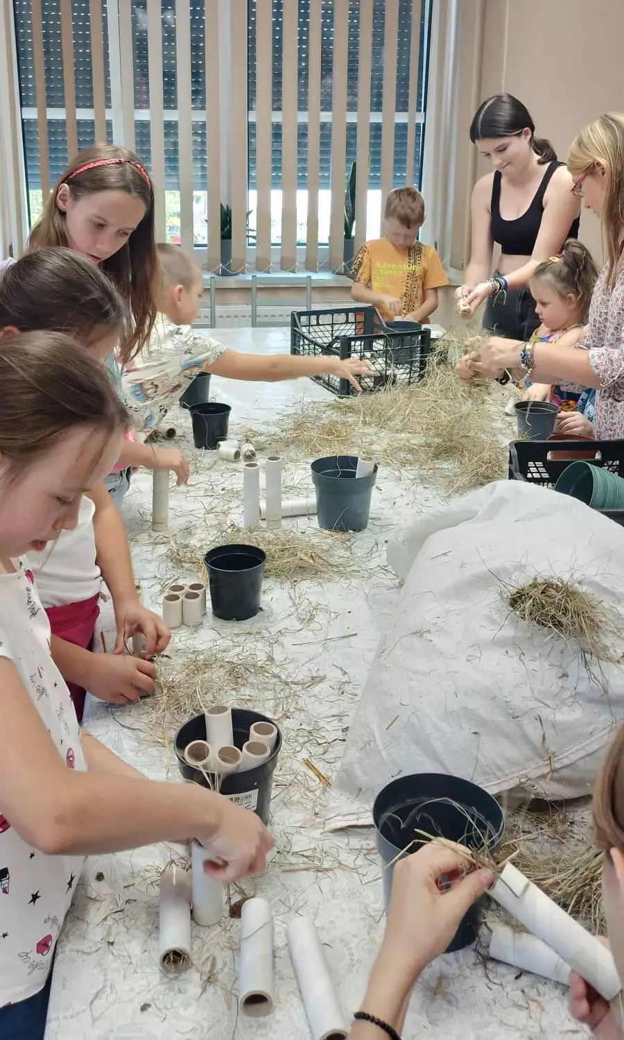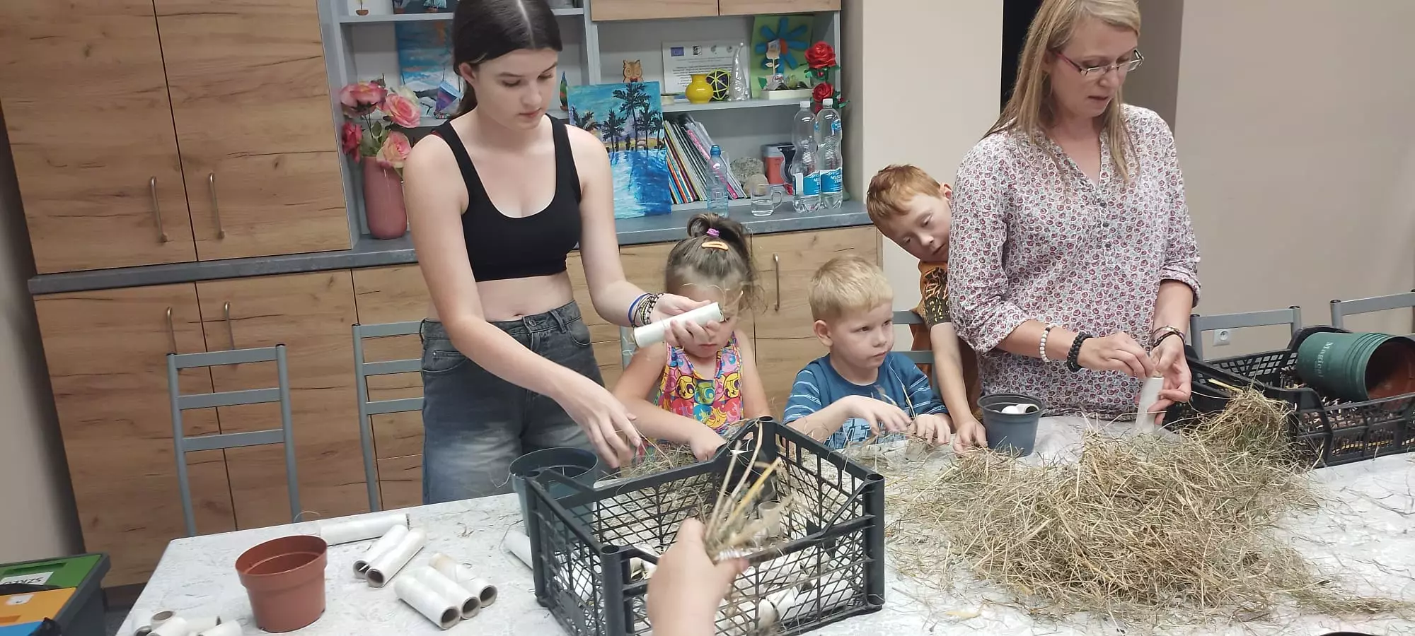 Dzieci siedzą przy stole i wypełniają doniczki sianem i szyszkami.Dzieci siedzą przy stole i wypełniają doniczki sianem i szyszkami.Dziewczynka trzyma w rękach doniczkę zrobioną na zajęciach.Chłopczyk trzyma w rękach doniczkę zrobioną na zajęciach.Wspólne zdjęcie uczestników warsztatów przed biblioteką.Dzieci oglądają pod lupą owady.Dzieci biegają po trawie łapiąc motyle do siatki.Dziewczyna trzyma w ręce pojemnik w którym ma mrówkę.Dziewczynka łapie w siatkę motyle, druga dziewczynka ogląda owady pod lupą a chłopczyk dyskutuje o owadach.