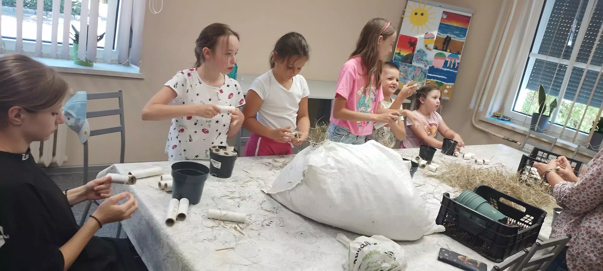 Dzieci siedzą przy stole i wypełniają doniczki sianem i szyszkami.