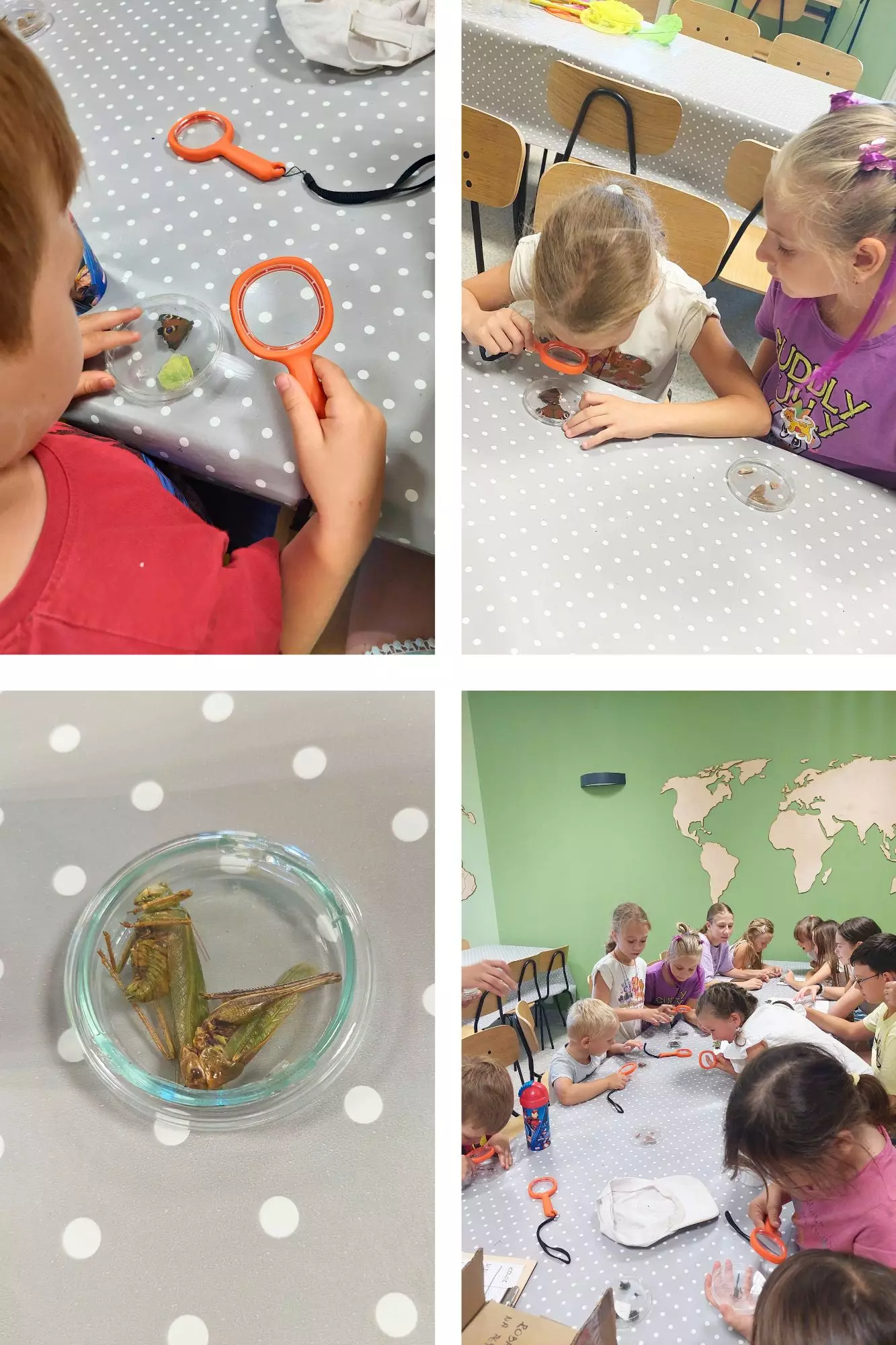 Podczas zajęć dzieci z ogromnym zapałem eksplorowały otoczenie, szukając owadów w trawie, kwiatach i na drzewach. Zaopatrzone w lupy, siatki na owady oraz specjalne kubeczki, wyruszyły na misję, by odkryć tajemnice przyrody. Owadzie skarby, które udało się znaleźć, były potem dokładnie opisywane i omawiane.Następnie dzieci miały okazję zobaczyć imponującą kolekcję zabezpieczonych owadów, którą zaprezentowała im pani Małgosia.