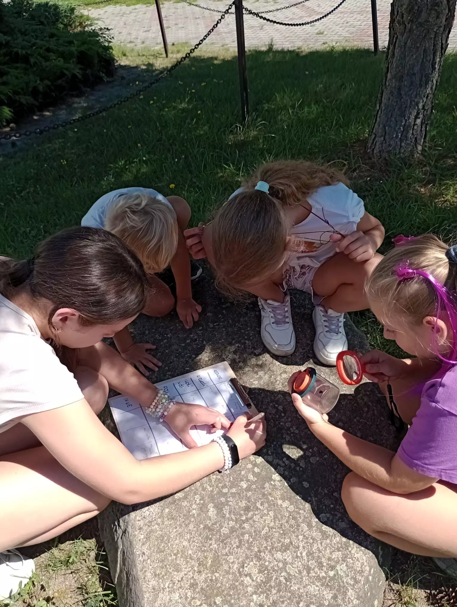Kolaż zdjęć z zajęć Mikrokosmos wokół nas – poznajemy owady.Kolaż zdjęć z warsztatów pt. Mikrokosmos wokół nas – poznajemy owady.Dzieci oglądają przez lupe zamkniete w pojemniku owady.Jedna z grup idzie na poszukiwania kolejnych owadów.Dwie dziewczynki wnikliwiej obserwują przez lupę owada, którego złapały.Dzieci opisują złapanego przez nich owada.Wszyscy uczestnicy zajęć wypełniają tekturowe rolki sianem i szyszkami.Dzieci kucają na dworze i wypełniają tekturowe rolki sianem i szyszkami.