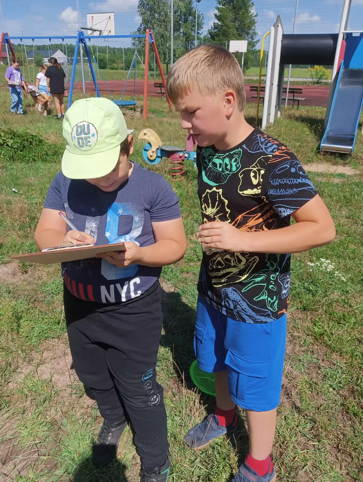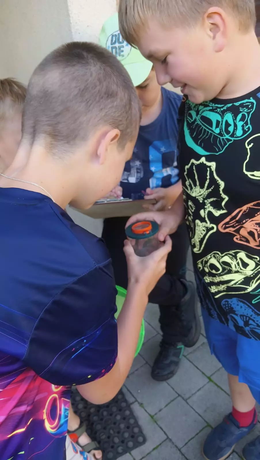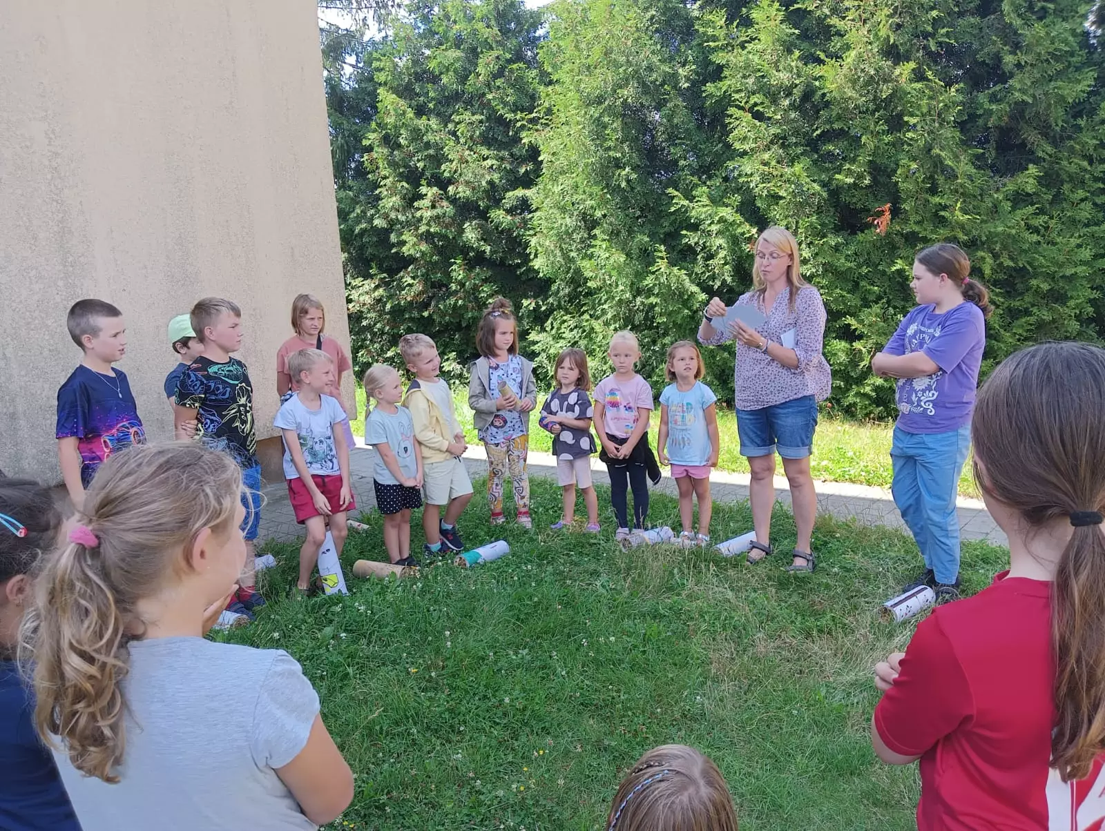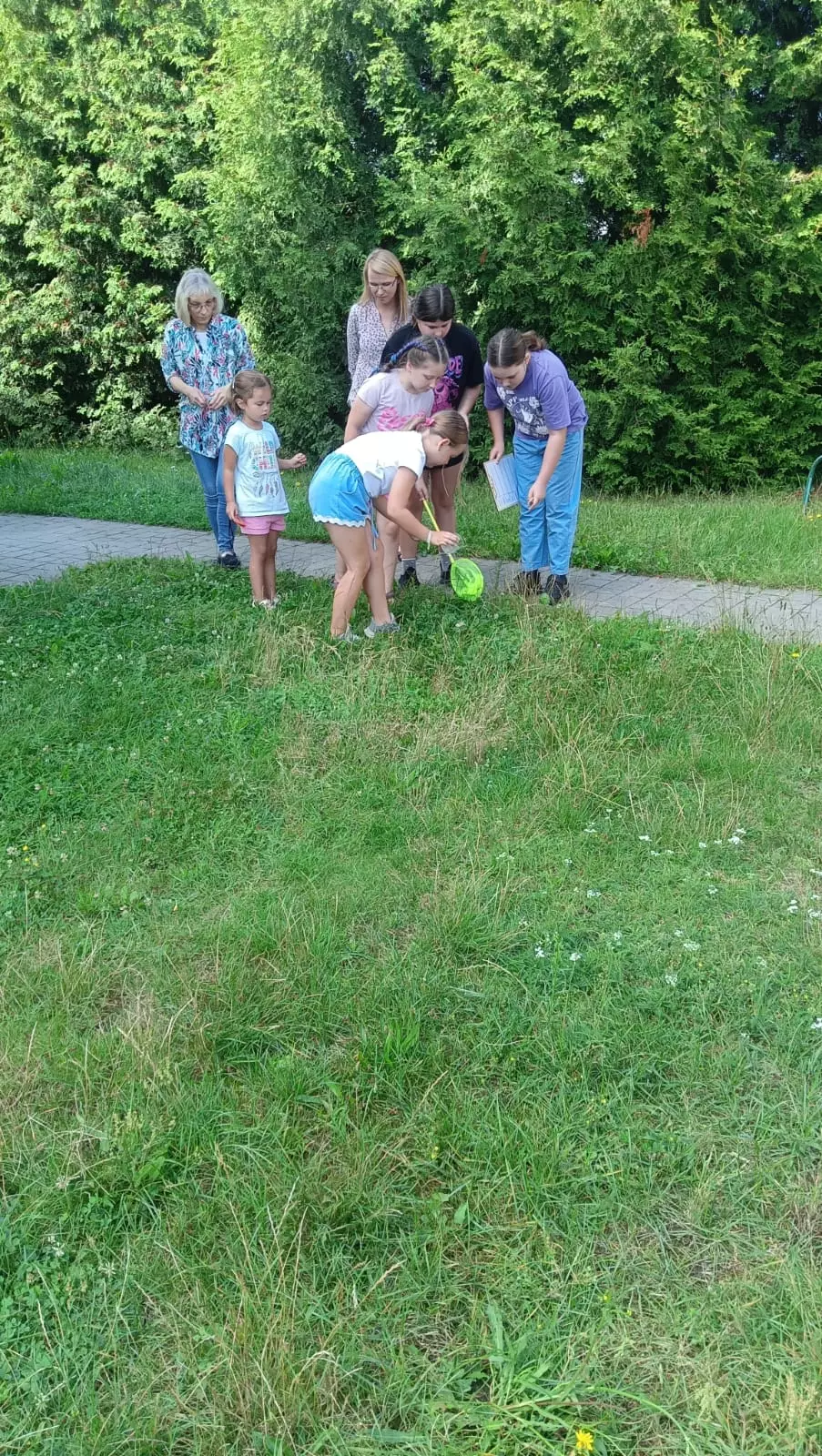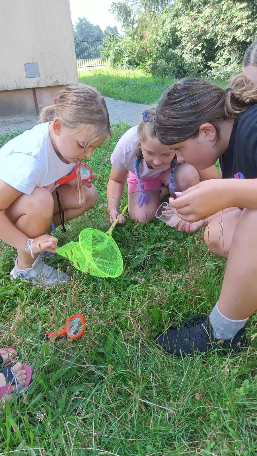 Wspólne zdjęcie uczestników po zajęciach ekologicznych.Dzieci zebrani w kole słuchają pani Małgosi opowiadającej o owadach.Dzieci wkładają słomę i szyszki do domków dla owadów.Dzieci na kolorowych tubach malują różne wzory swoich domków.Chłopcy obserwują lupą owady zamknięte w słoiku.Dziewczyny w trawie szukają owadów. Obok leży siatka na owady i pojemnik.Dzieci szukają w trawie owadów.Dzieci szukają w trawie owadów i innych zwierzątek.Chłopcy zapisują notatki dotyczące znalezionych owadów.Dzieci siedzą w bibliotece przy stolikach i zapisują notatki odnośnie znalezionych owadów.Owad na ręce uczestnika.Owad zamknięty w przeźroczystym pojemniku.