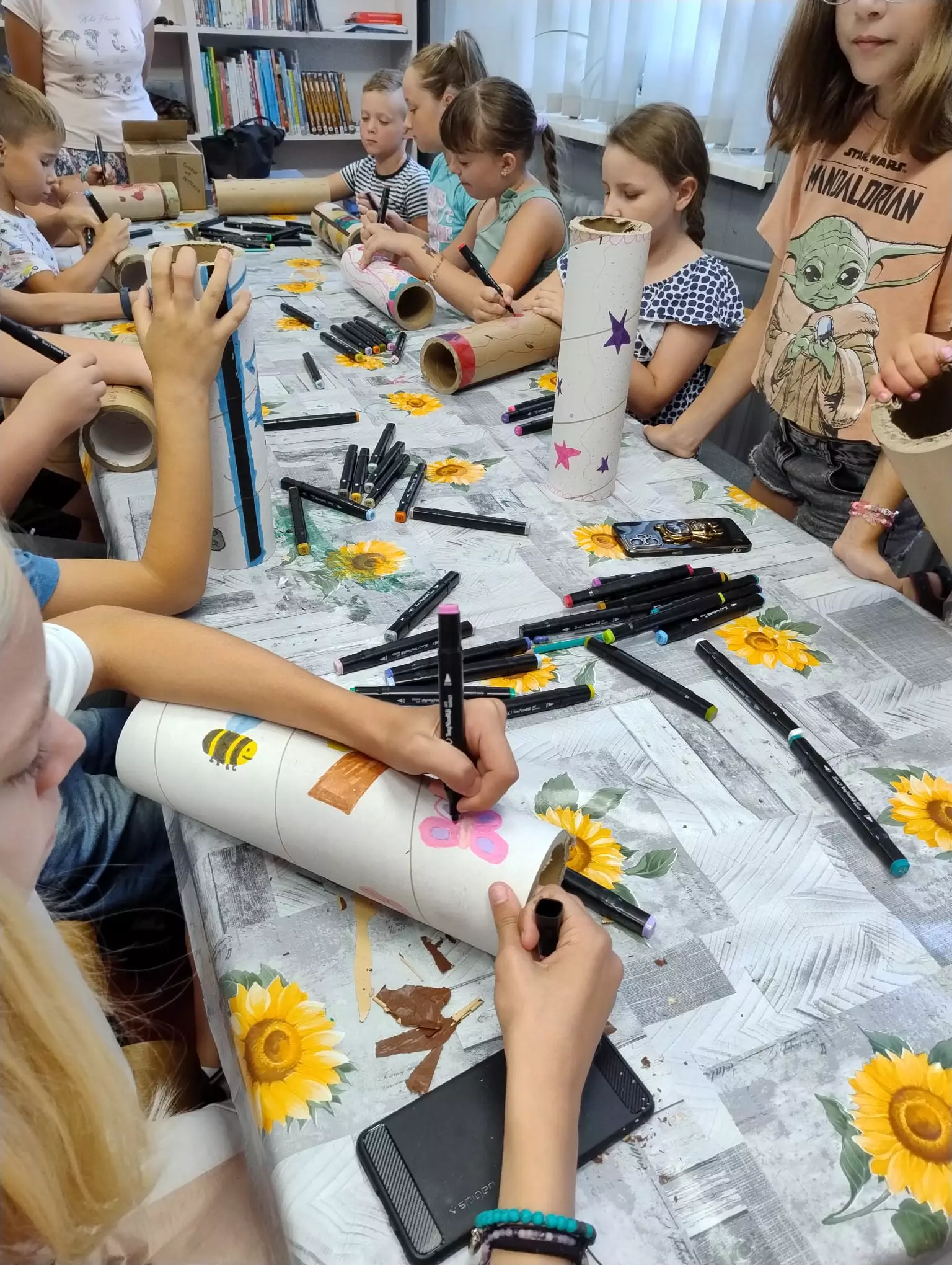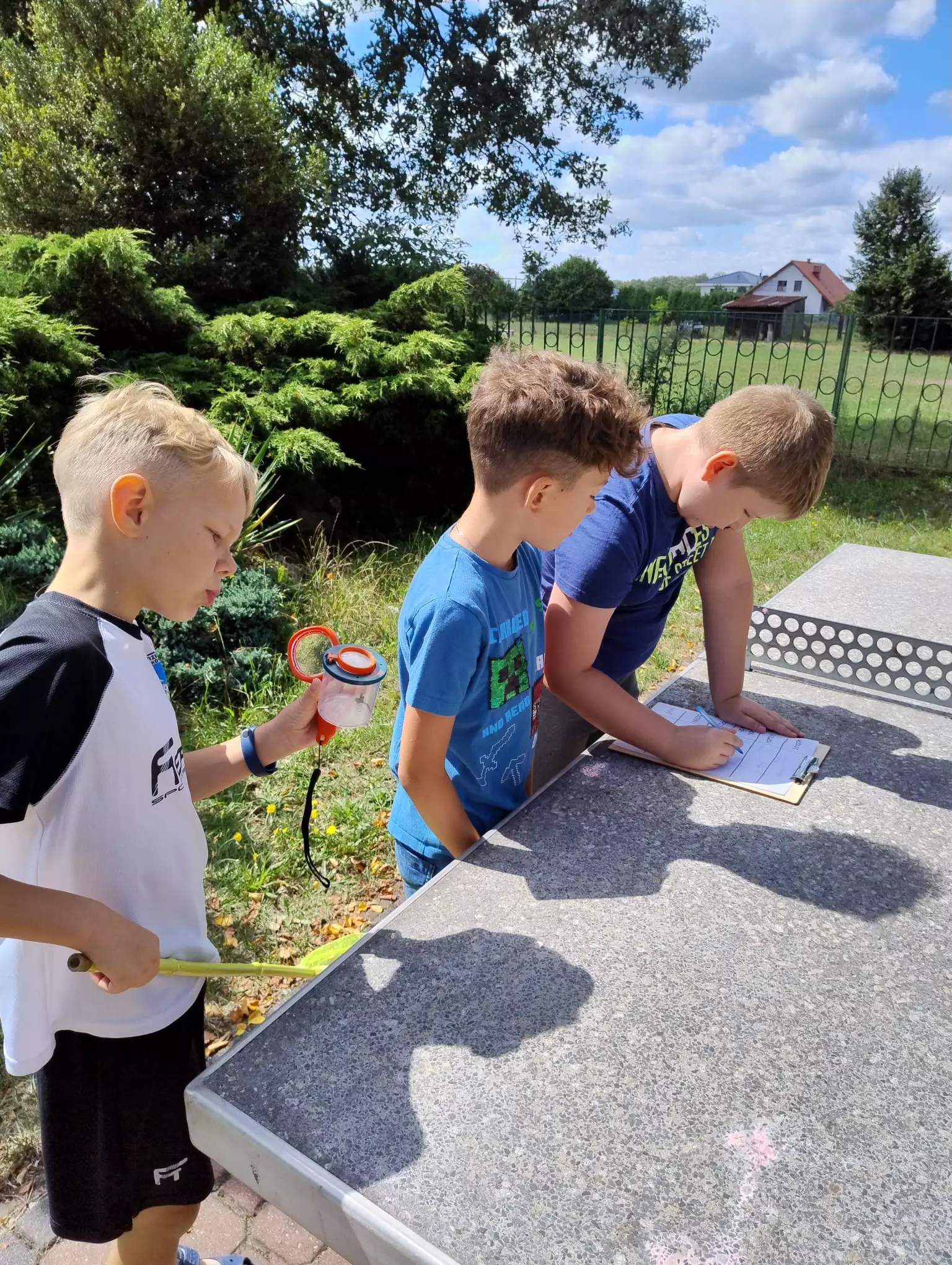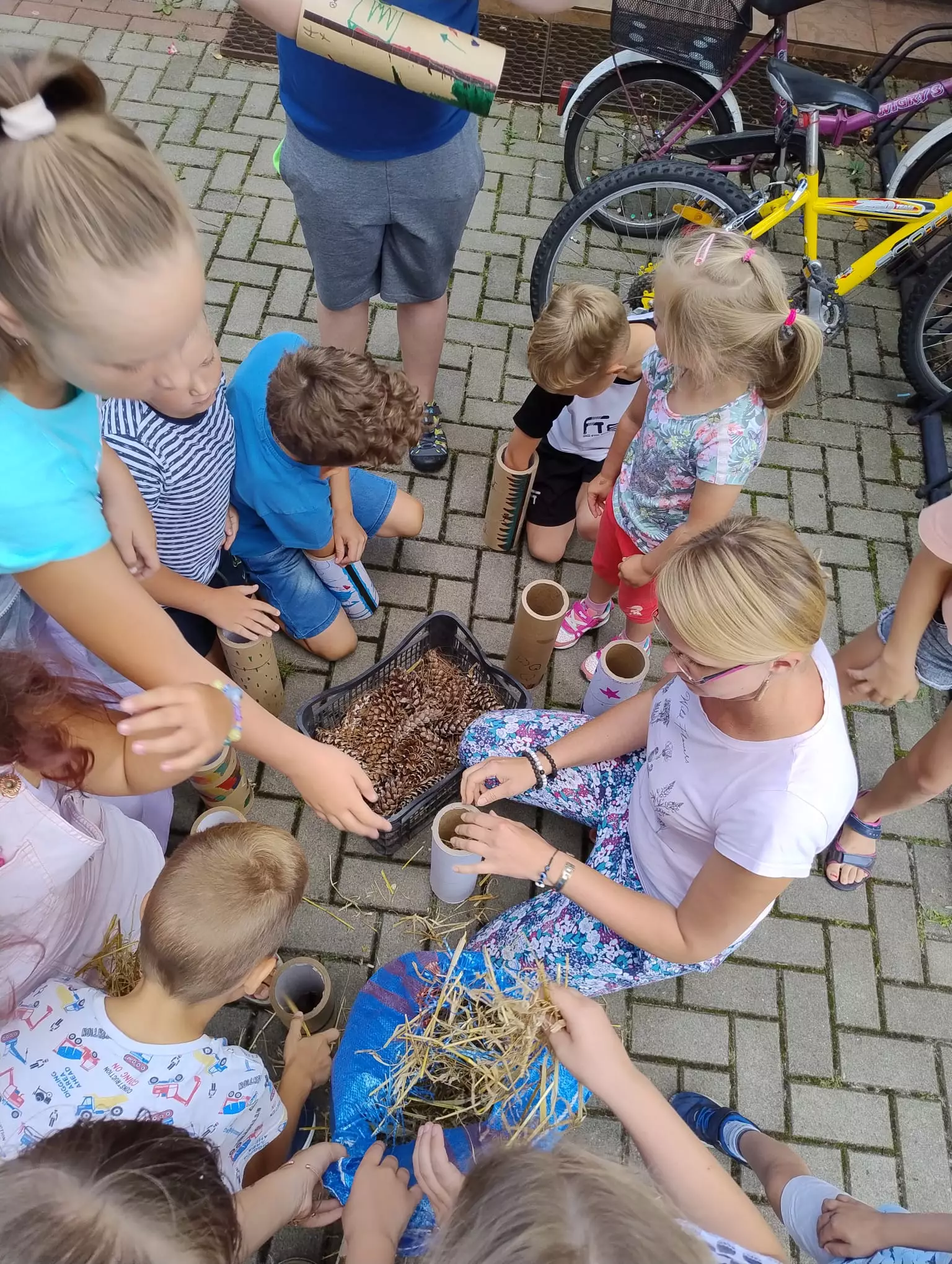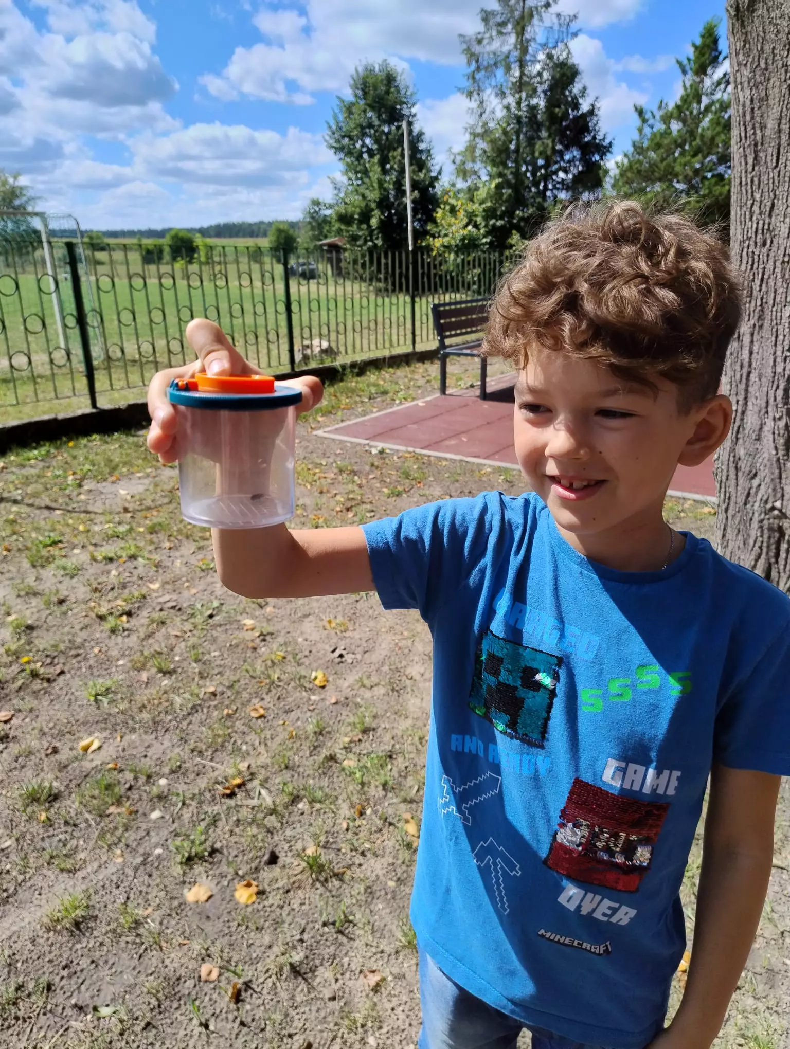 Dzieci oglądają przez lupę zwierzątka żyjące w ziemi.Chłopcy obserwują przez lupę owady i zapisują notatki na kartce.Chłopczyk pokazuje złapanego owada w pojemniczku.Dzieci łapią siatką owady i zamykaja je w plastikowym pojemniku w celu obserwacji.Dzieci pisza notatkę o złapanych owadach, które trzymają w pojemniku.Chłopczyk trzyma w ręku owad a reszta uczestników mu się przygląda.Dzieci kolorowymi mazakami malują tekturowe tuby tworząc domki dla owadów.Uczestnicy zajęć wraz z panią instruktorką układają puzzle.Dzieci wkładają do pomalowanych tub siano i szyszki tworząc domki dla owadów.Dzieci wkładają do pomalowanych tub siano i szyszki tworząc domki dla owadów.Dzieci siedzą przy stoliku i malują tekturowe tuby kolorowymi mazakami tworząc domki dla owadów.Uczestnicy zajęć przez lupę oglądają owady.
