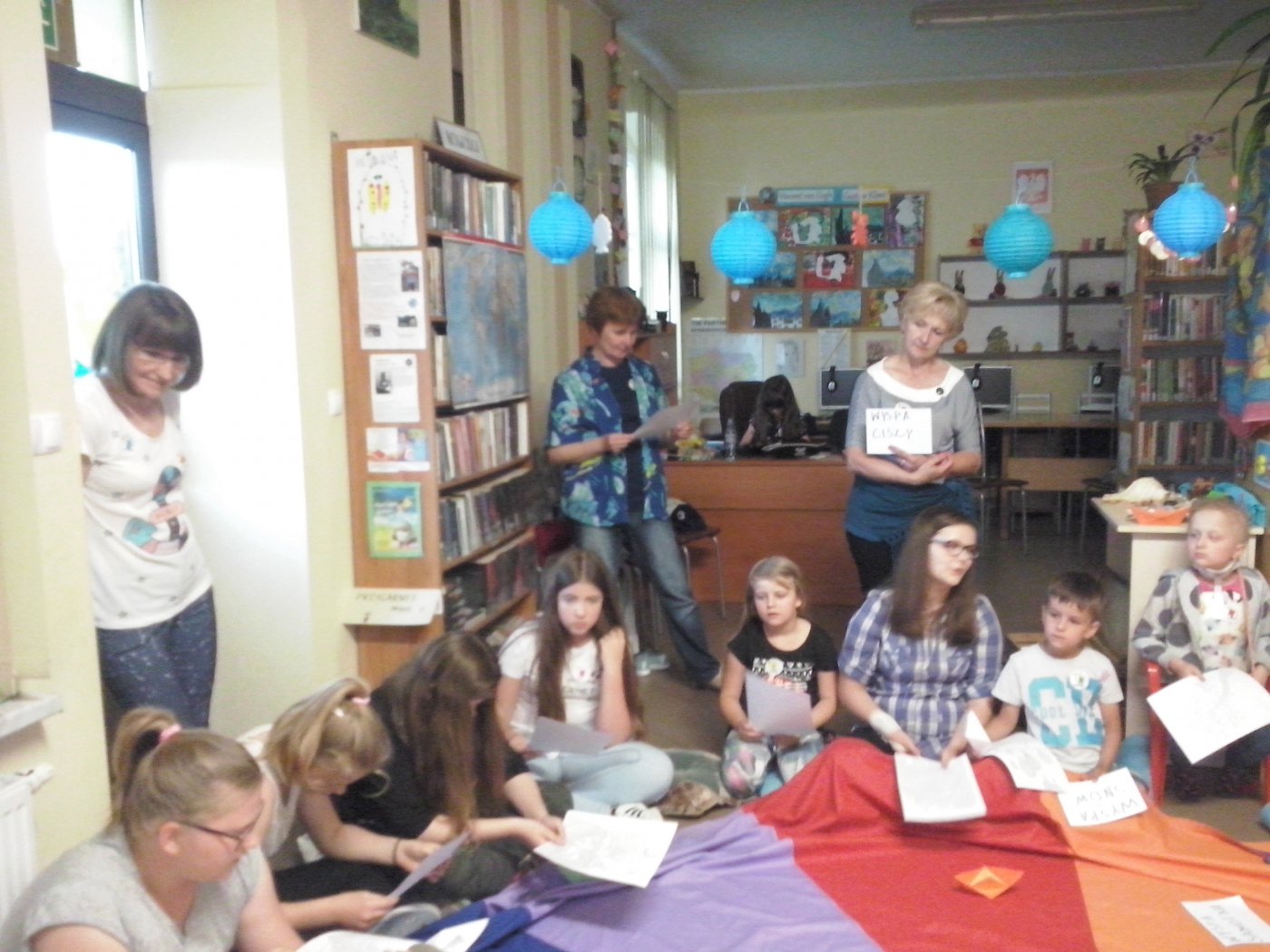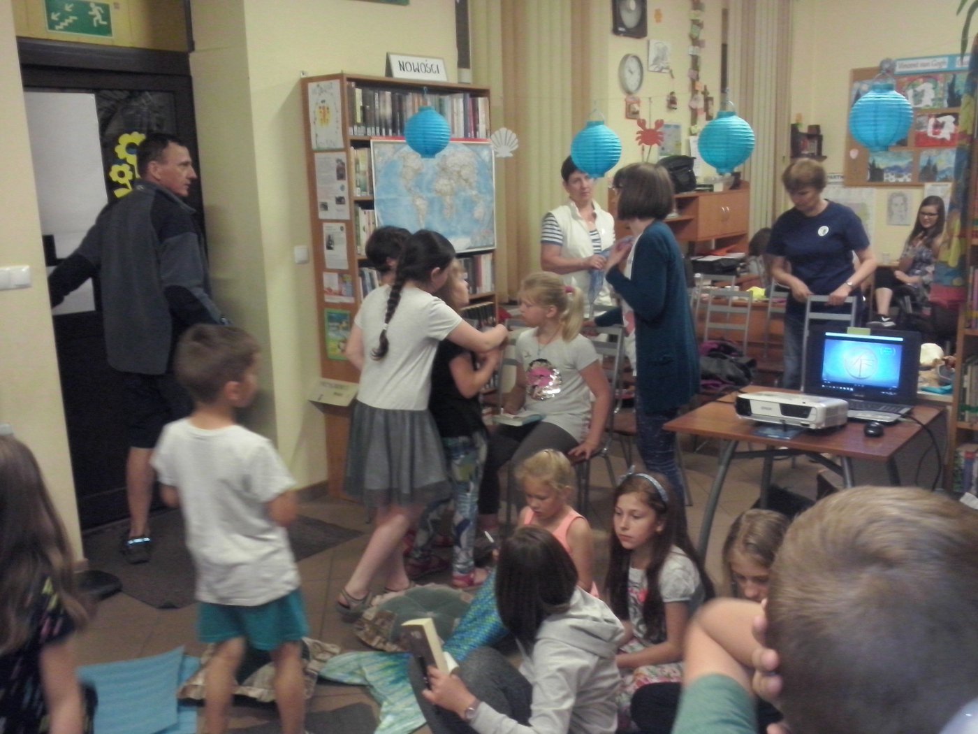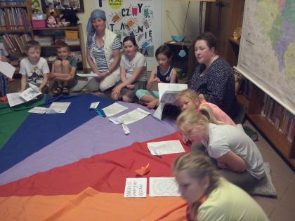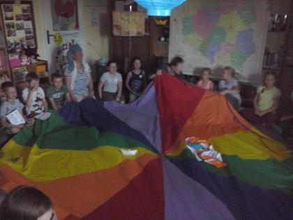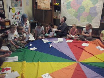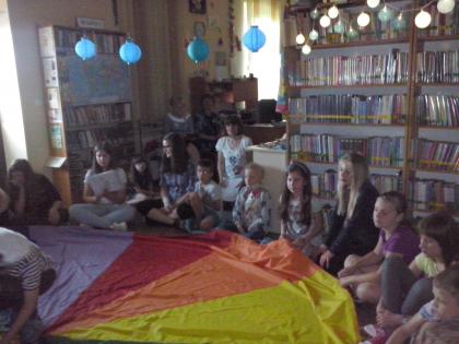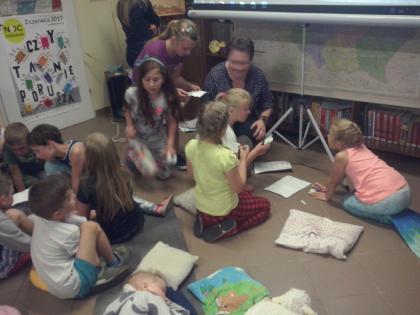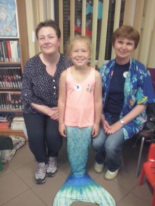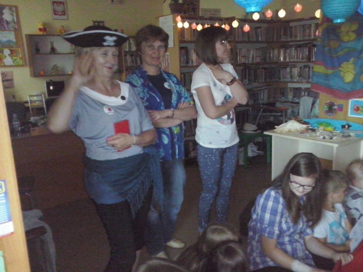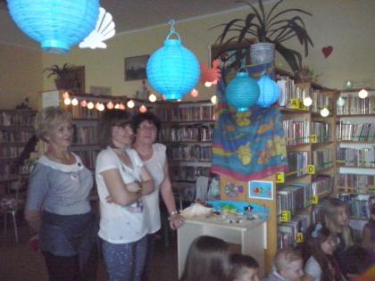 Jako że noc bibliotek ma w sobie coś magicznego, ocean zamienił się w statek, na który szybko weszliśmy i po chwili zobaczyliśmy, że wokół niego pływa mnóstwo ryb. Pod pokładem znaleźliśmy dwie wędki i każdy mógł złowić sobie rybkę. Okazało się, że były to ryby literackie, każda miała dla nas bajkową zagadkę do odgadnięcia. Spostrzegawcze dzieci znalazły także, przy burcie statku, butelkę z listem, w którym były zaszyfrowane wiadomości dotyczące ukrytego, na półkach w bibliotece, skarbu. Informacje były zapisane kodem Morse"a, ale dostaliśmy także podpowiedź, chyba od złotej rybki, i dzieci szybko uporały się z odczytaniem listu. Skarbem były oczywiście KSIĄŻKI.