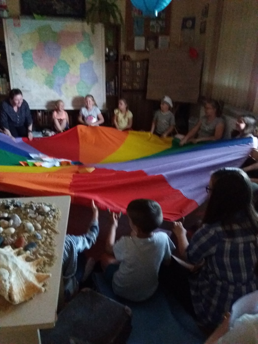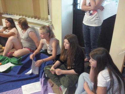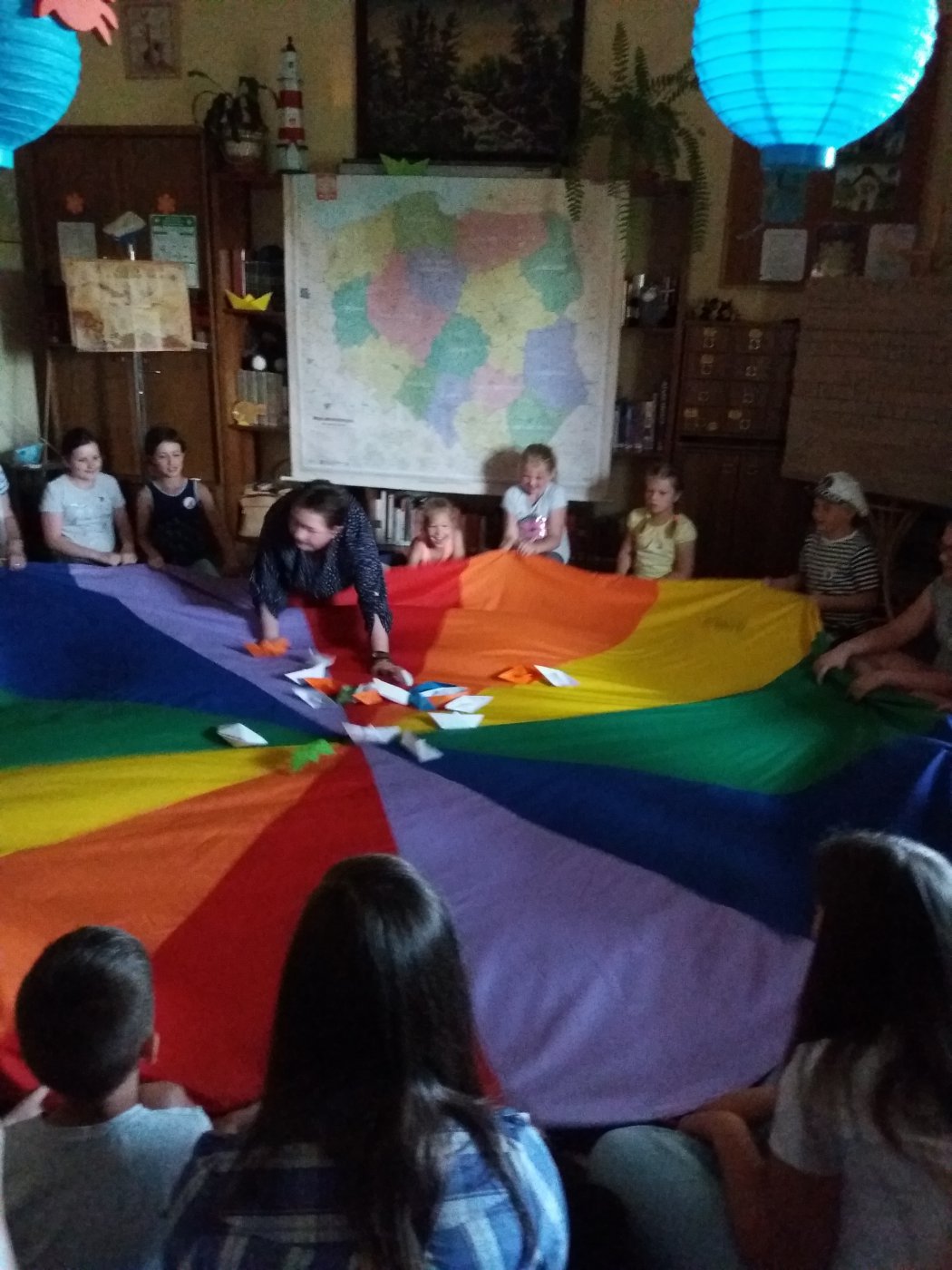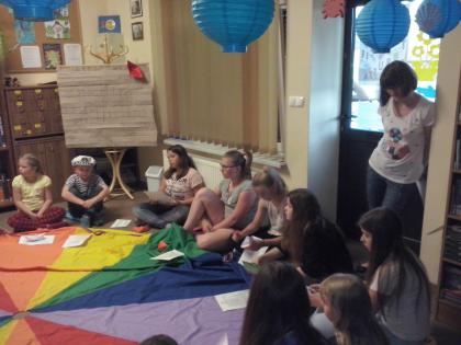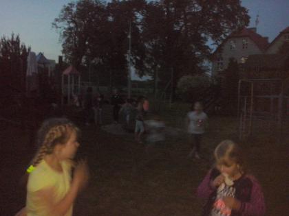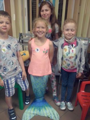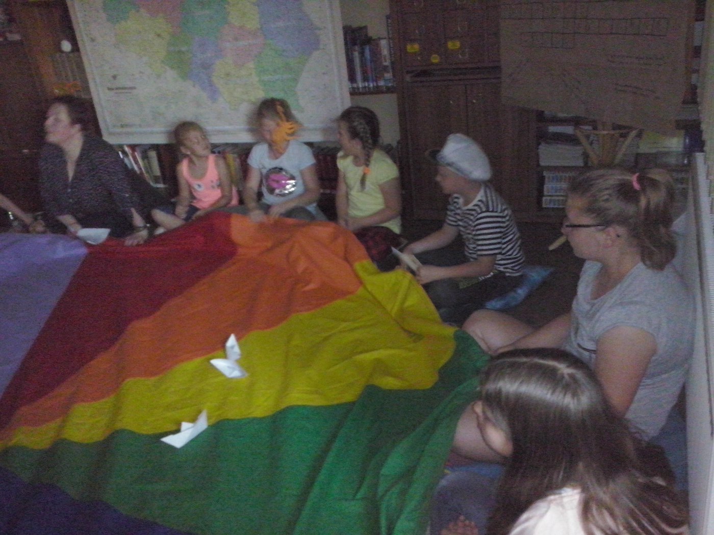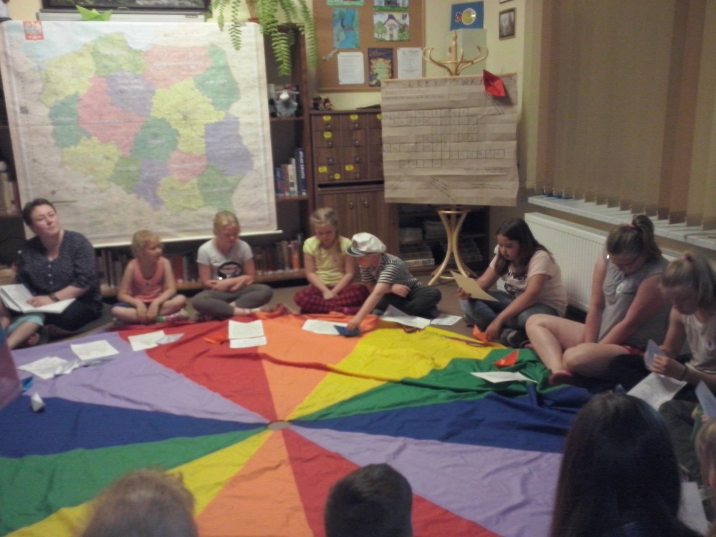 Jako że noc bibliotek ma w sobie coś magicznego, ocean zamienił się w statek, na który szybko weszliśmy i po chwili zobaczyliśmy, że wokół niego pływa mnóstwo ryb. Pod pokładem znaleźliśmy dwie wędki i każdy mógł złowić sobie rybkę. Okazało się, że były to ryby literackie, każda miała dla nas bajkową zagadkę do odgadnięcia. Spostrzegawcze dzieci znalazły także, przy burcie statku, butelkę z listem, w którym były zaszyfrowane wiadomości dotyczące ukrytego, na półkach w bibliotece, skarbu. Informacje były zapisane kodem Morse"a, ale dostaliśmy także podpowiedź, chyba od złotej rybki, i dzieci szybko uporały się z odczytaniem listu. Skarbem były oczywiście KSIĄŻKI.