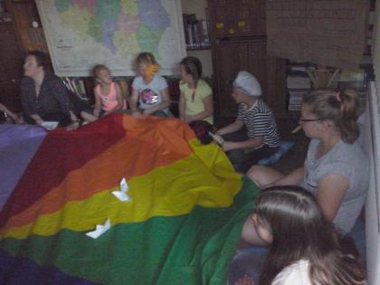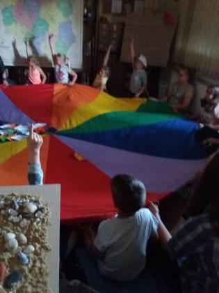 Po przywitaniu wszystkich uczestników, rozwiązaliśmy krzyżówkę, której hasło brzmiało: PODRÓŻE. Wychodząc od tego tematu, porozmawialiśmy o podróżowaniu i środkach lokomocji, zarówno najnowocześniejszych, jak i tych najstarszych, do których niewątpliwie należy statek. Usiedliśmy więc wokół kolorowej chusty, która w tym momencie stała się oceanem, a na nim pojawiły się nasze łódki. Najpierw odważni chłopcy, a później i dziewczynki, po kolei nurkowali w głębiny wody, aby wyłowić tabliczkę z nazwą wyspy. Co i rusz woda wzburzała się, za sprawą silnych wiatrów i sztormu, wyrzucając na powierzchnię morskie zwierzęta. Było to nieco dziwne, bo okazało się, że nasz ocean nazywał się Bardzo Spokojny…