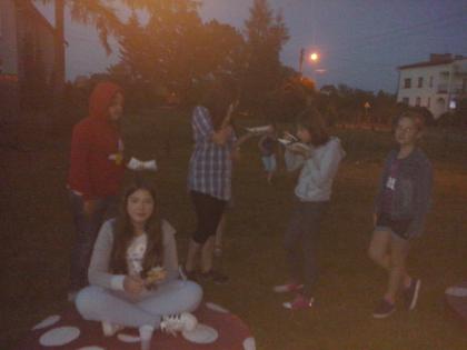 Po powrocie z podróży, udaliśmy się do ogrodu, aby się posilić pyszną kiełbaską i sałatką muszelkową, a następnie wróciliśmy do biblioteki, żeby na zakończenie spotkania obejrzeć film o przygodach młodych detektywów Mai i Lassego, którzy również musieli rozwiązać zagadkę zaginionego skarbu. Podczas filmu częstowaliśmy się słodkimi muszelkami i sokiem.