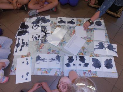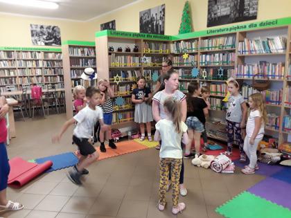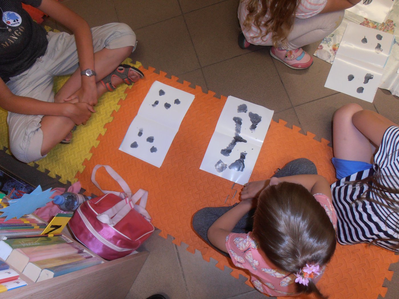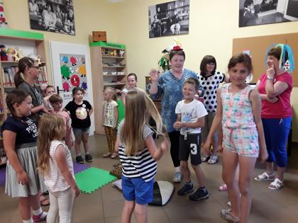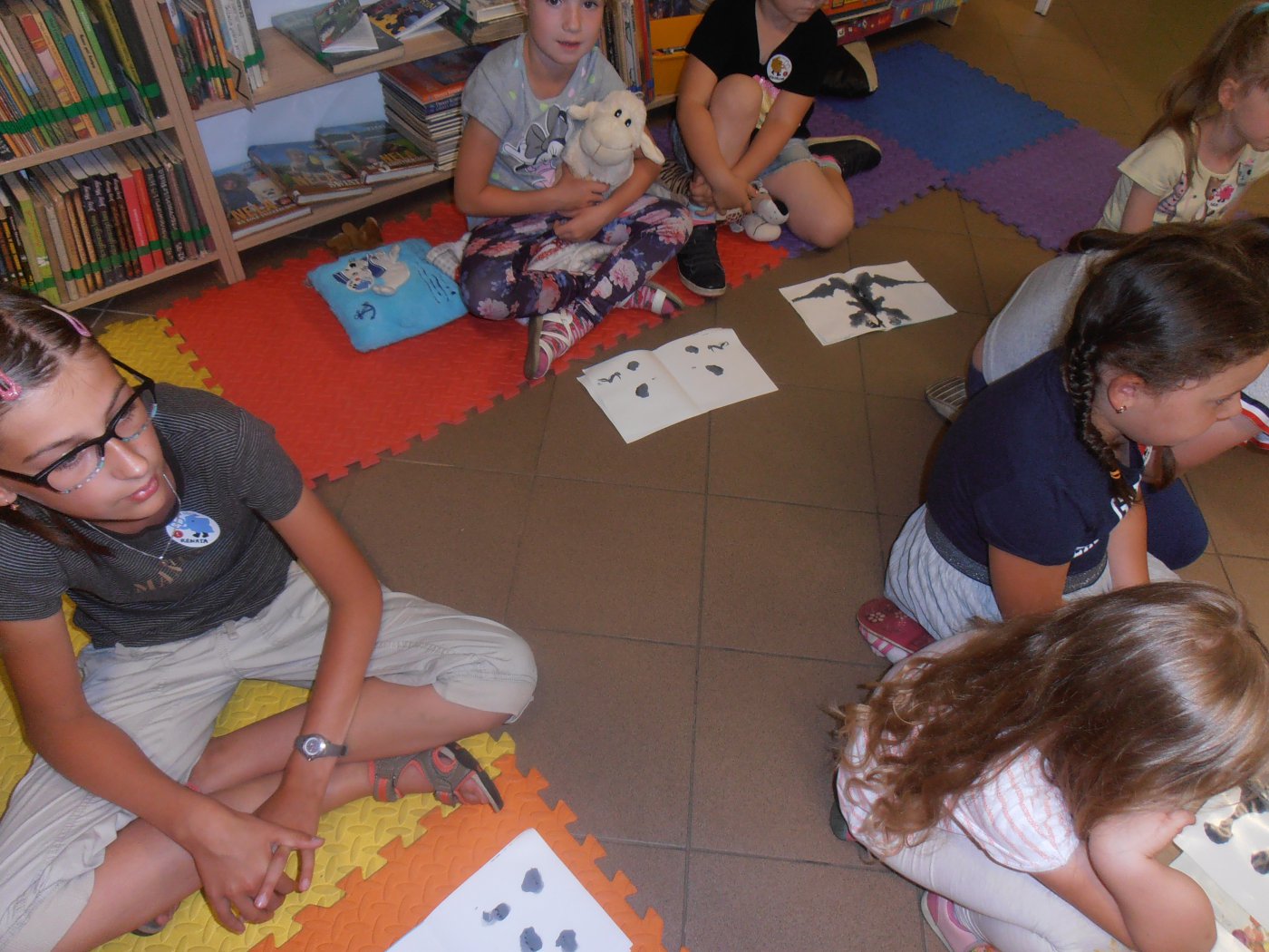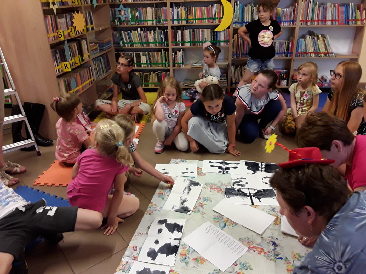 W pierwszej części zabawy przenieśliśmy się do Królestwa Książek, gdzie czekało na nas mnóstwo atrakcji. Zanim zaczęliśmy wędrować wypełniliśmy przestrzeń biblioteczną różnymi odgłosami z podróży, a zaraz potem pociągiem wyobraźni odwiedzaliśmy różne krainy, aby lepiej poznać Królestwo Książek. Jedną z nich była Akademia Pana Kleksa, w której wzięliśmy udział w lekcji kleksografii i przędzenia liter. Podczas pierwszej dzieci wykonały przeróżne kleksy, a podczas drugiej ułożyliśmy ciekawe opowiadanie. Przed przystąpieniem do zadań przeczytaliśmy fragmenty z książki opisujące te lekcje. Za dobrze wykonane ćwiczenia czekała na uczestników nagroda w postaci kolorowych piegów, które, według Pana Kleksa, znakomicie działają na rozum i chronią od kataru. Następnie ugotowaliśmy eliksir, aby wyczarować księgę marzeń, która została na półce w bibliotece i teraz każde dziecko, gdy będzie miało zły humor, może do niej zajrzeć i przenieść się w świat marzeń.