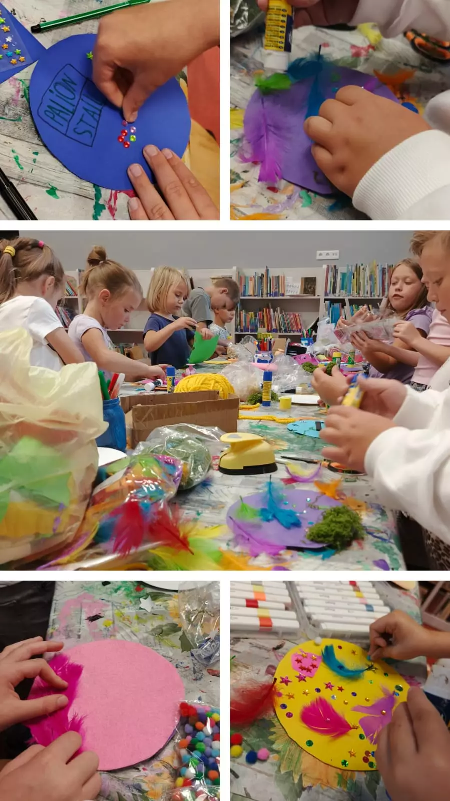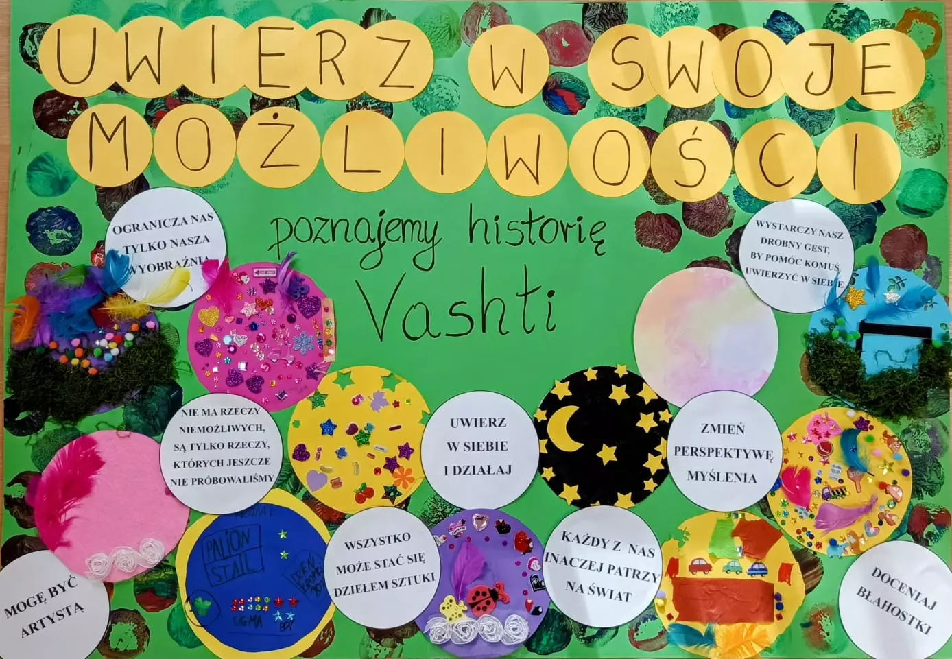 Podczas zajęć dzieci omówiły przesłanie książki, a następnie stworzyły własne, wyjątkowe kropki. Kolejnym zadaniem było odnalezienie kropek, na których ukryte były wiadomości od Vashti zapisane w alfabecie Braille’a. W dalszej części spotkania powstał wspólny plakat, który ma przypominać, aby zawsze wierzyć w swoje możliwości i dążyć do celu.
