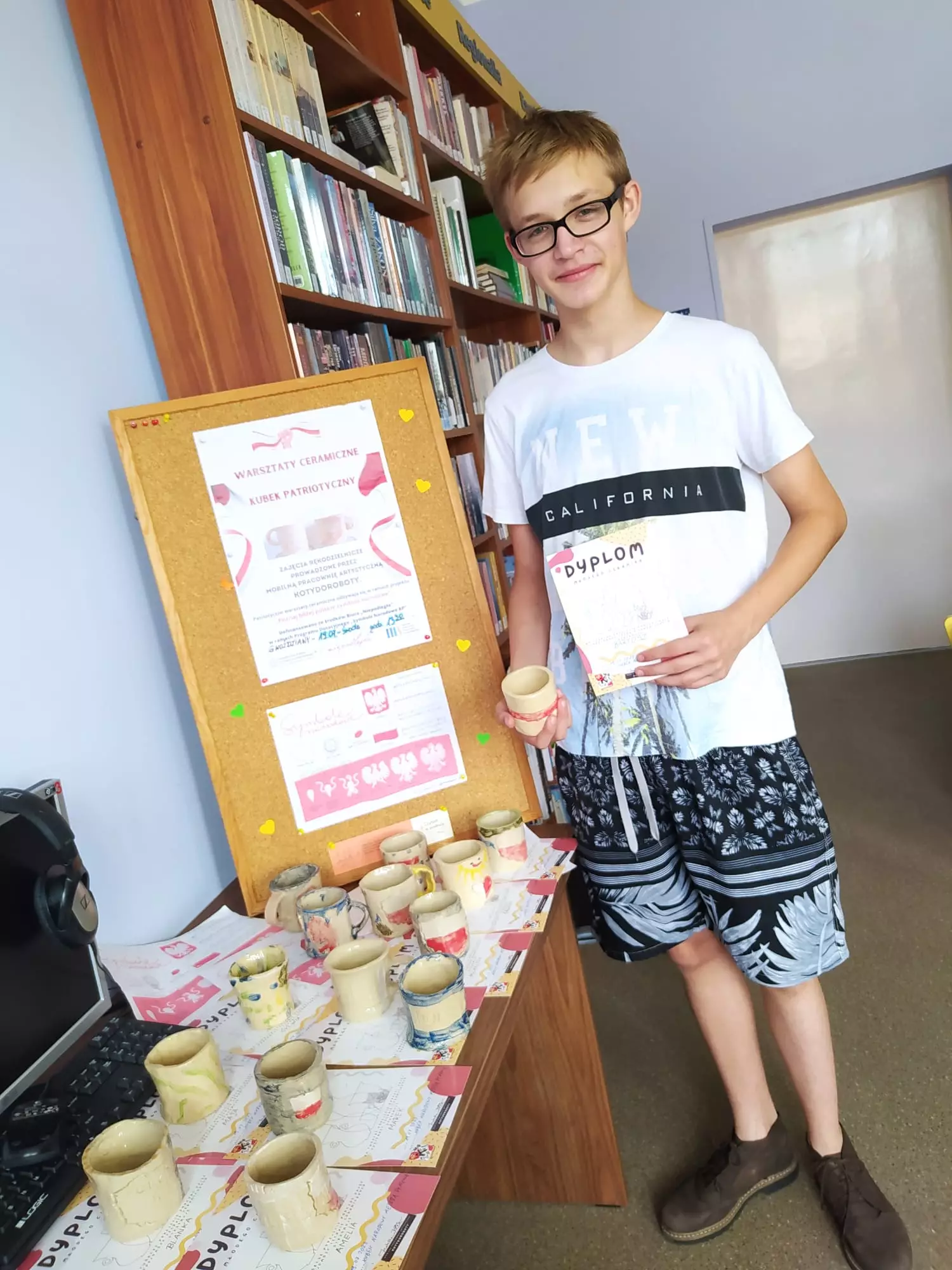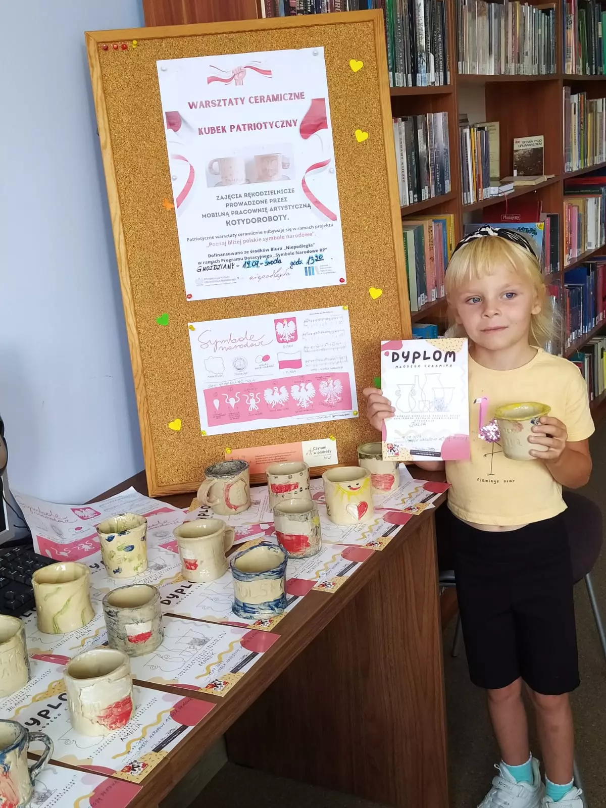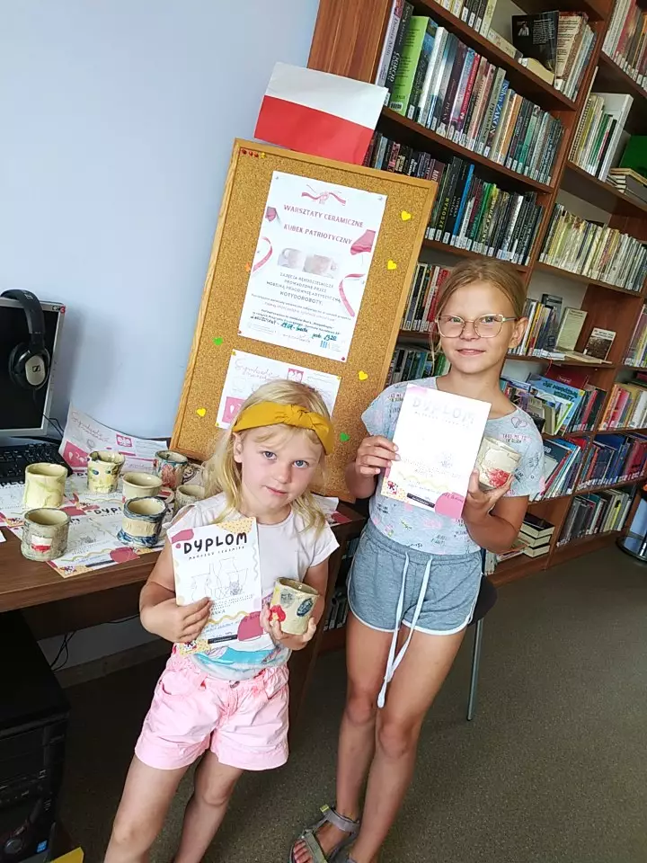 Odbiór kubków patriotycznych w bibliotece w Pawonkowie, Gwoździanach i Kośmidrach.