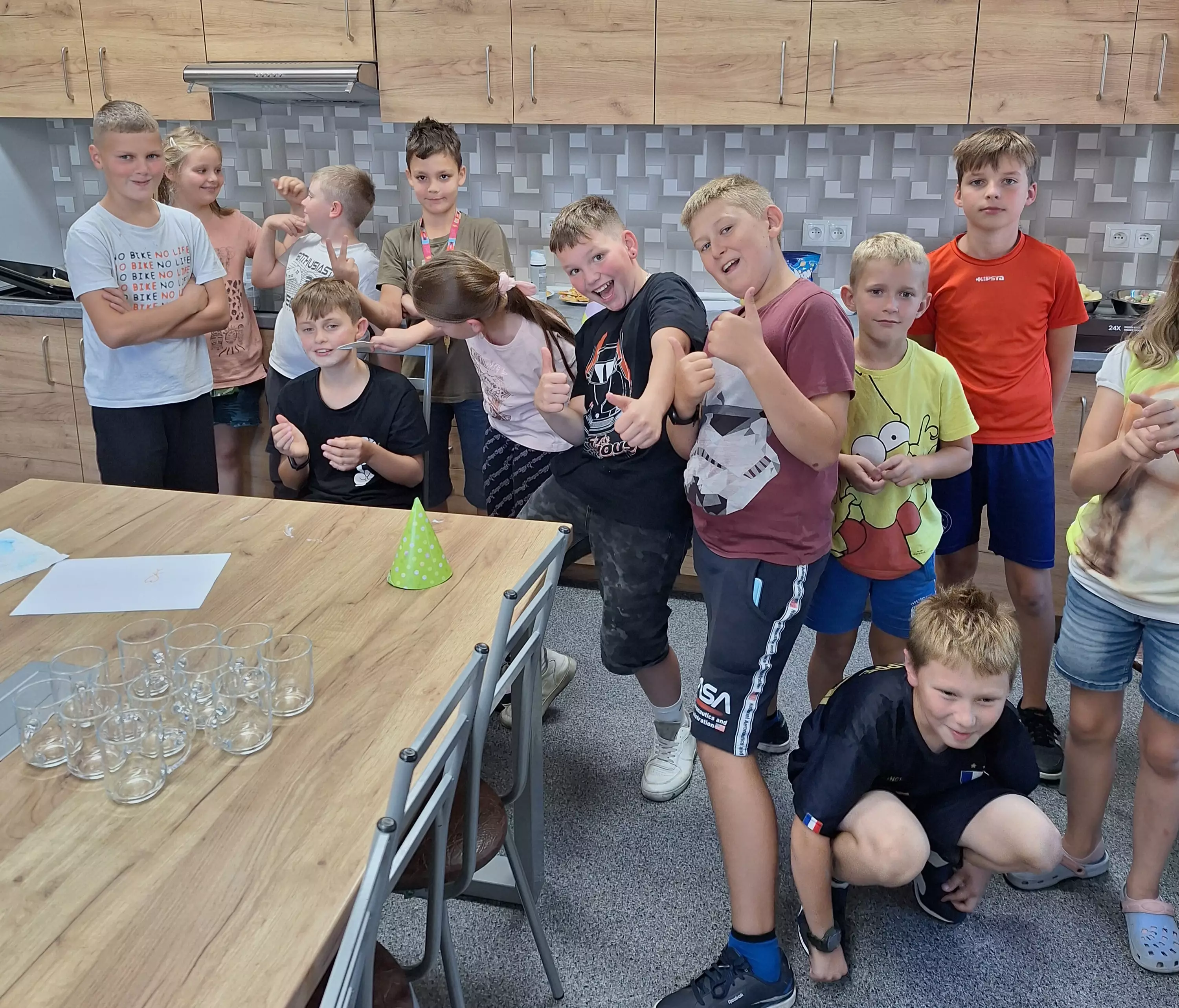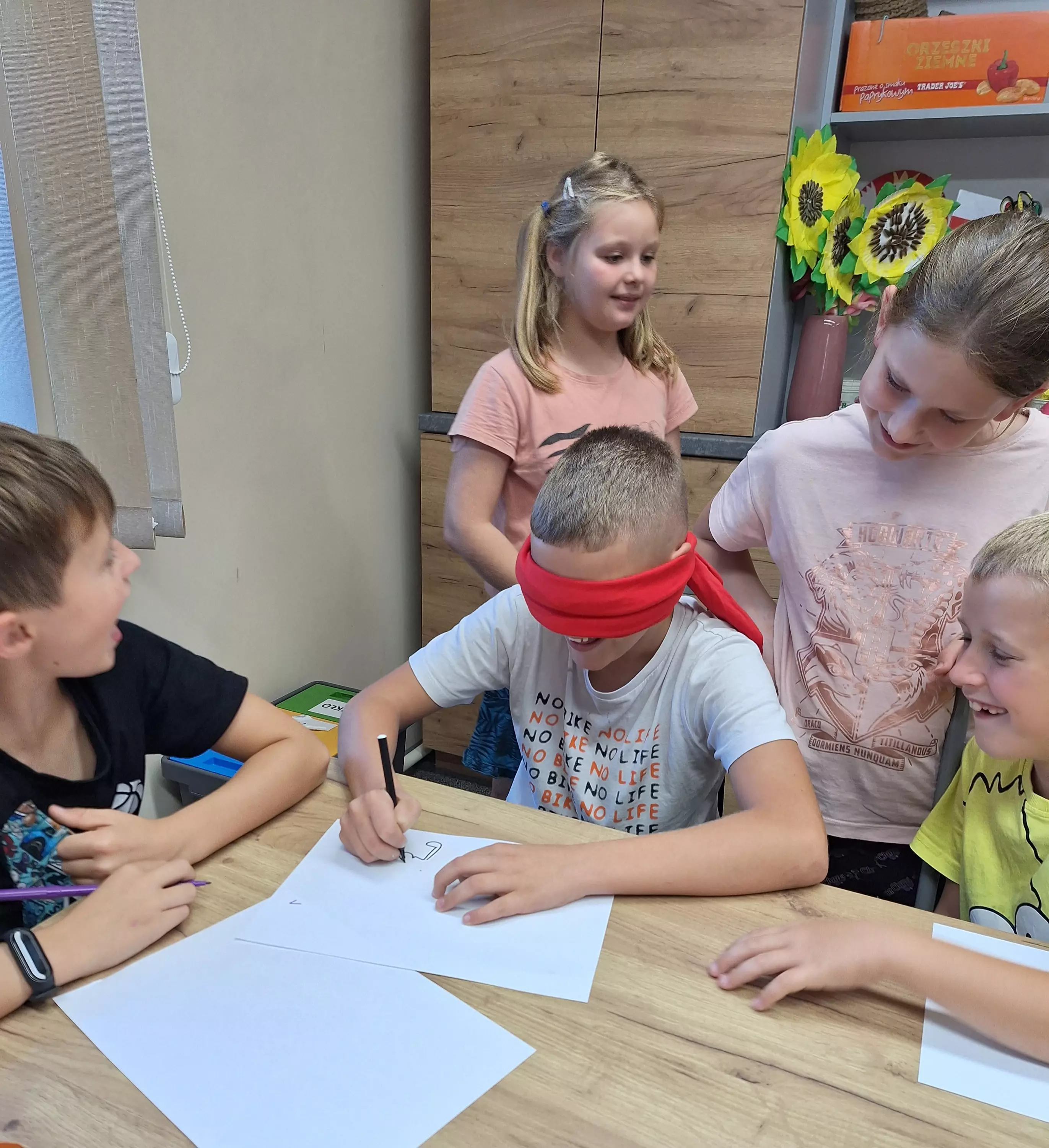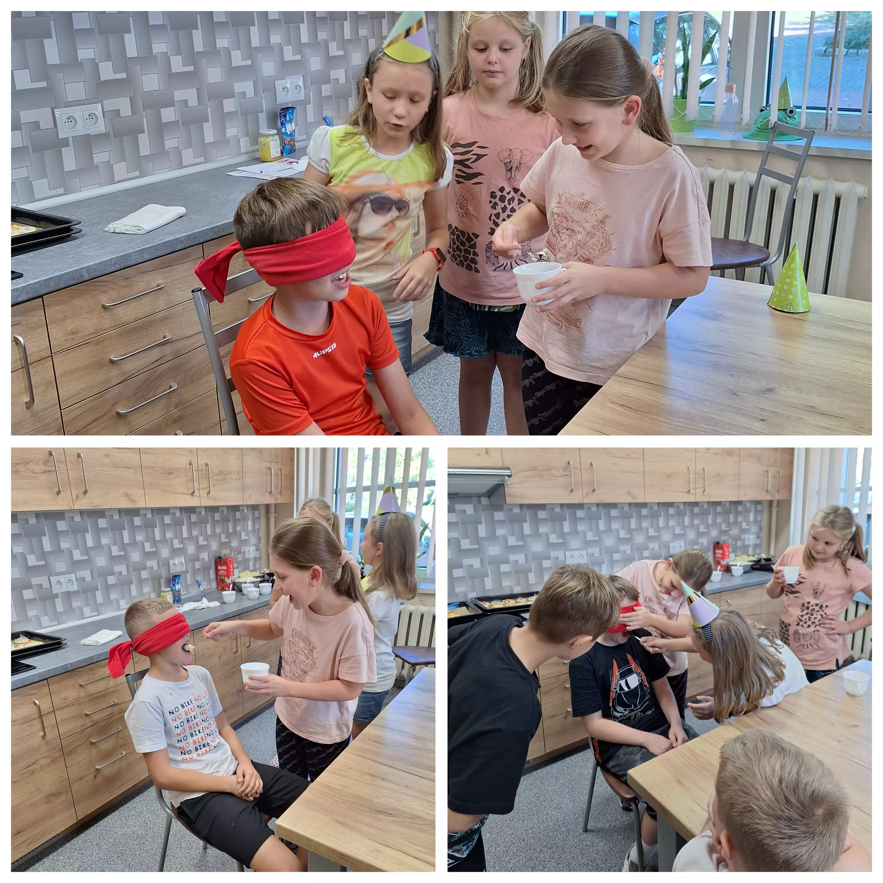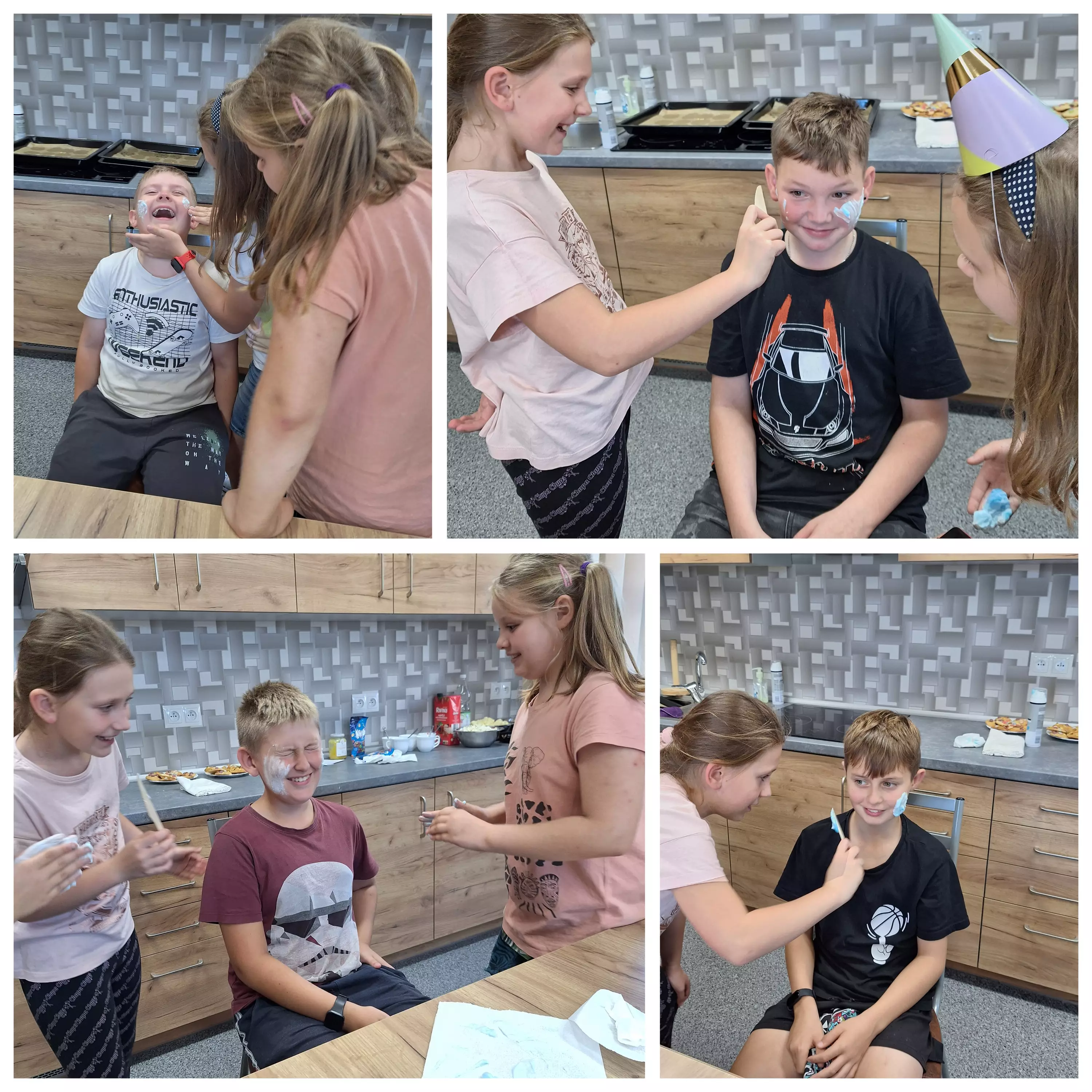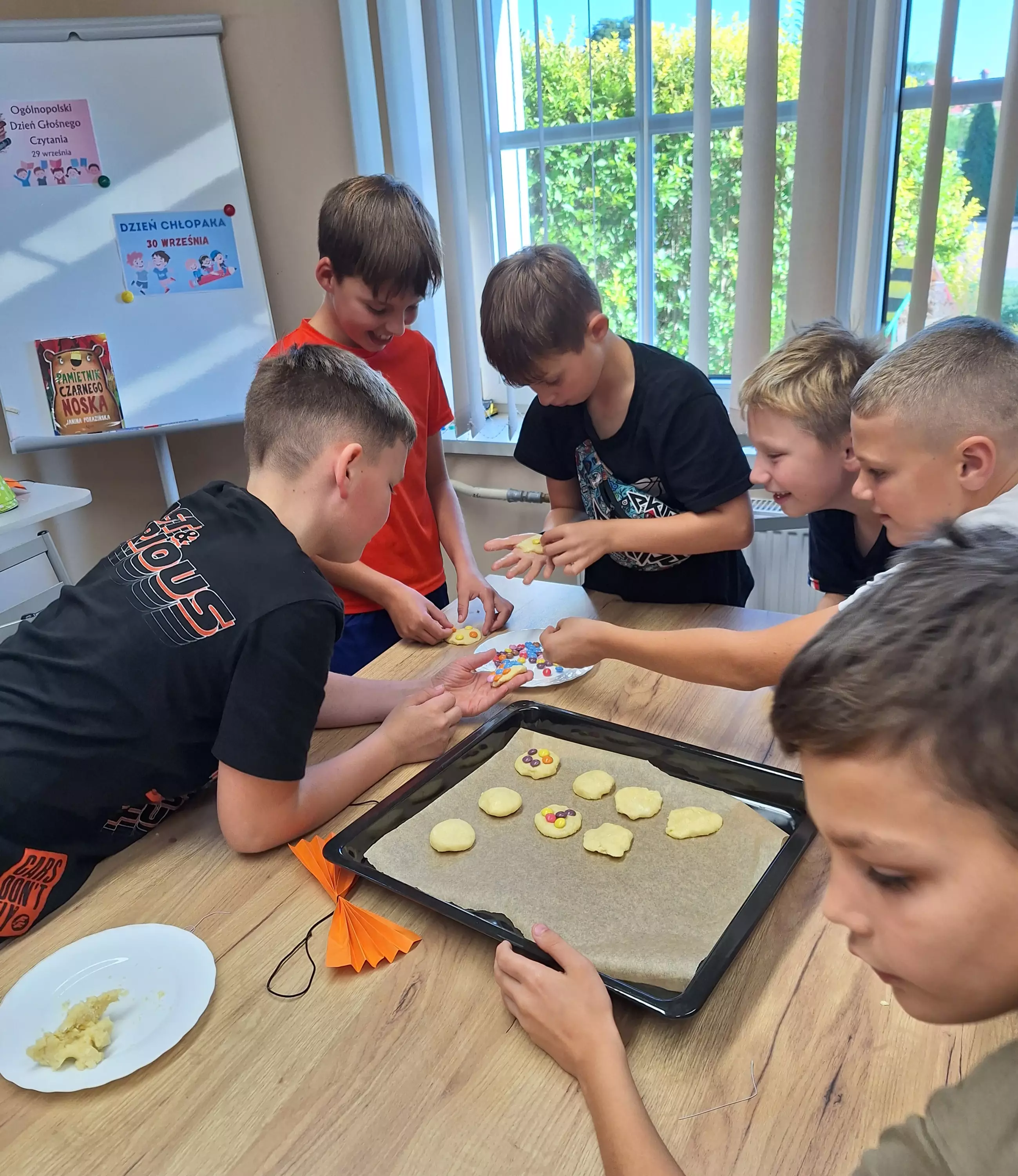 Dziewczyny pieką dla chłopców ciasteczka z kolorowymi drażetkami.Chłopcy siedzą przy stole i słuchają opowiadania czytanego przez uczestnika zajęć.Dzieci bawią się w zabawę Niewidomy rysuje.Dzieci bawią się w zabawę rysując z zamkniętymi oczami.Dzieci pozują do grupowego zdjęcia.Poczęstunek po zajęciach z okazji Dnia Chłopaka.Kolaż zdjęć przedstawia zabawę polegającą na goleniu brody plastikowym patyczkiem.Kolaż zdjęć przedstawia zabawę Skosztuj co to za smak.