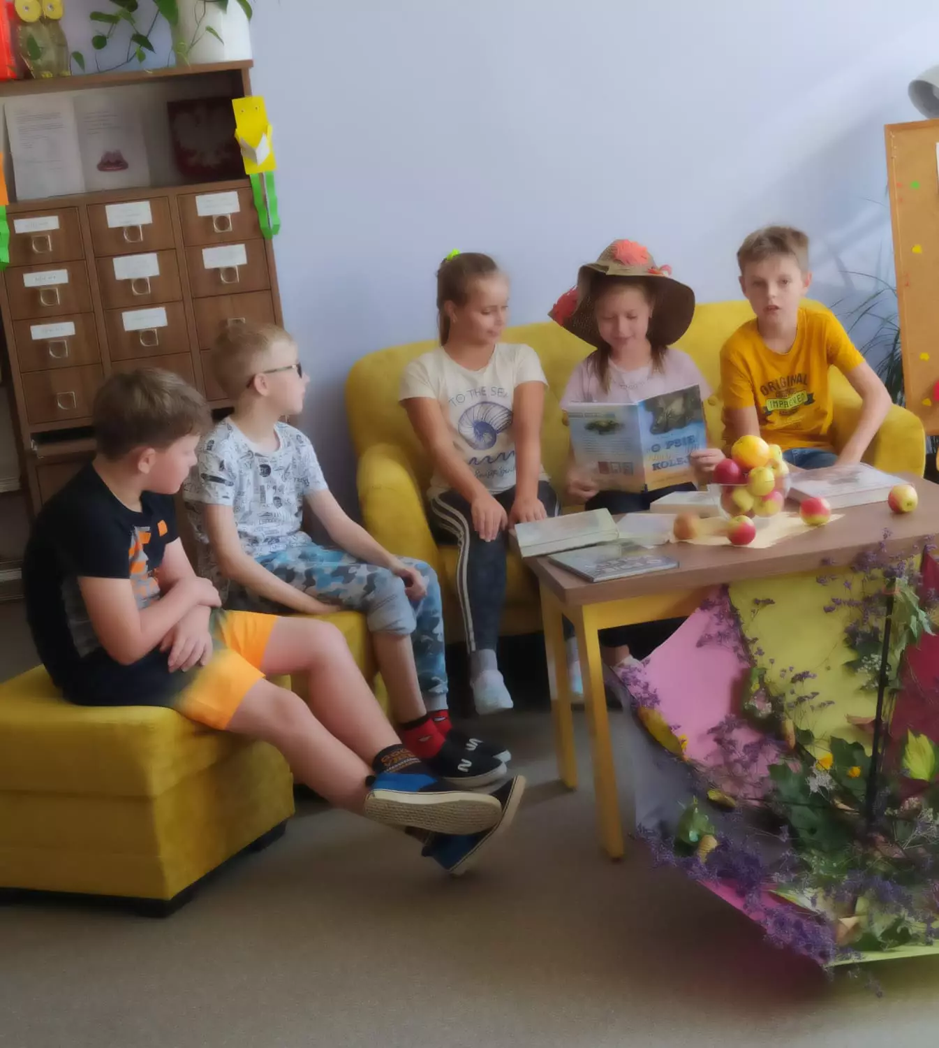 Uczniowie słuchają czytanej książki.Uczennica czyta książkę a reszta dzieci jej słucha.Gazetka biblioteczna.Dzieci słuchają czytanej książki w bibliotece.Zdjęcie grupowe po zajęciach.