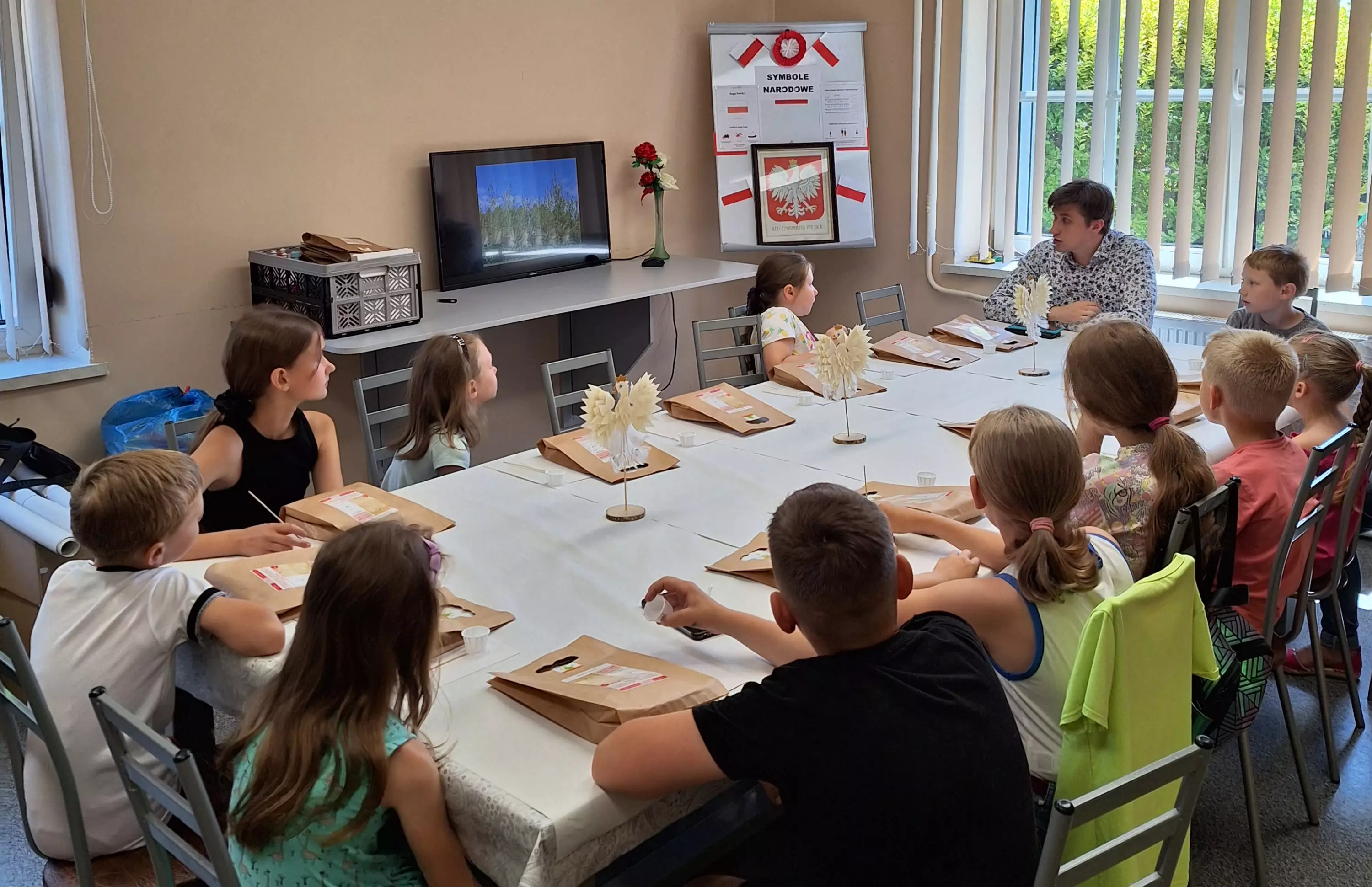 Prelekcja na temat symboli narodowych.Uczestnicy spotkania wykonują statuetkę Orła Białego.Chłopczyk i dziewczynka wykonują statuetkę orzełka.Dziewczynka wykleja osikowymi wiórkami statuetkę orzełka.Dzieci wyklejają statuetkę Orła Białego.Zdjęcie grupowe po zajęciach rękodzielniczych.Dzieci siedzą przy wspólnym stole i słuchają prelekcji na temat symboli narodowych.Dzieci wykonują statuetkę Orła Białego z osikowych wiórków.Uczestnicy spotkania oklejają statuetkę orła wiórkami osikowymi.Dzieci trzymają w rękach statuetkę Orła Białego.Dzieci siedzą przy stoliku i wykonują pracę plastyczną.Dzieci słuchają historii powstania Osikowej Doliny.Zdjęcie grupowe po warsztatach rękodzielniczych.Dzieci siedzą przy stole i wyklejają statuetkę Orła Białego wiórkami osikowymi.PlakatyUczestniczki warsztatów wyklejają wiórkami osikowymi statuetkę Orła Białego.