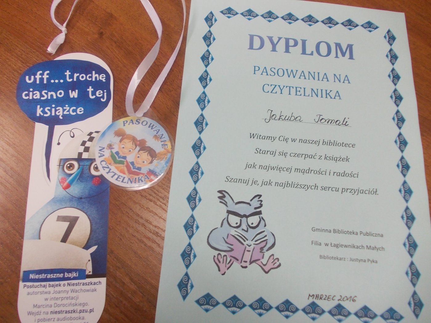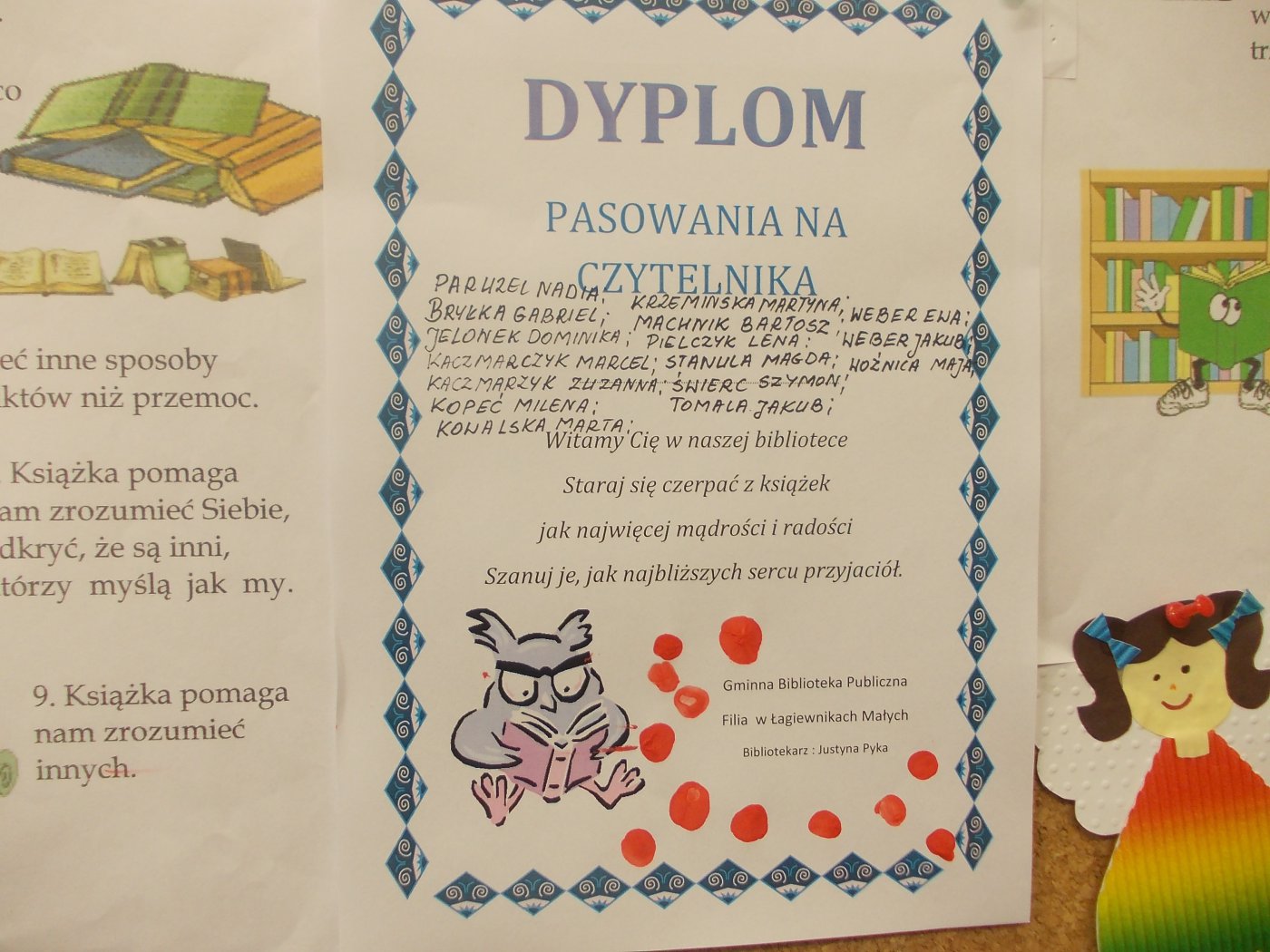 W dniu 02 03. 2016 w bibliotece w Łagiewnikach Małych odbyło się pasowanie na czytelnika. 16 przedszkolaków złożyło przyrzeczenie iż będą szanować i czytać książeczki, swoim paluszkiem przypieczętowały przysięgę w obecności bibliotekarki Justyny Pyka i pani nauczycielki Anety Kandora.