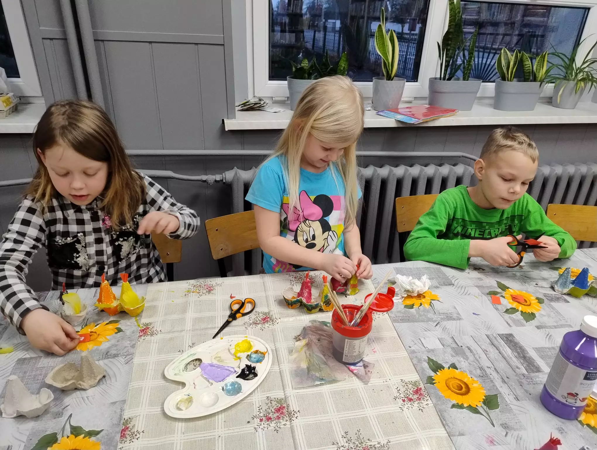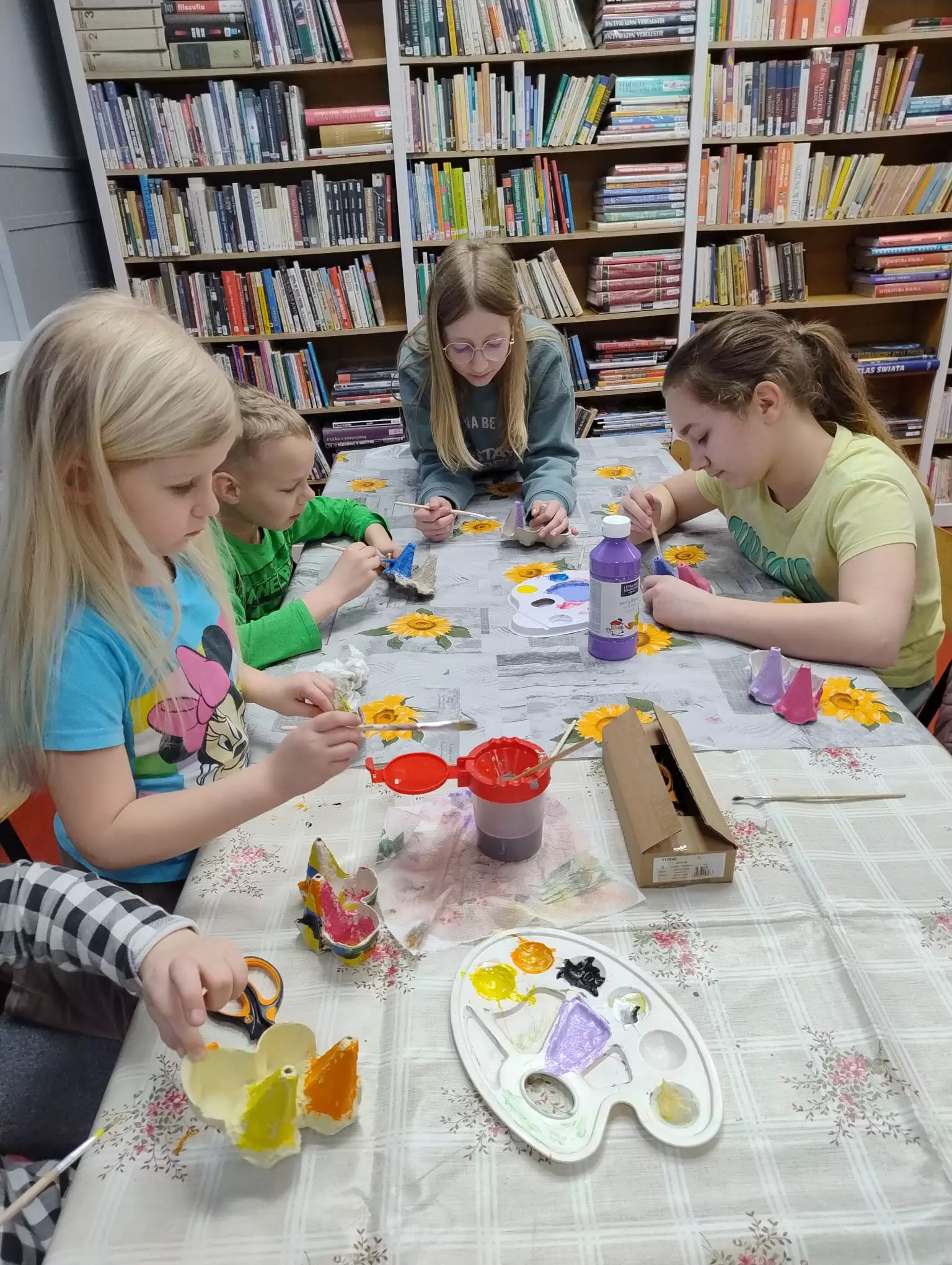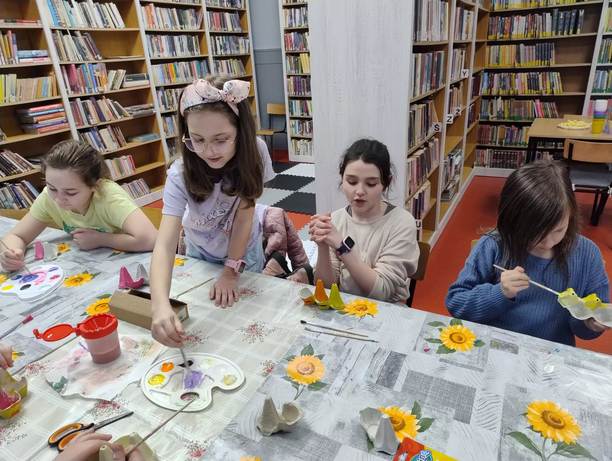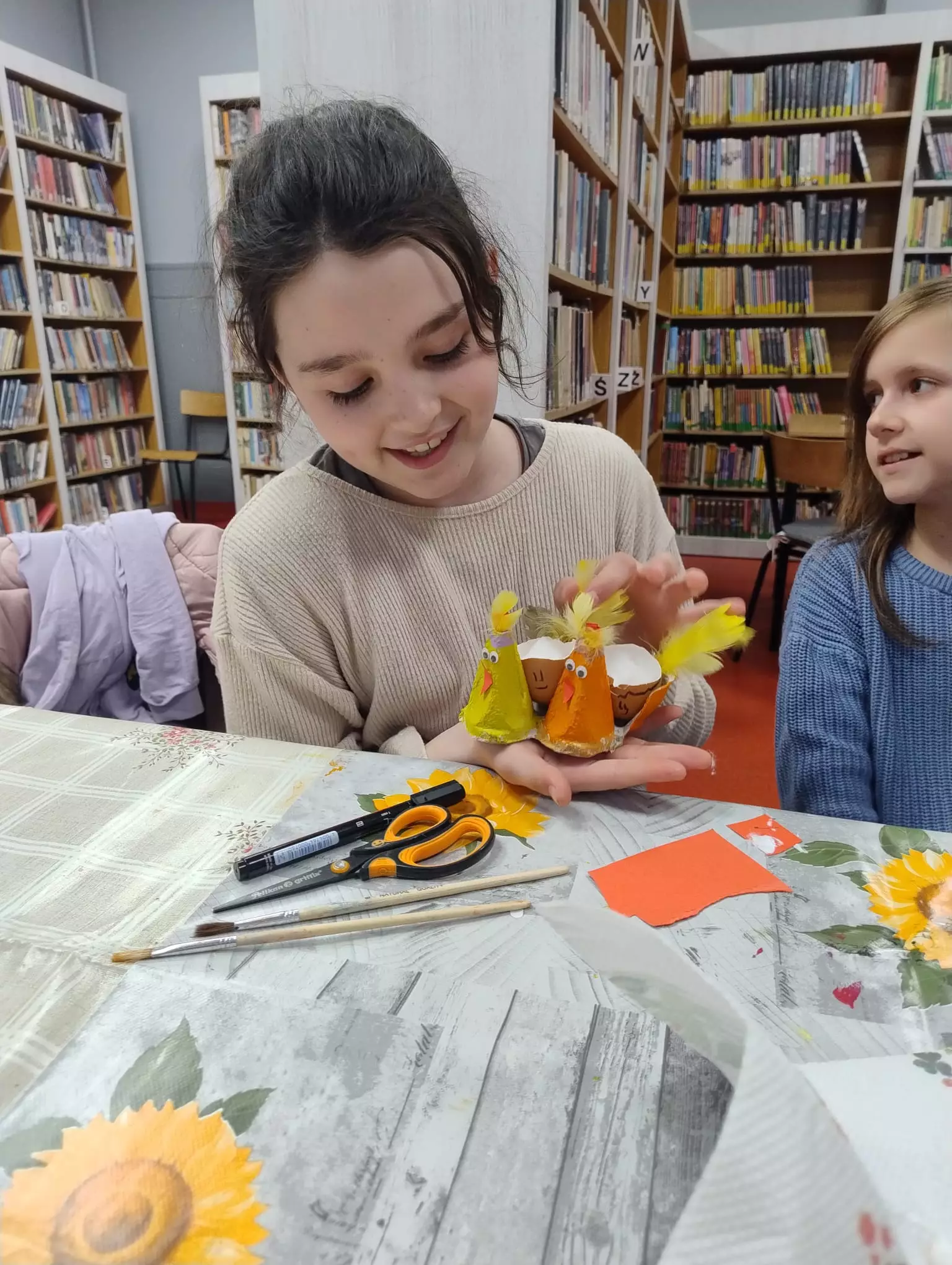 Dzień później na piątkowych zajęciach literacko-plastycznych w bibliotece w Łagiewnikach Małych tematem zajęć były zbliżające się Święta Wielkanocne oraz Światowy Dzień Poezji, który przypada na dzień 21 marca. Dzieci wysłuchały wierszy o tematyce wiosennej oraz opowiadania "Wielkanoc kurczaczka". Rozwiązywały wiosenne zadania i stworzyły kolorowe kurczaki, w których później mogły zasiać rzeżuchę.
