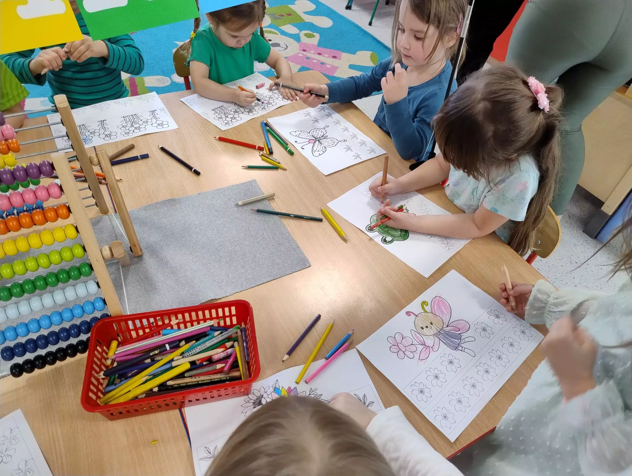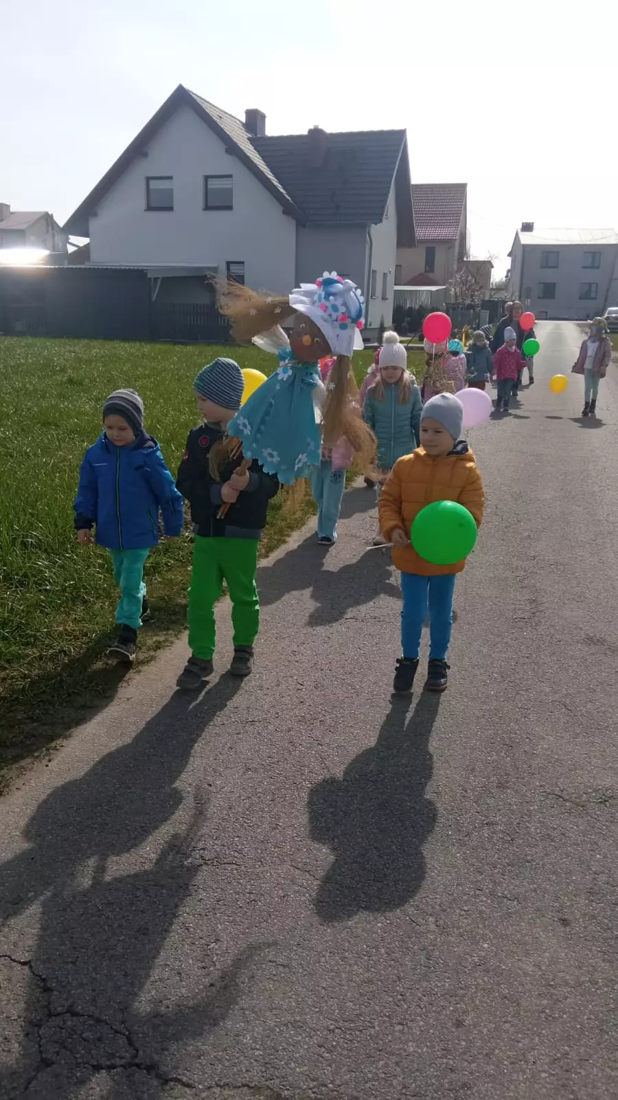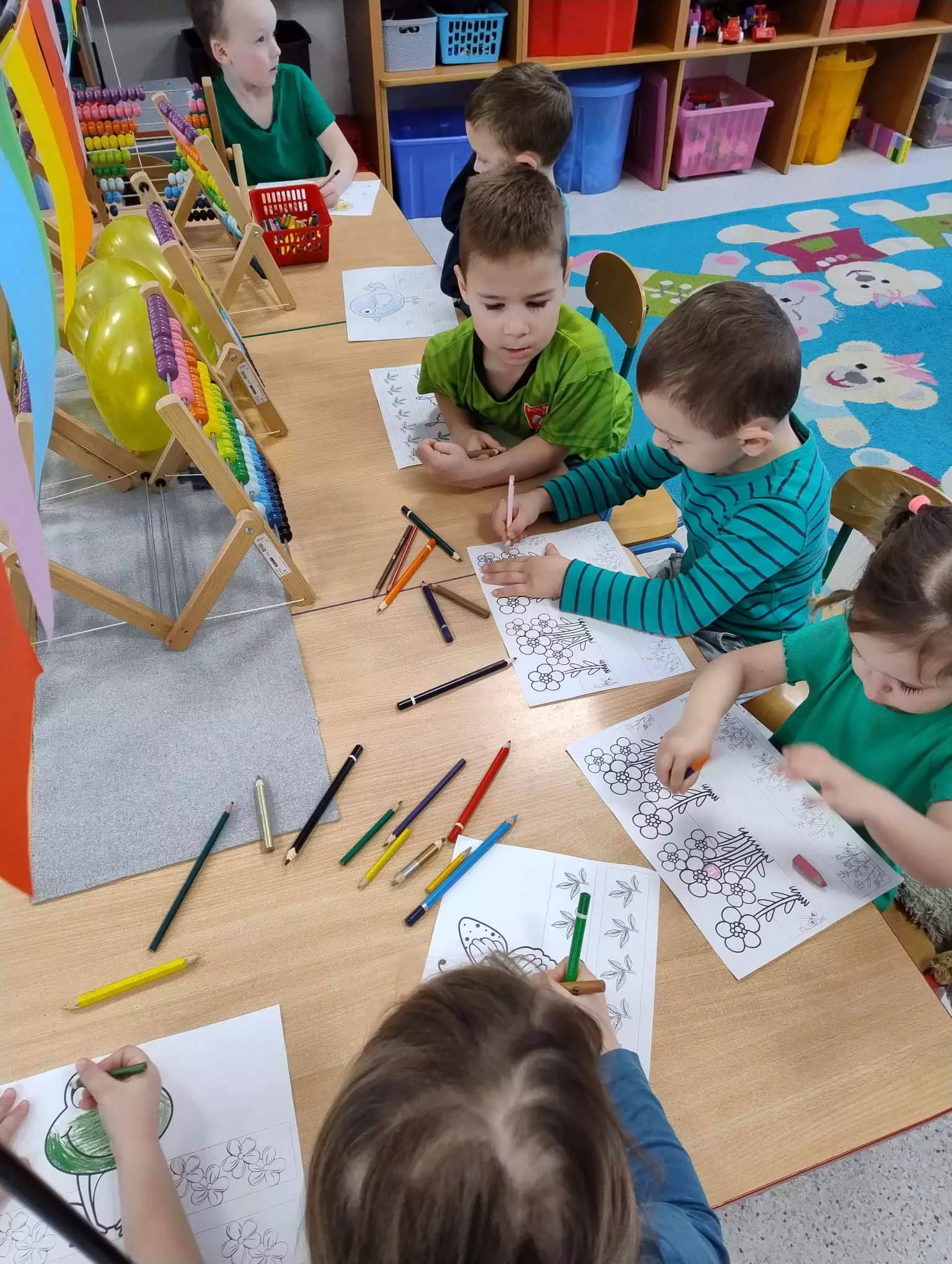 Przedszkolaki leją Marzannę wodą.Przedszkolaki siedzą przy stoliku i kolorują wiosenne kwiaty.Trzy dziewczyny rozwiązują zagadki wielkanocne.Wspólne zdjęcie uczestników zajęć z pracami w rękach.Dziewczynka wykonuje prace plastyczną.Uczestniczka pokazuje swoję kurki wykonane z wytłaczanki po jajkach.Dzieci siedzą przy stole i wycinają kurki z papieru.Dzieci farbami malują papierowe kurki.Dzieci farbami malują papierowe kurki.Przedszkolaki kolorują wiosenne obrazki.Przedszkolaki kolorują wiosenne obrazki.