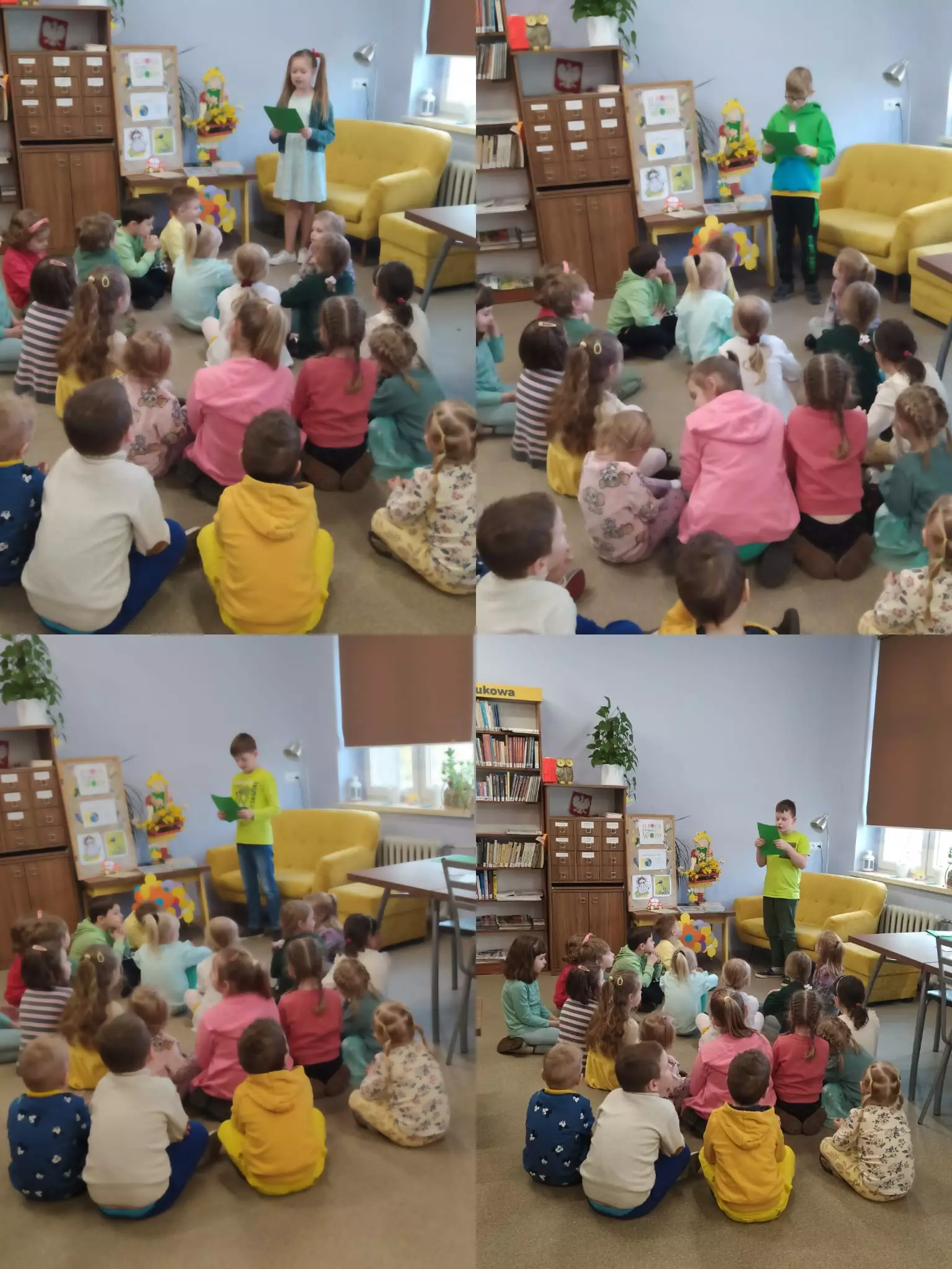 Kolaż zdjęć z zajęć w bibliotece.Kolaż zdjęć z zajęć w bibliotece.Przedszkolaki siedzą na podłodze a uczniowie szkoły podstawowej recytują wiersze.Dzieci siedzą wokół Pani Wiosny i czytają wiersze.Dzieci oglądają pokaz tańca dziewczynki.Dzieci malują obrazek Pani Wiosny.Dzieci idą z Marzanną.Kolaż zdjęć z zajęć w bibliotece.Dzieci pakują Marzannę do pudełka.