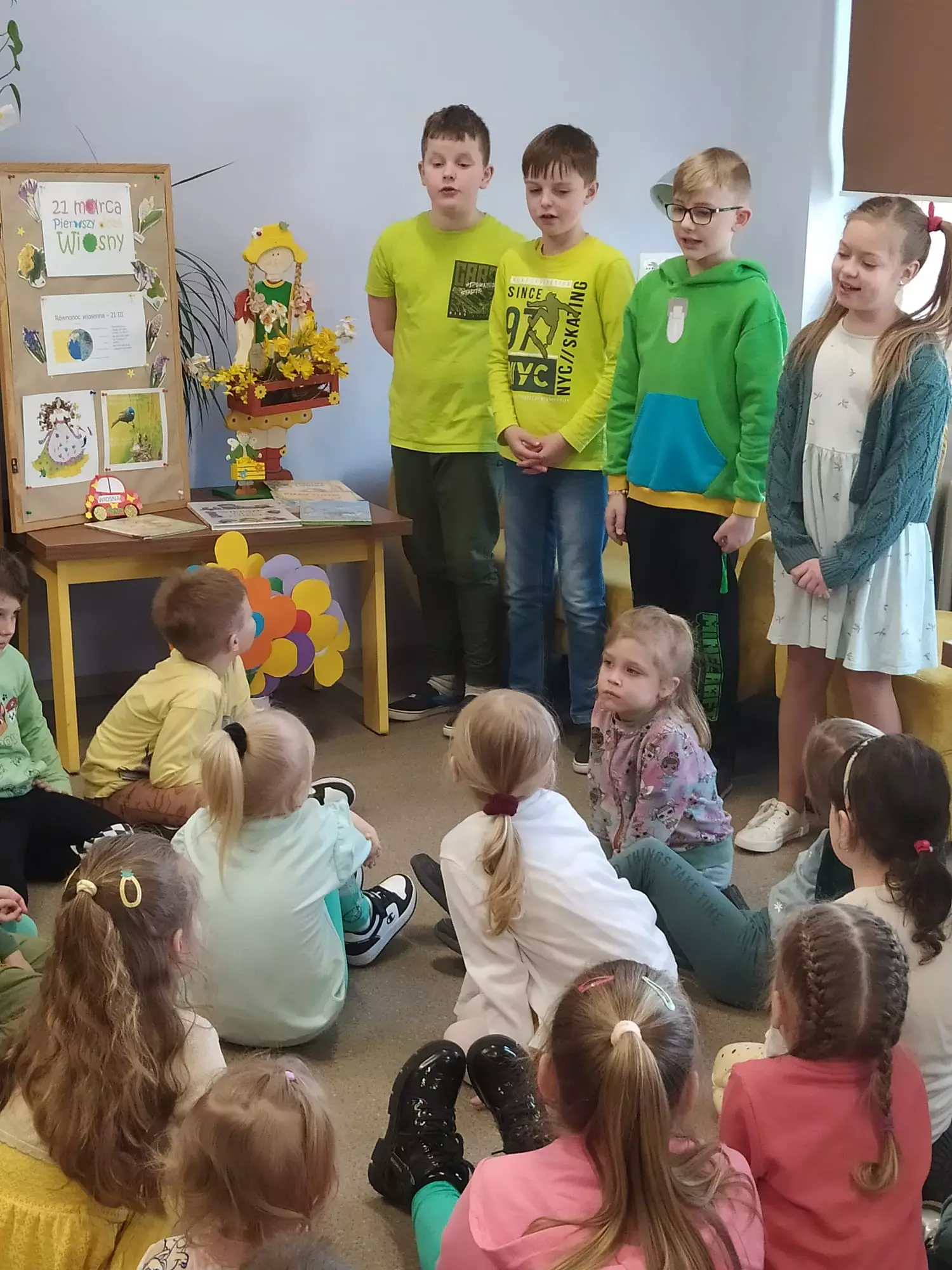 W bibliotece w wiosennym wystroju uczniowie klasy III z okazji Dnia Poezji czytali tematyczne wiersze polskich autorów. Dzieci układały puzzle, wykonały wiosenne kwiaty, świetnie rozwiązywały tematyczne zagadki. Wspólną zabawą, śpiewem i tańcem wyraziły swoją radość z przyjścia nowej pory roku.