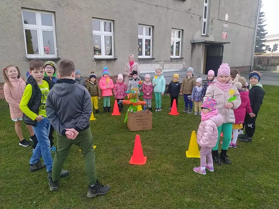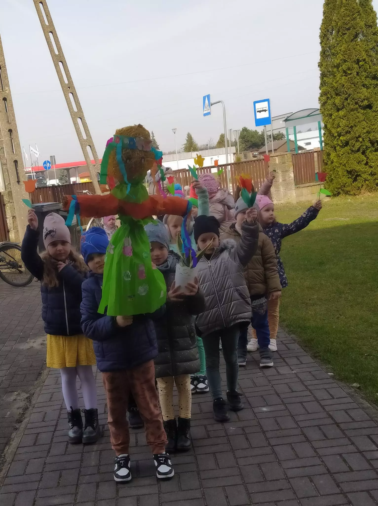 Tego dnia na boisku szkolnym dzieci pożegnały Marzannę-wykonaną przez przedszkolaki: