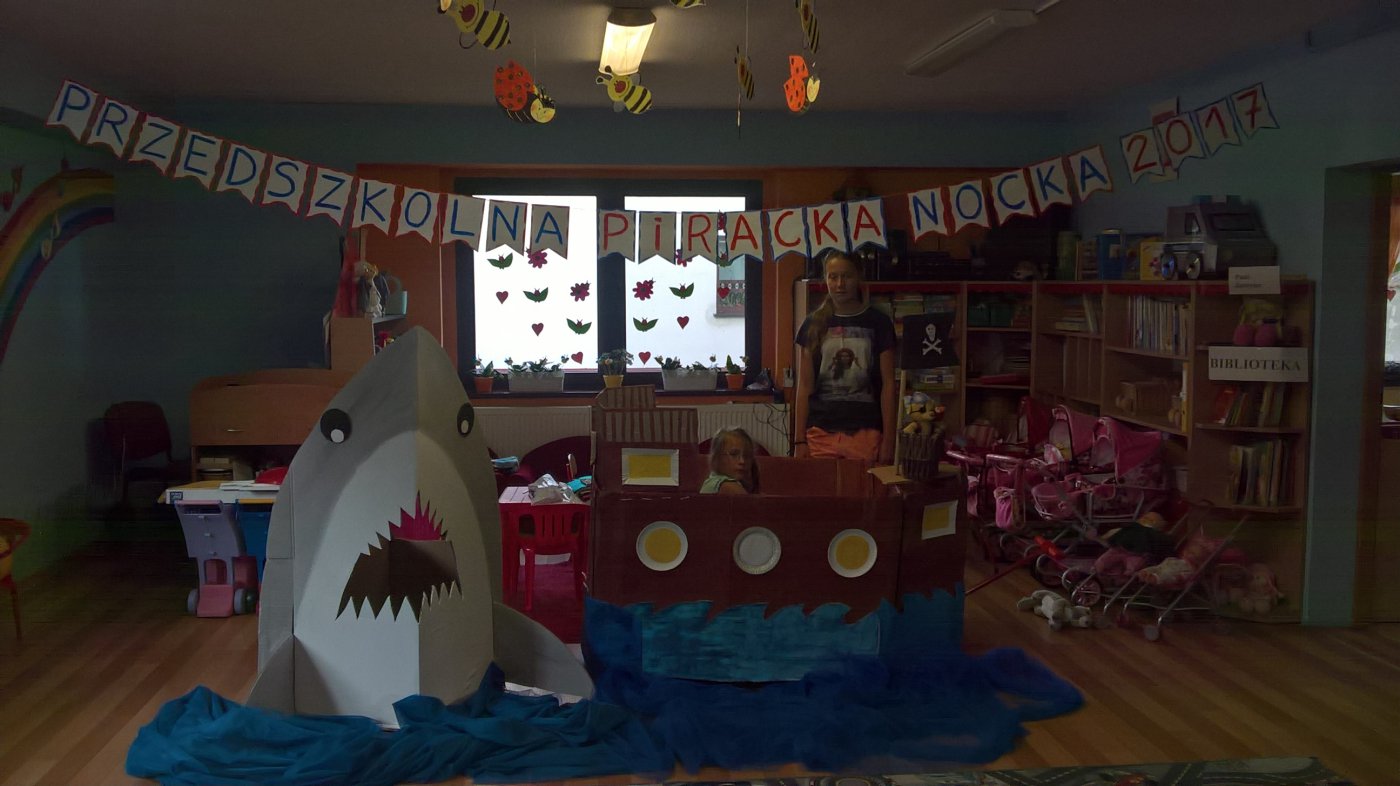 Na początku wakacji siedmioro starszaków uczestniczyło w Pirackiej Nocce Przedszkolnej, przygotowanej przez Panią Dyrektor i personel Przedszkola, rodziców oraz panią bibliotekarkę. Do wspólnej zabawy dołączyła także pani Katarzyna Koza z LCSK w Lisowicach. Po ognisku , oczywiście z pieczonymi kiełbaskami, dzieci oglądały bajkę. Jak na małych piratów przystało wszyscy udali się na ryby, tym razem były to literackie rybki zagadki, z którymi dzieci sobie doskonale poradziły. Doskonała zabawa trwała do późnych godzin i zapewne zostanie dzieciom w pamięci na długo.