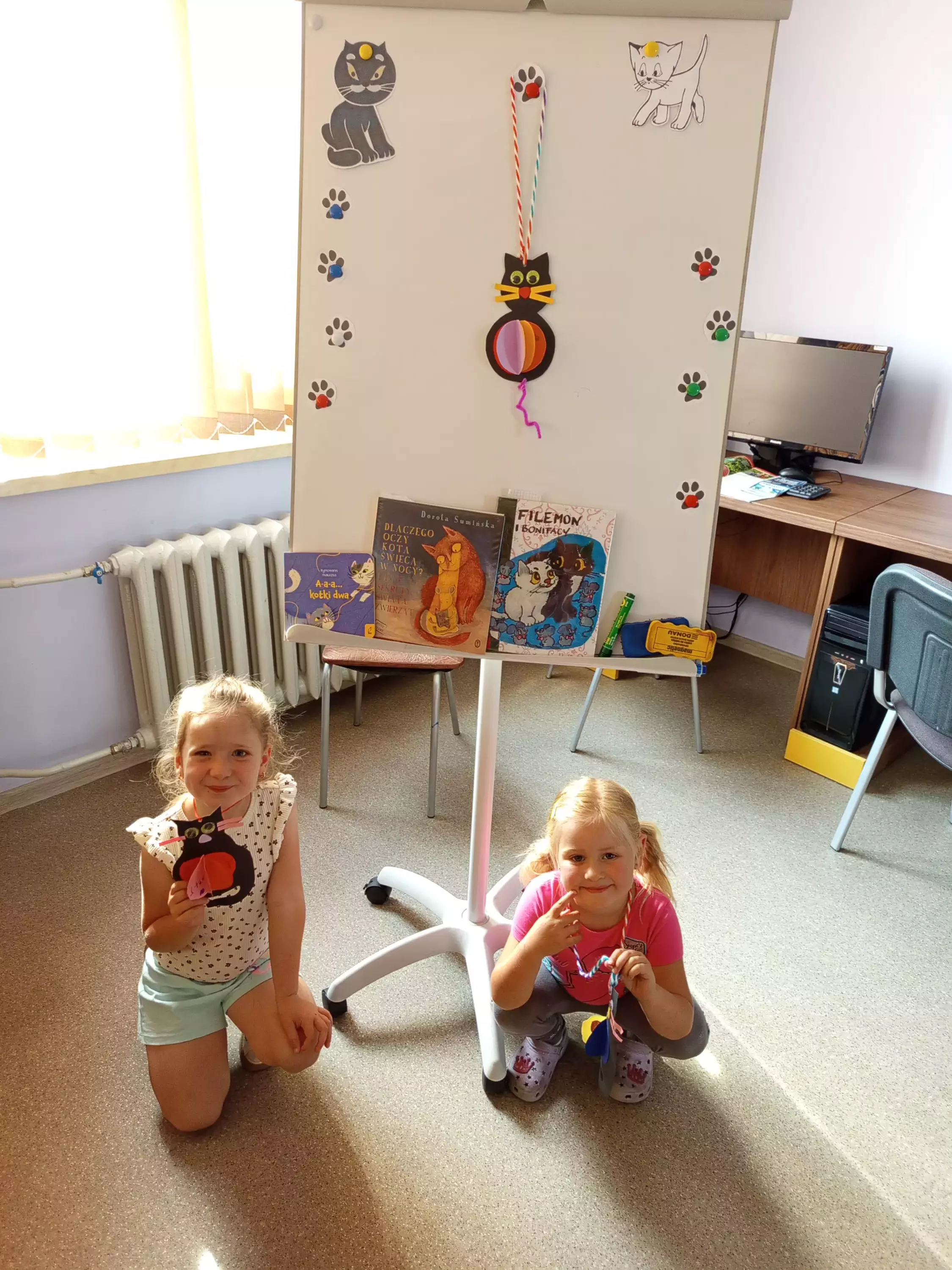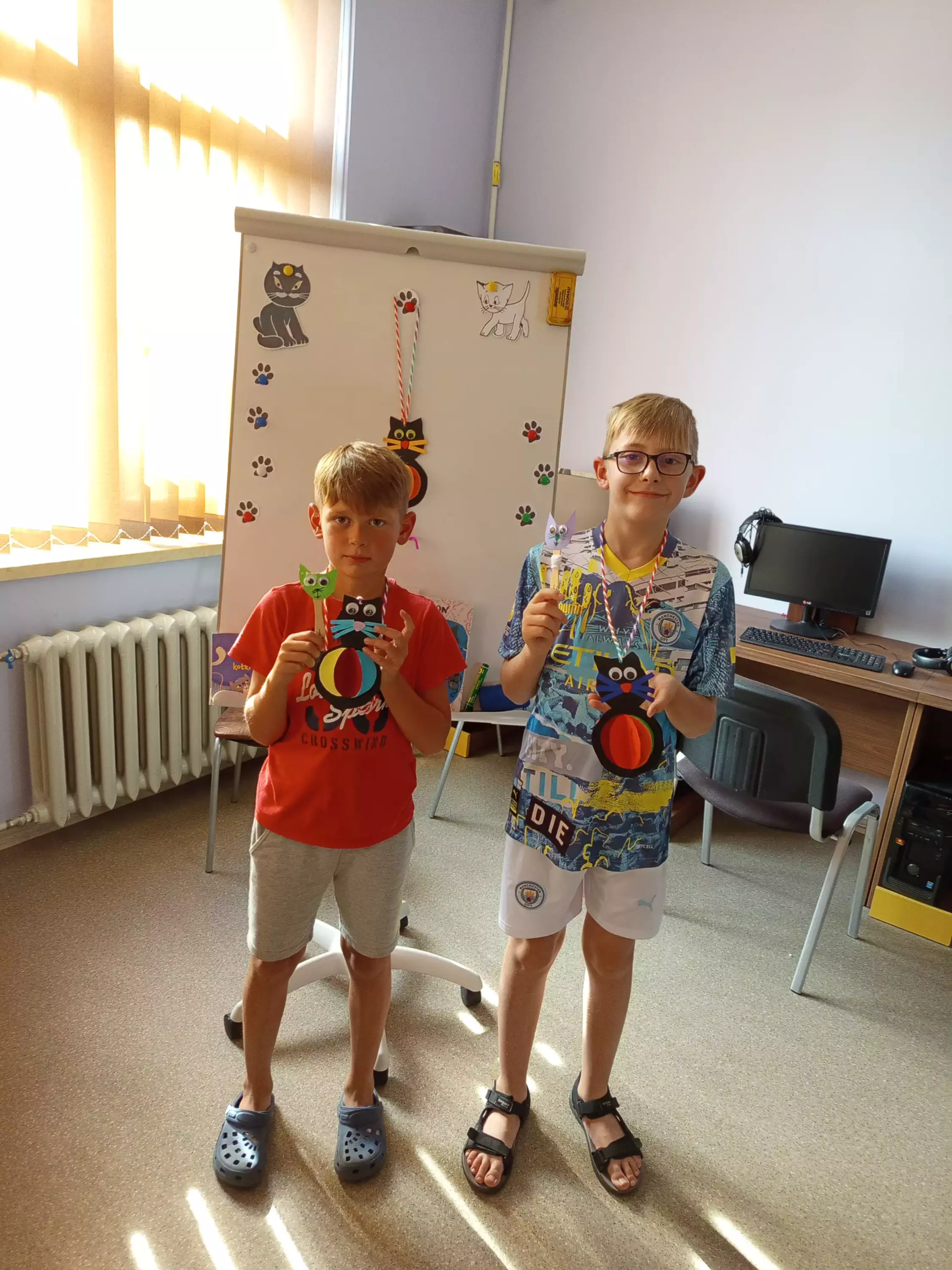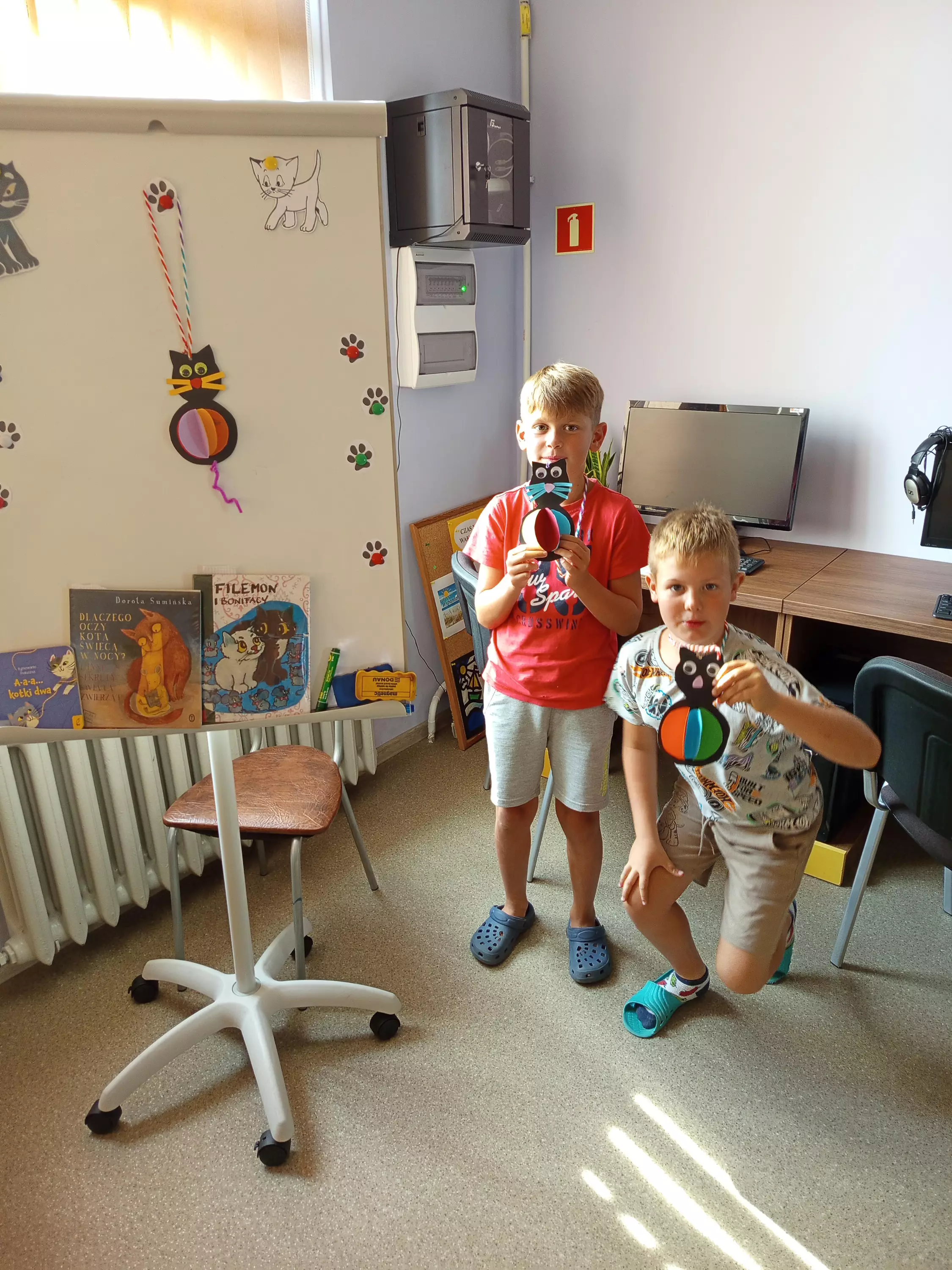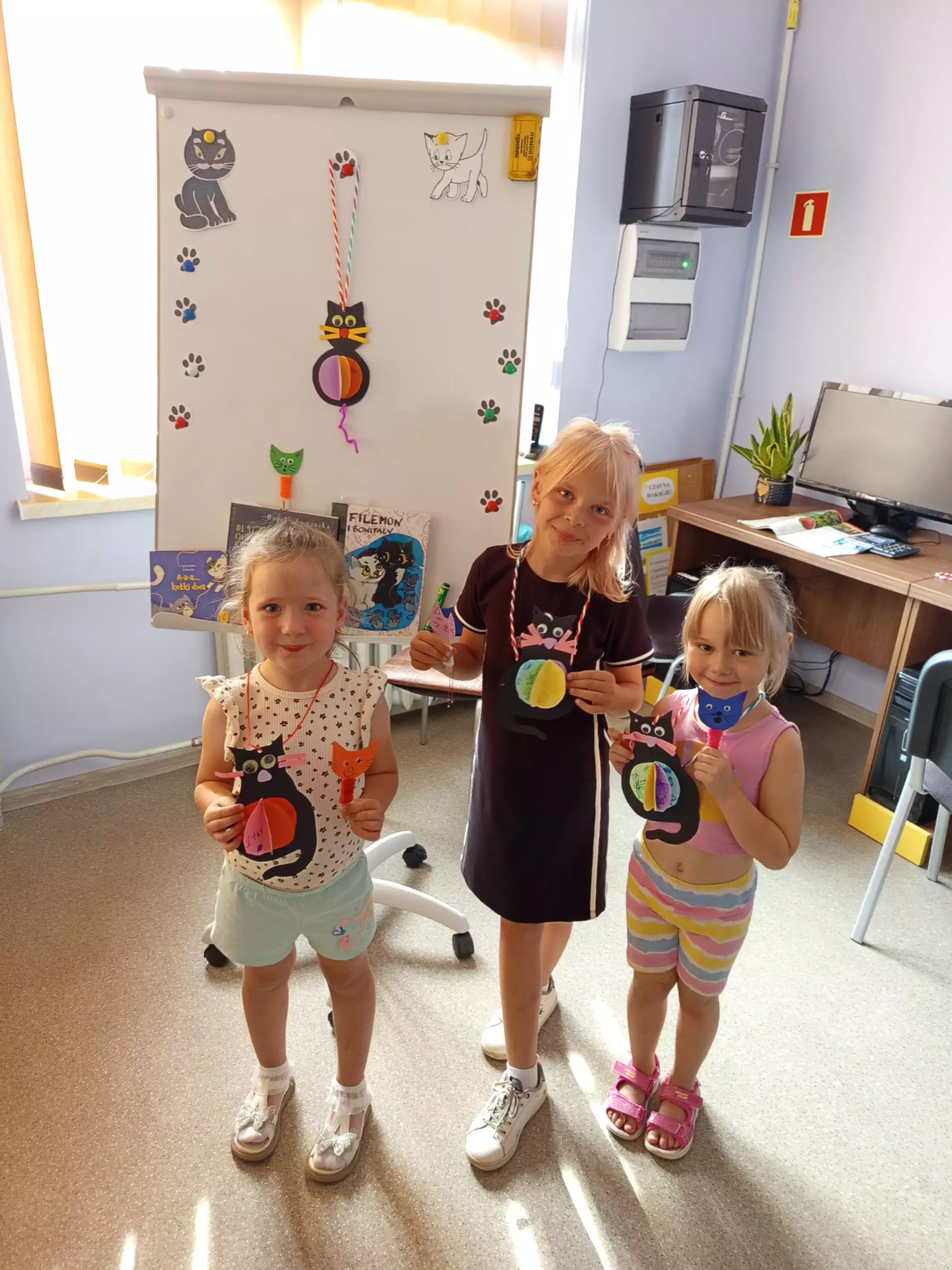 W ostatnim tygodniu wakacji odbyły się również zajęcia literacko-plastyczne dla dzieci, których tematem przewodnim były koty. Uczestnicy poznawali ciekawostki o tych zwierzętach, dzielili się swoimi doświadczeniami i opowieściami o kocich przyjaciołach oraz rozmawiali o ulubionych kocich bohaterach z bajek i filmów. Na zakończenie każdy przygotował własne koty-zawieszki oraz koty-kukiełki na patyczku.