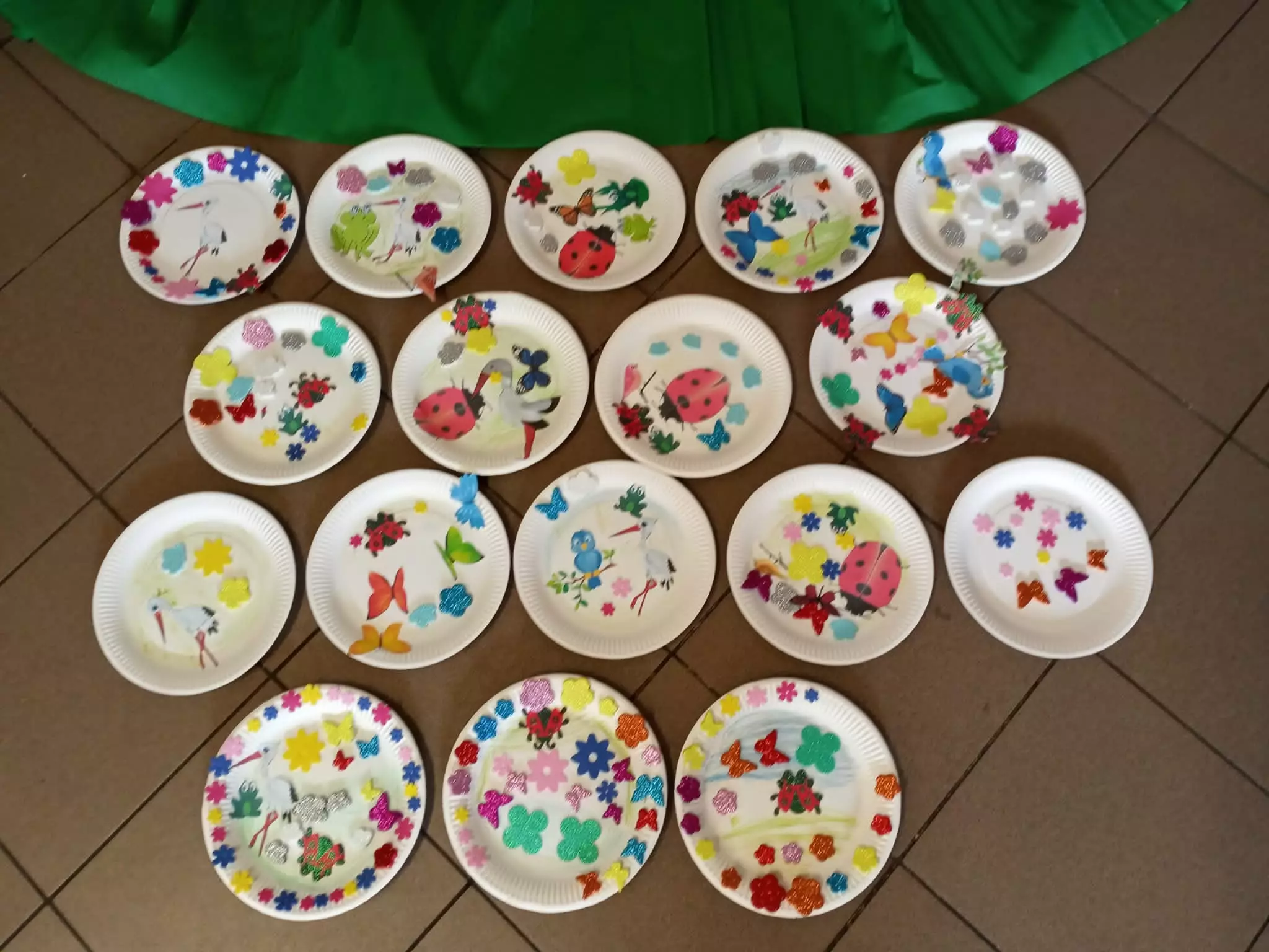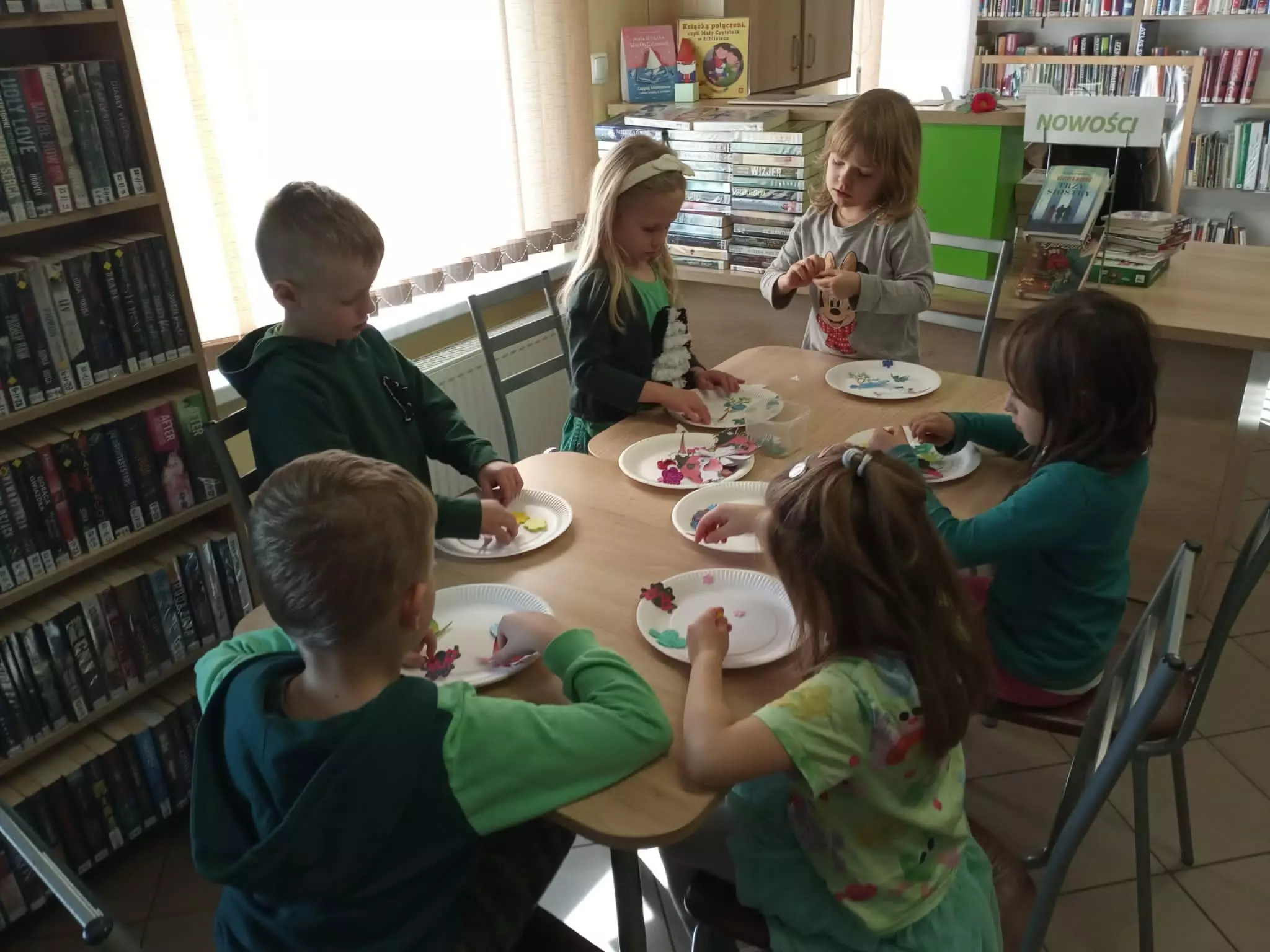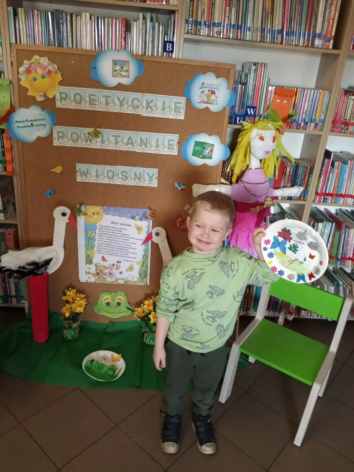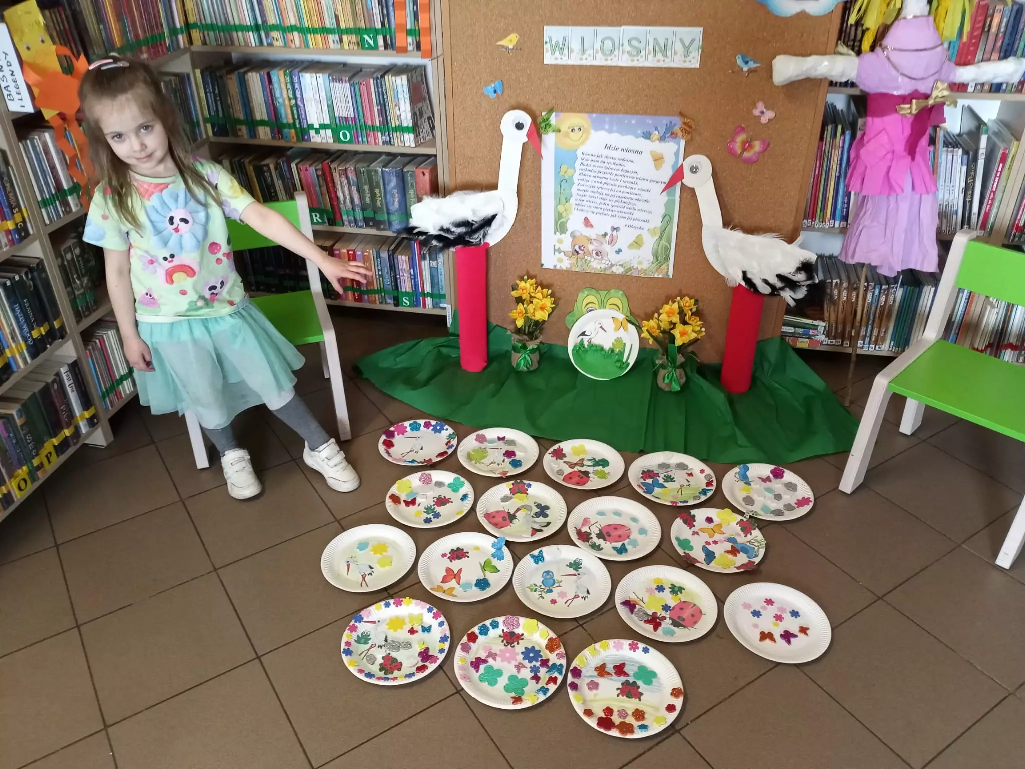 Wiosenne prace plastyczne (wiosna na talerzyku) wykonane przez przedszkolakiDwie dziewczynki przeglądają książeczki z wierszamiGrupa dzieci tworzy wiosenną łąkę na talerzykuGrupa dzieci poazuje do zdjęcia przed biblioteką w KośmidrachChłopczyk prezentuje swój wiosenny twalerzykPani z biblioteki pomaga dzieciom w pracy plastycznejDwie dziewczynki przedstawiają swoje wiosenne talerzyki na tle dekoracji związanej z poetyckim powitaniem wiosnyPani z biblioteki czyta przedszkolakom wierszeDziewczynka prezentuje wszystkie wiosenne twalerzykiPrzedszkolaki grają w grę