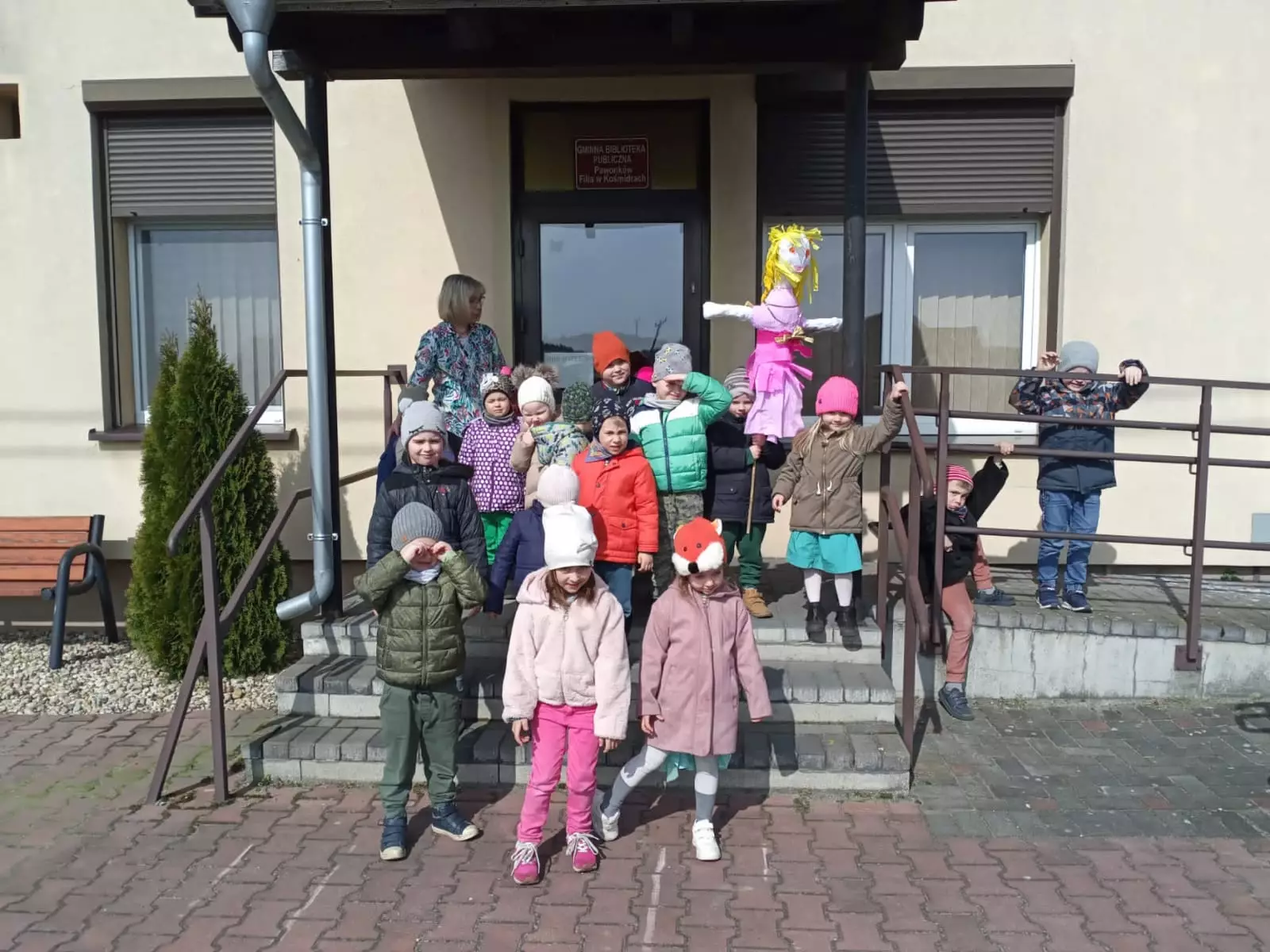Pani Bibliotekarka wraz z przedszkolakami wybierają się na spacer z marzanną